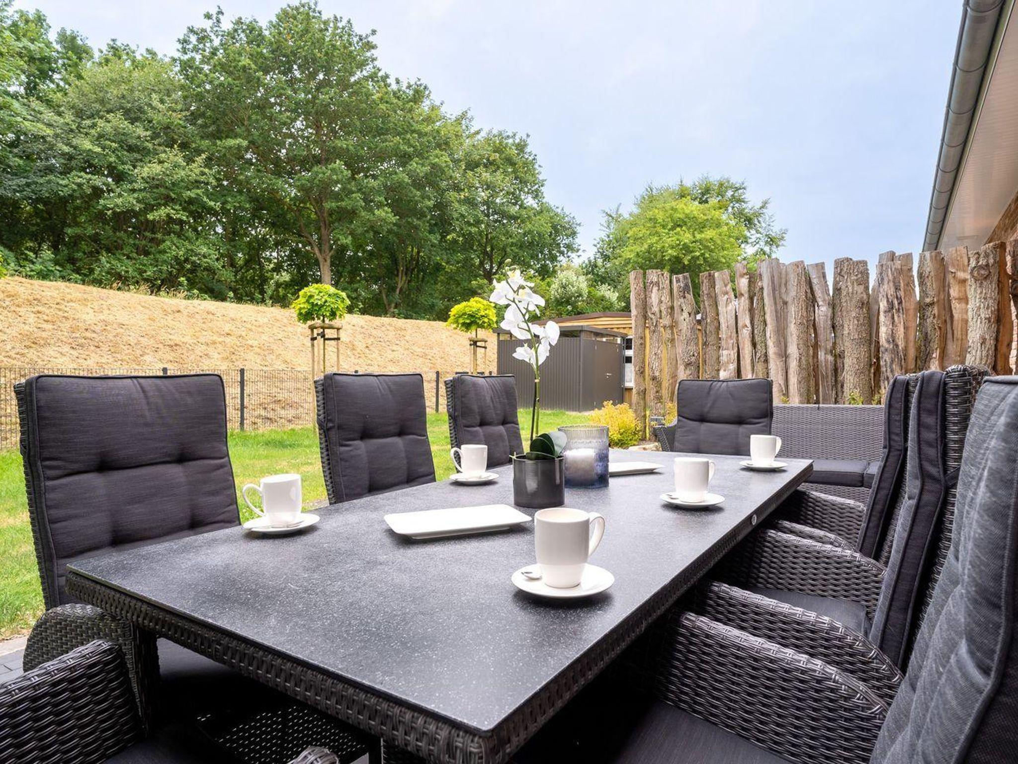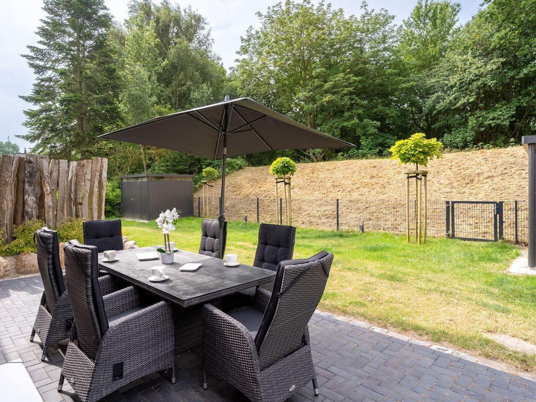 Von dort erreichen Sie die südwestlich ausgerichtete und mit Stühlen, großem Tisch und Lounge Garnitur ausgestattete, mit edlem schwarzen Klinker gepflasterte Terrasse.