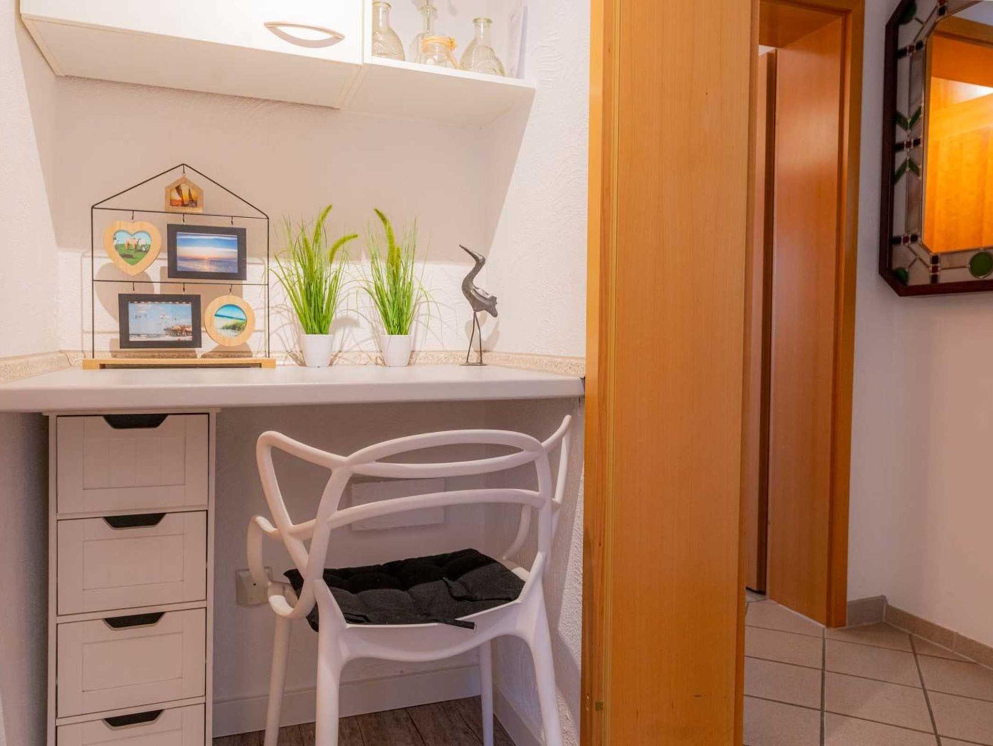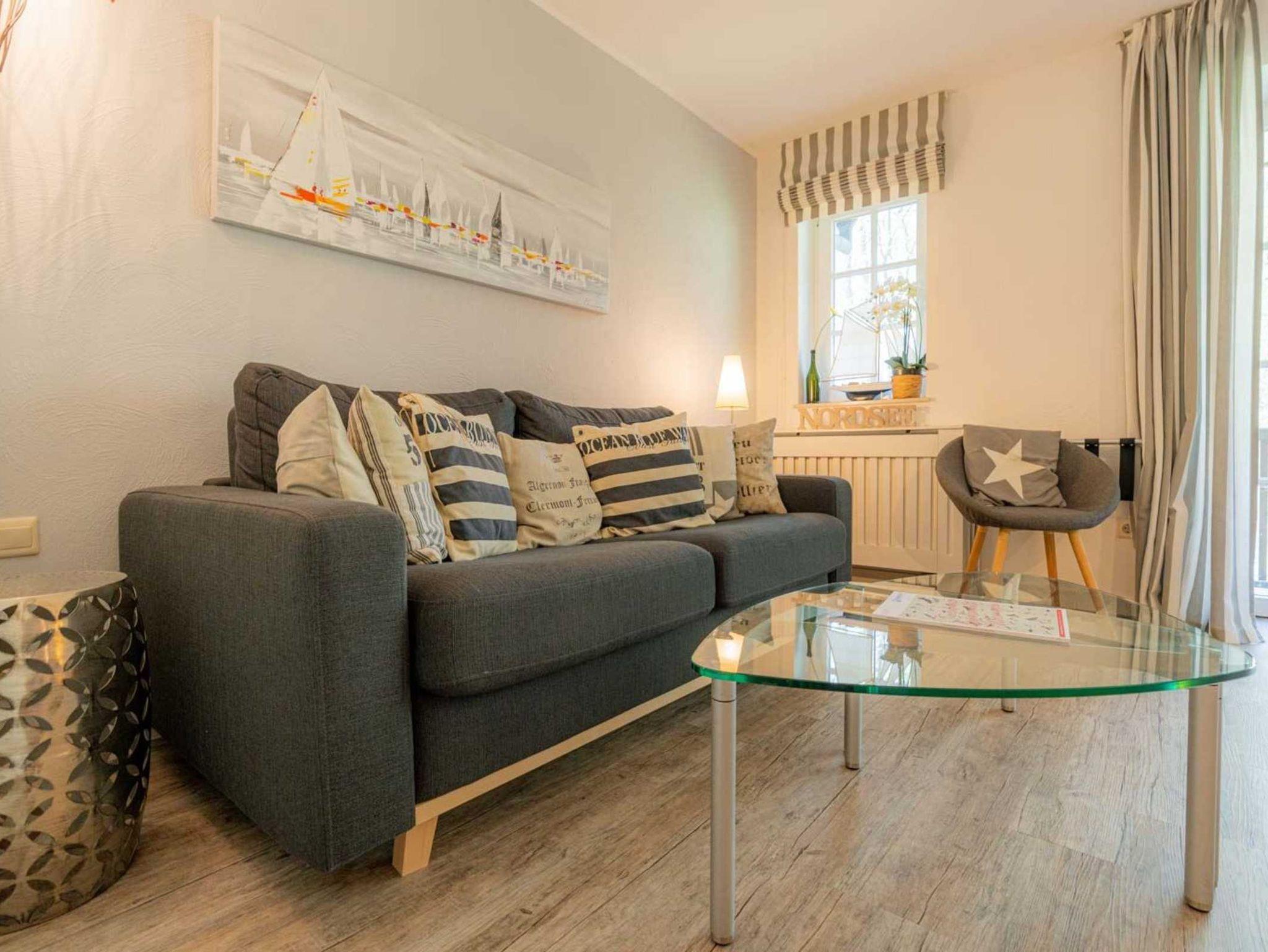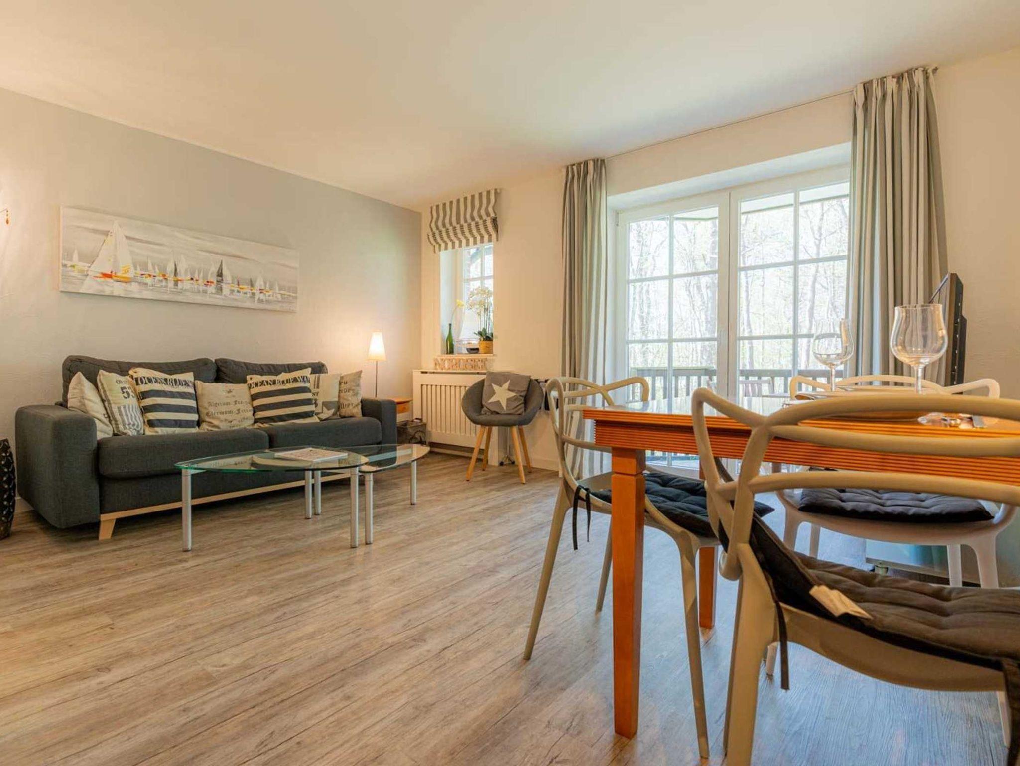 Wohnzimmer mit ausklappbarem (Schlaf-) Sofa (140x190cm), Sessel, großem TV (Kabel), Sony Playstation 3, Bluetooth-Lautsprecher von Marshall, Kleiderschrank und Esstisch mit 3 Stühlen. Direkter Zugang zum möblierten Balkon nach Südwesten mit Ausblick auf das Kurwäldchen. Halboffene Küche mit Herd mit 2 Ceran-Kochstellen, Mikrowelle mit Grillfunktion, Geschirrspüler, Kühlschrank (ohne Gefrierfach) und DeLonghi Nespresso Kapsel-Kaffeemaschine.