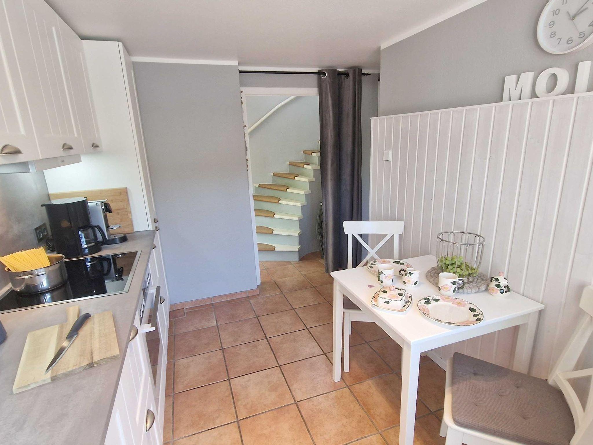 Ruhiges auf rückwärtigen Grundstück gelegenes Ferienhaus Böhler Bude mit 3 Zimmern und ca. 68 qm auf 2 Ebenen für bis zu 4 Personen und 2 Hunden. Wohnzimmer mit Sofa, bequemem Sessel, gemütlichem Kaminofen, SMART-TV, DVD-Player, Esstisch mit 4 Stühlen und direktem Zugang zur möblierten, windgeschützten Terrasse nach Osten mit elektrischer Sonnenmarkise, Gartenmöbeln und Strandkorb. Separate Küche mit Backofen, Mikrowelle, Geschirrspüler, Kühlschrank mit Gefrierfach, Kapsel-Kaffeemaschine und Frühstückstisch mit 2 Stühlen. 1. Schlafzimmer mit Doppelbett, Einbauschrank, Kommode, Spiegel und Stuhl. 2. Schlafzimmer mit Doppelbett, Kommode, Spiegel und Stuhl. Badezimmer mit Dusche, WC, Handtuchwärmer, Föhn und Tageslicht. Flur mit Garderobe und Abstellraum mit Staubsauger im Erdgeschoss, Pkw-Stellplatz am Haus sowie ein abschliessbarer Gemeinschaftsfahrradraum sind vorhanden. Kostenloses WLAN. Es sind bis zu 2 Haustiere gestattet, welche kostenpflichtig angemeldet werden müssen.