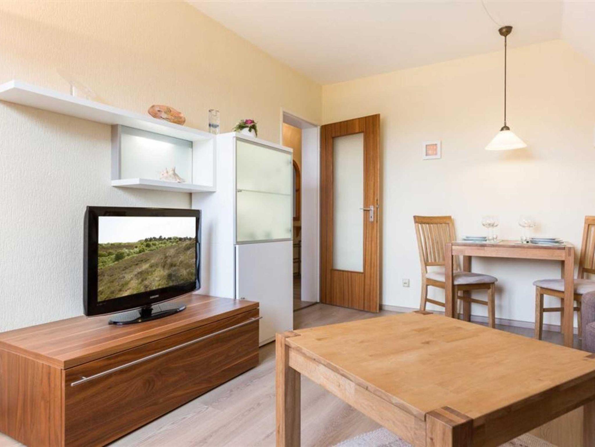Wohnzimmer mit Sofa (2er), Sessel, TV (Sat) und kleinem Esstisch mit 2 Stühlen.