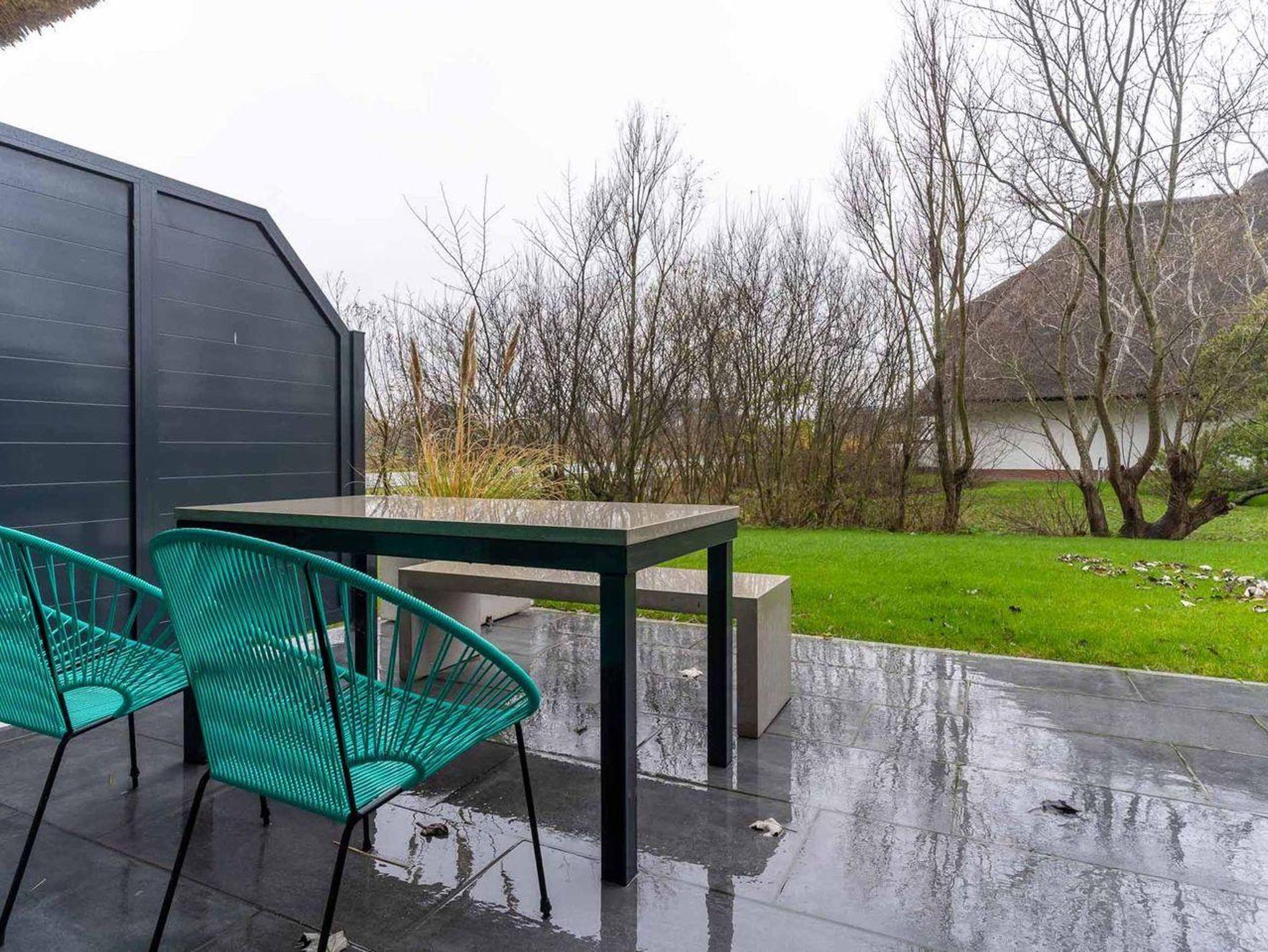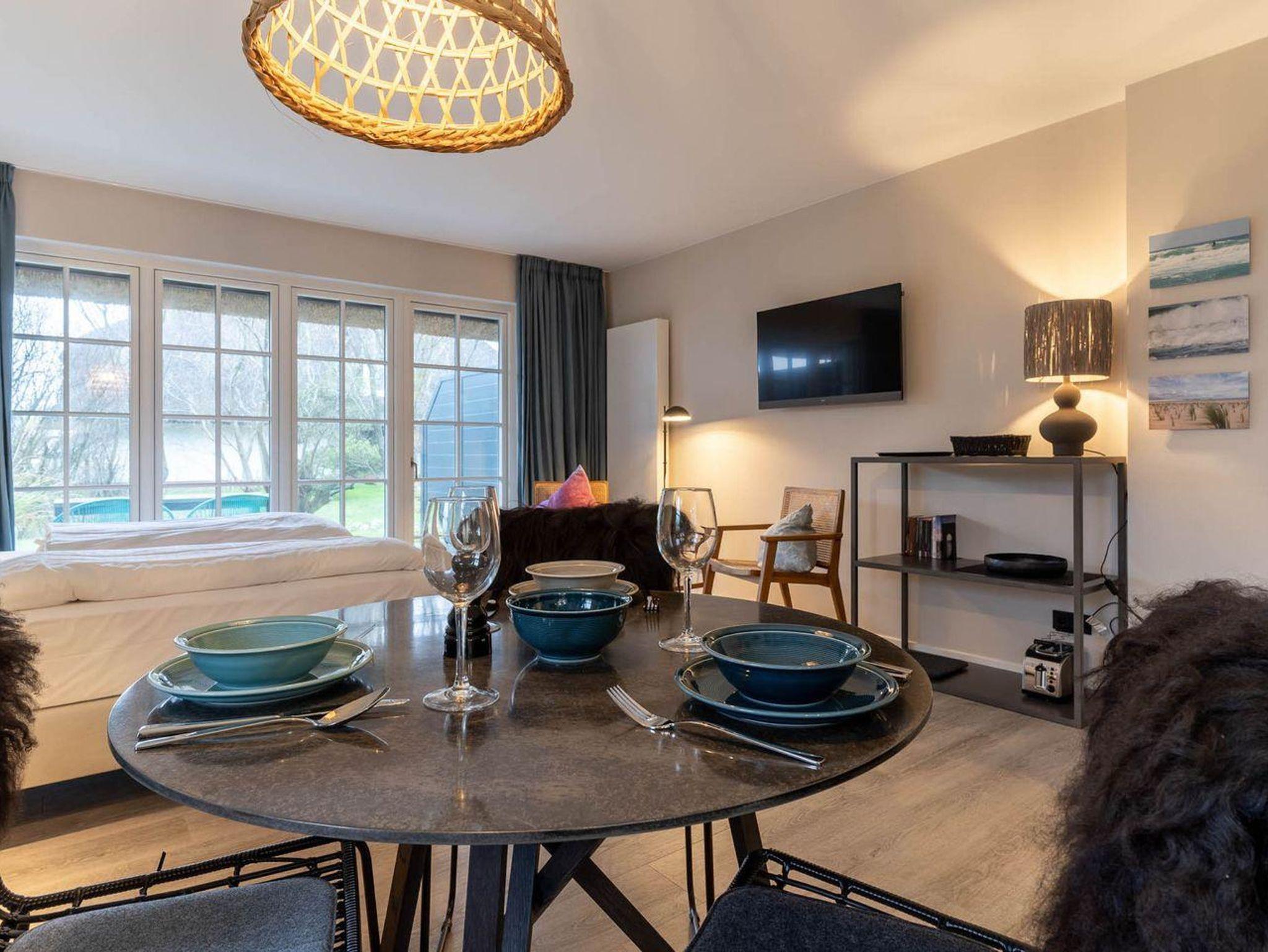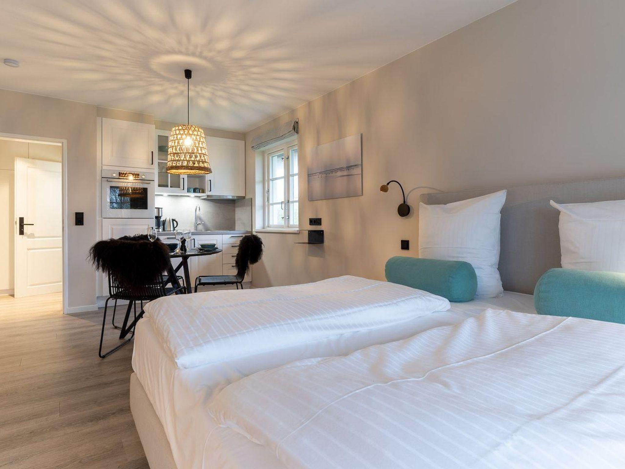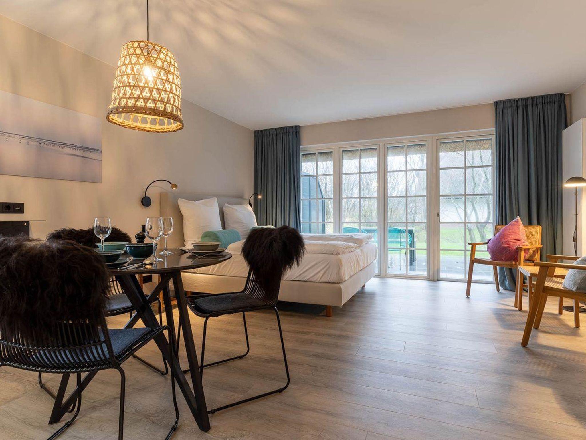 Der lichtdurchflutete Wohnraum mit einer offenen Wohnküche und einem gemütlichen Essbereich bietet jeden Komfort. Eine Kochnische mit einer umfangreich ausgestatteten Pantryküche fügt sich passend ein und hat mit einem 2-Felder-Ceranfeld, Spülmaschine, Espressokocher, Kühlschrank samt Gefriermöglichkeit usw. so einiges zu bieten. Am Esstisch oder auf der möblierten, eigenen Süd-West Terrasse, lässt es sich mit frischen Brötchen vom nahegelegenen Bäcker wunderbar in den Urlaubstag starten. Der Blick in die gepflegte Grünanlage und auf das reetgedeckte Haus sind einfach herrlich und locken nach draußen. Am Abend erholen Sie sich im gemütlichen Doppelbett (180x200cm). Das moderne Bad mit Fenster verfügt über eine bodentiefe Regendusche, Handtuchheizung, Waschbecken und WC.