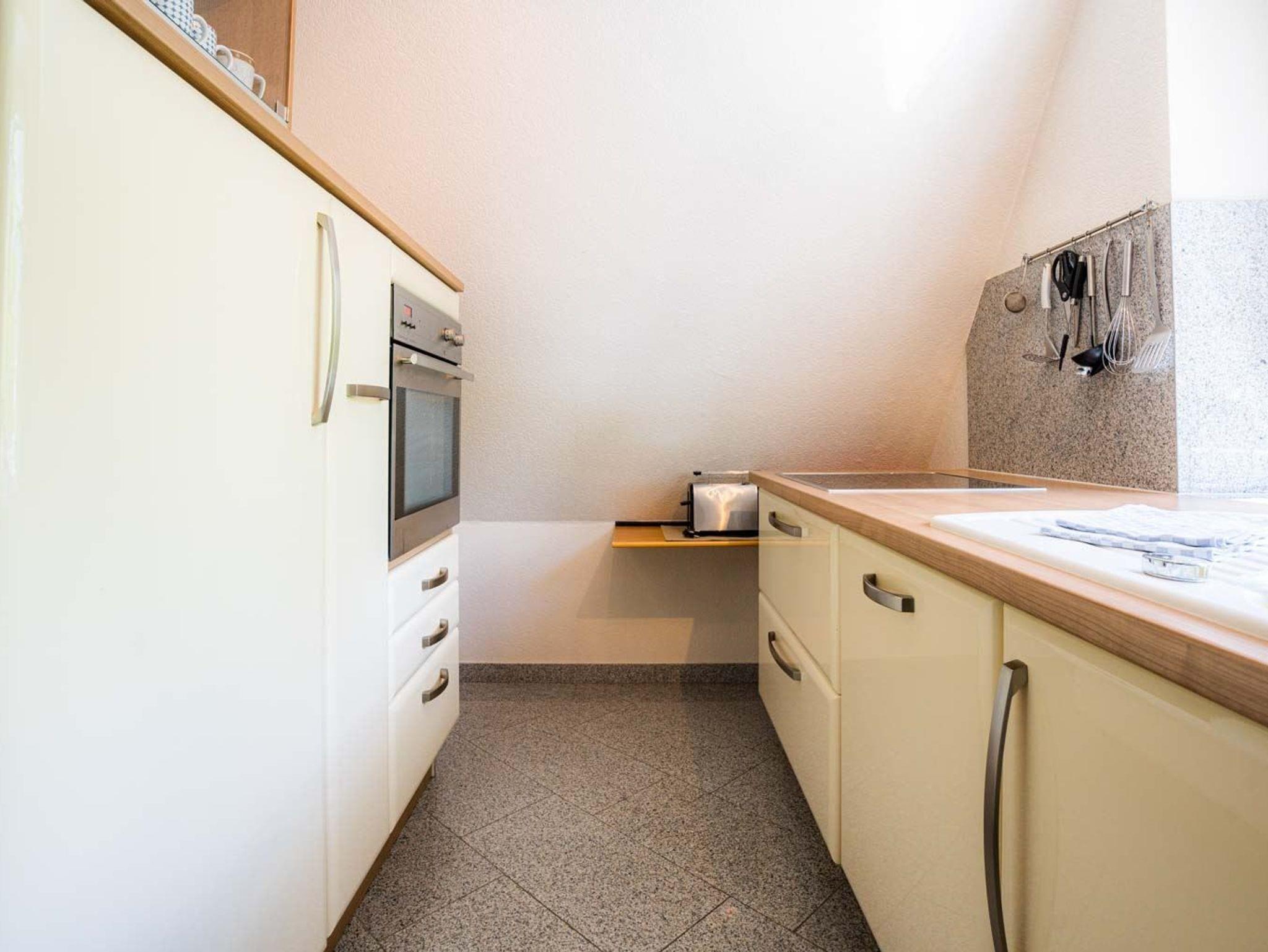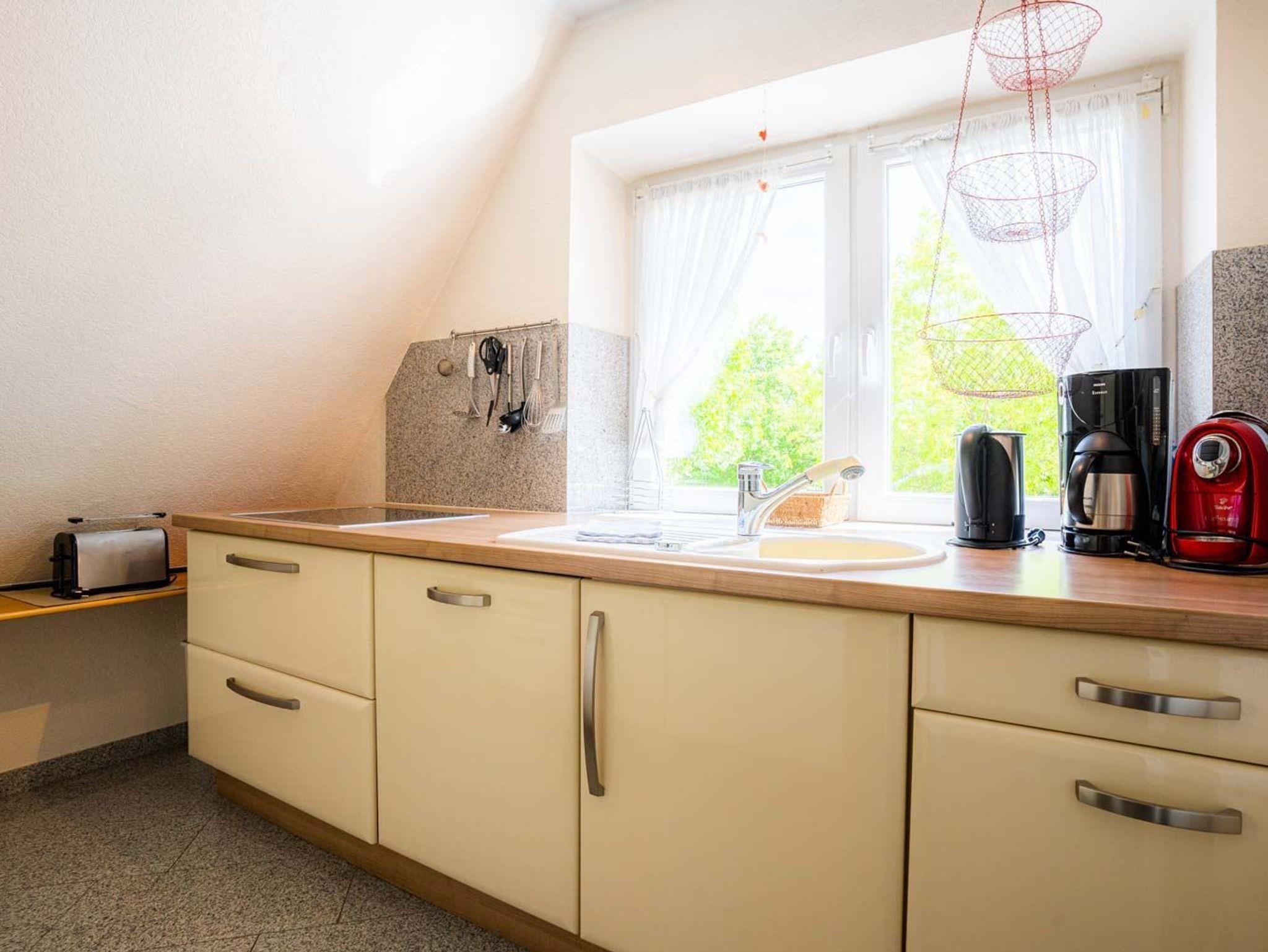 Separate Küche mit allem Komfort: Backofen auf Arbeitshöhe, Mikrowelle, Geschirrspüler, Kühlschrank mit Gefrierfach und Tchibo Caffissimo Kapsel-Kaffeemaschine. Abstellkammer mit Bügelset.