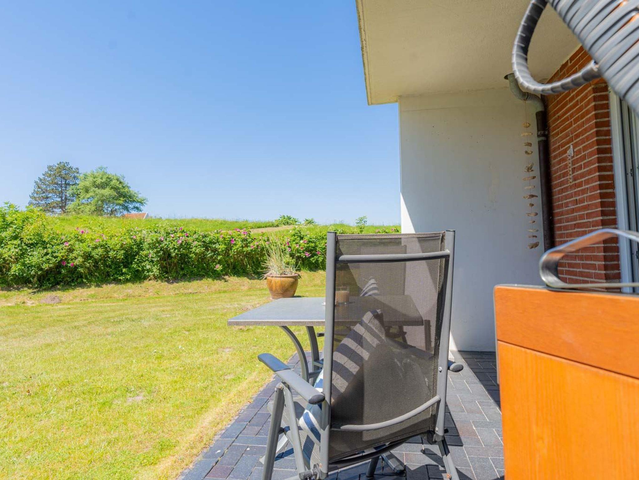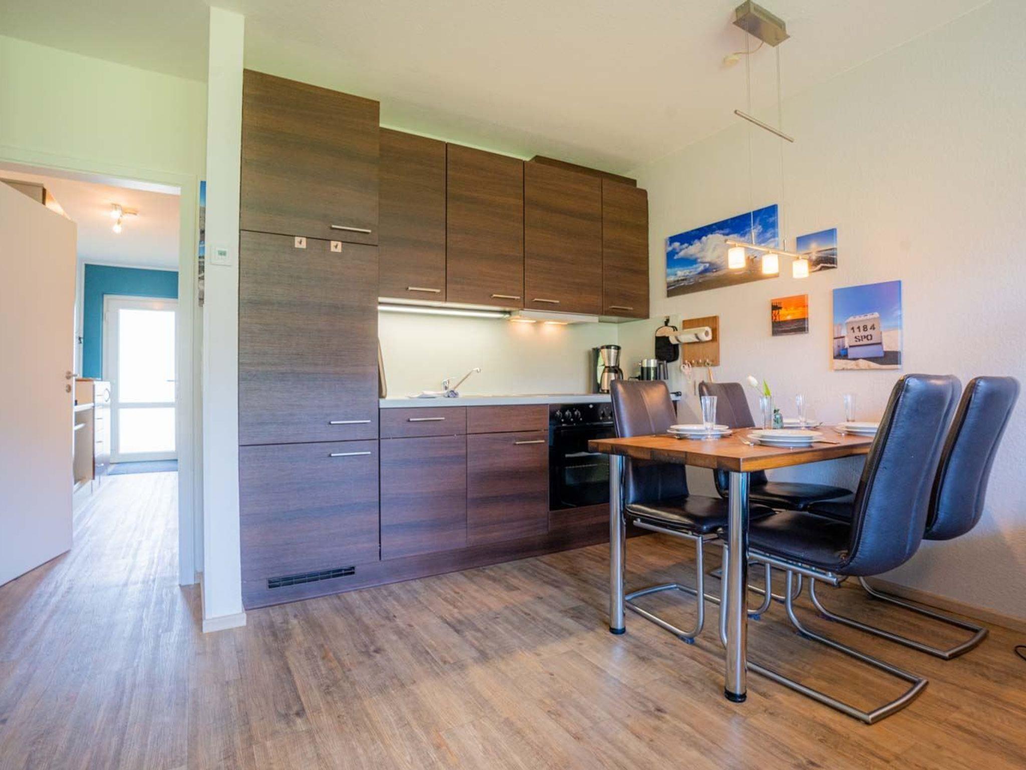 Freundlich eingerichtetes Wohnzimmer mit ausklappbarem Schrank-Bett (160x190cm), Sofa (3er), 1 Sessel mit Hocker, TV (Sat), Radio und Esstisch mit 4 Stühlen. Direkter Zugang zur möblierten Garten-Terrasse nach Südwesten mit Strandkorb. Moderne offene Küche mit Backofen, Kühlschrank mit Gefrierfach und Geschirrspüler.