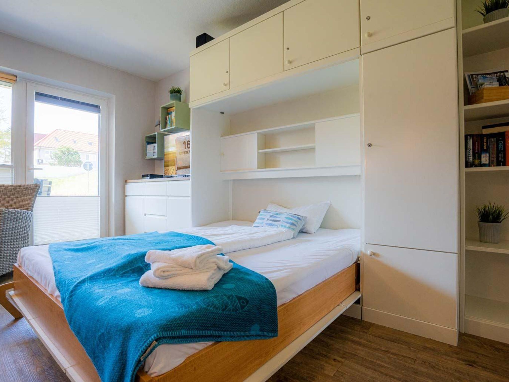 Schlafzimmer mit Doppelbett (2x 80x200cm) und Kleiderschrank.