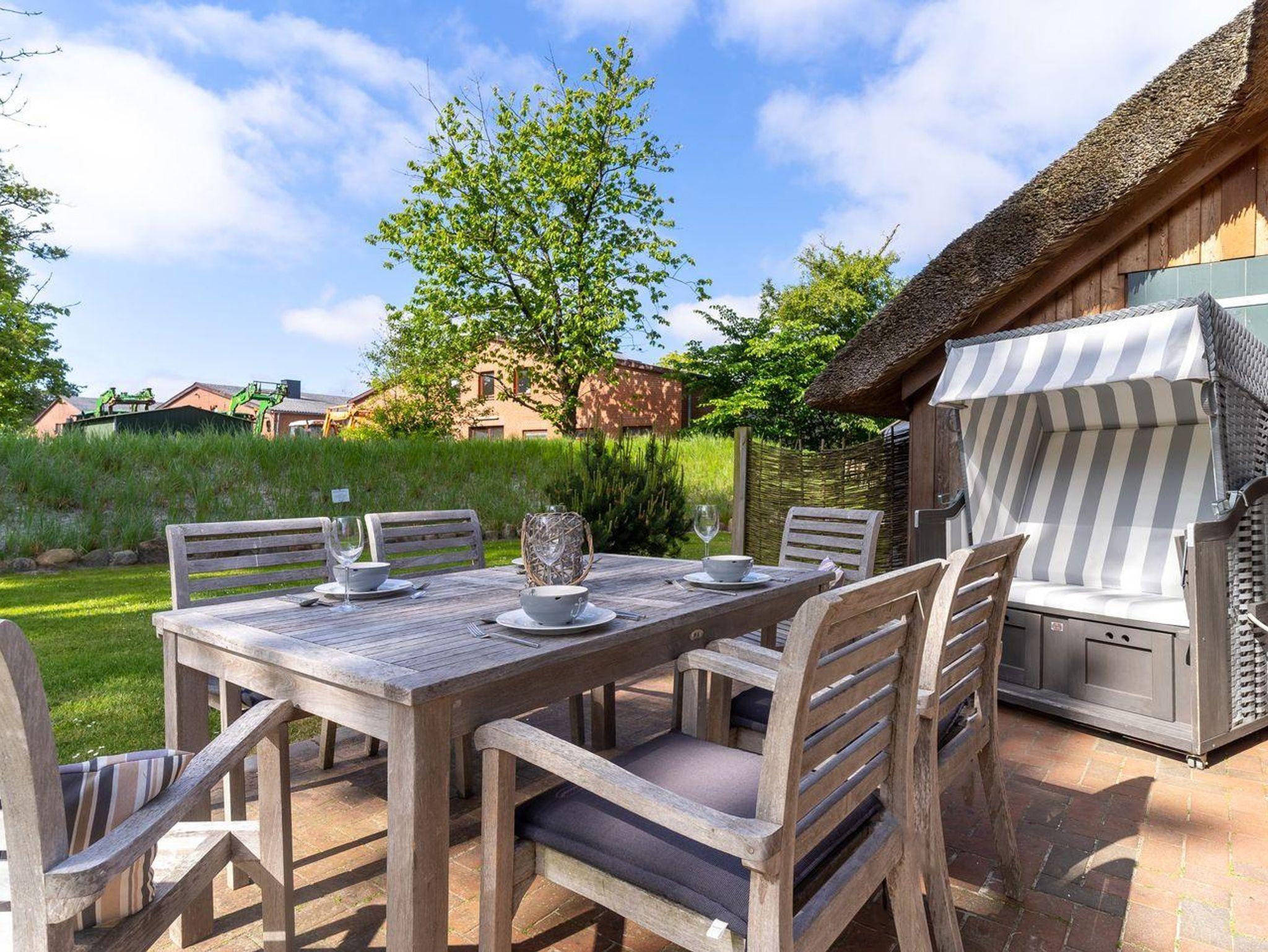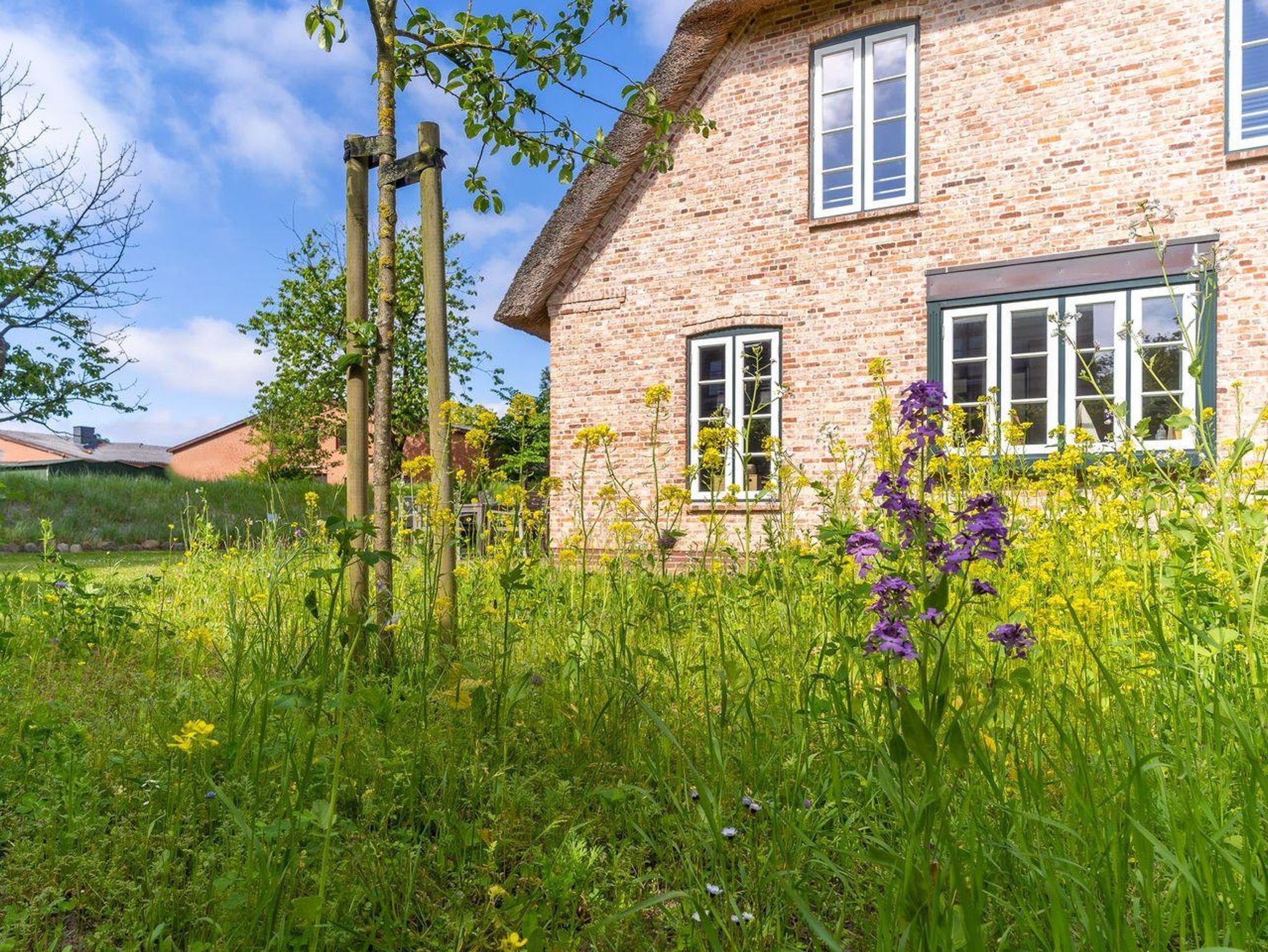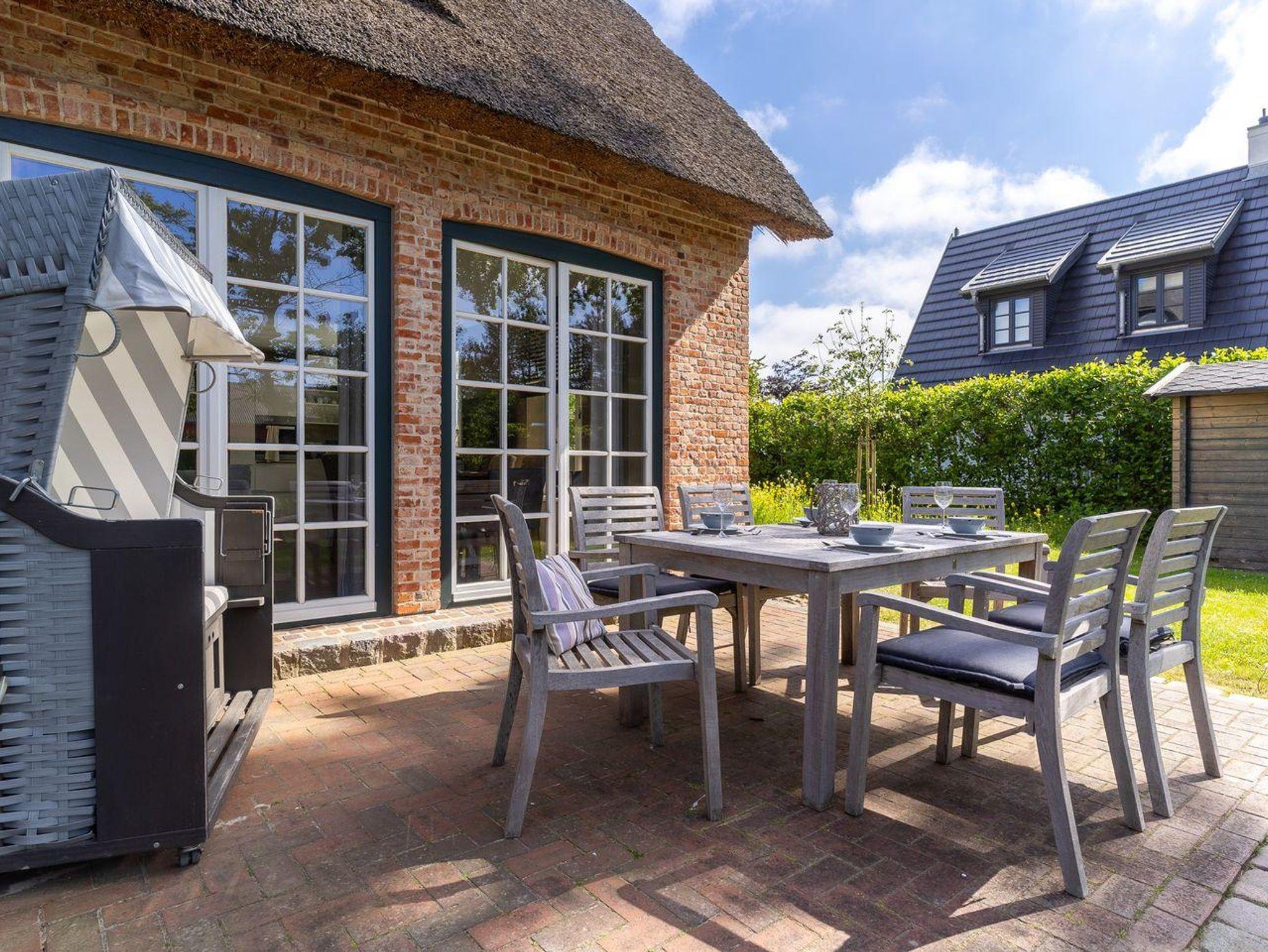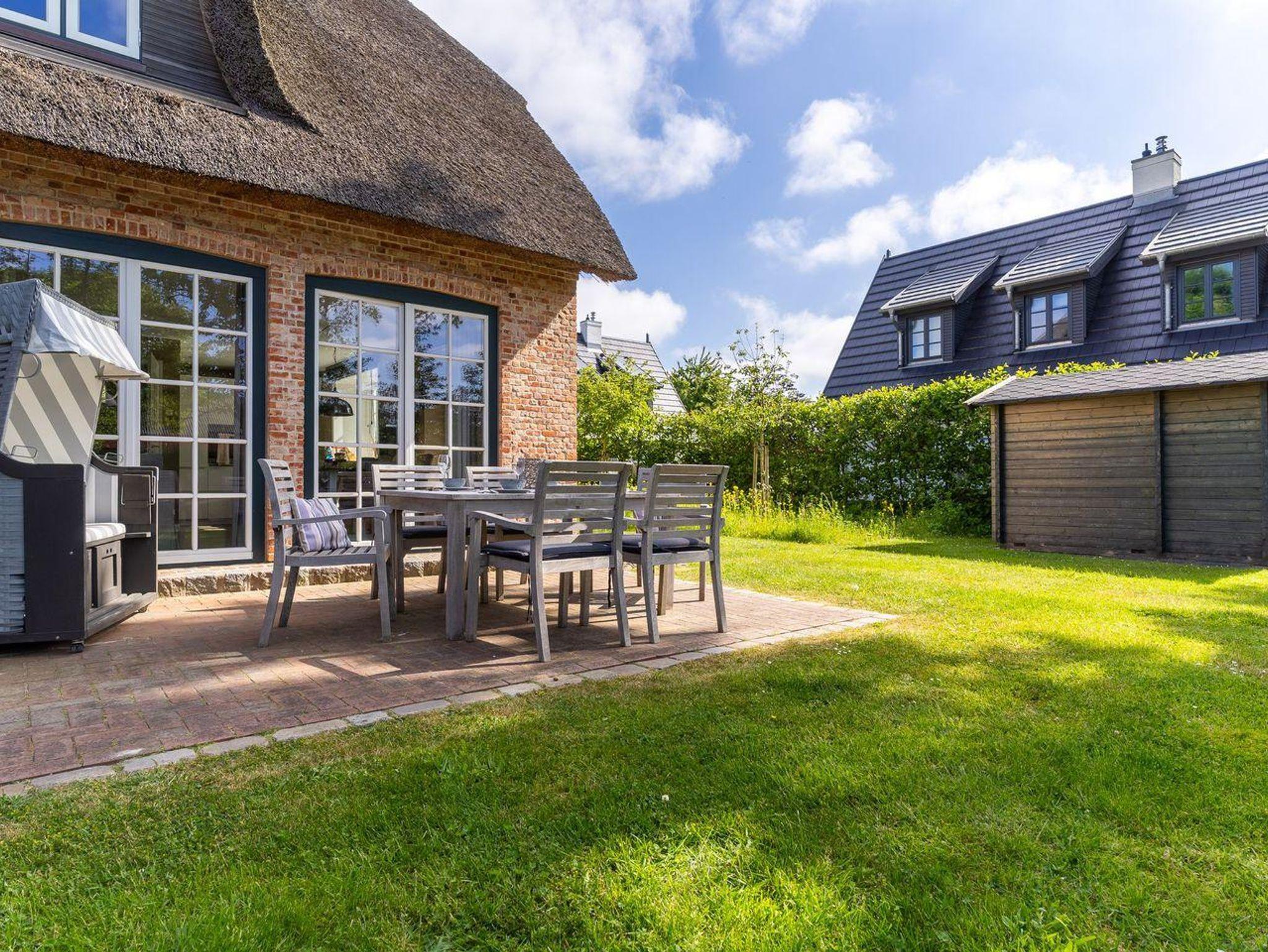 Die luxuriöse Haushälfte unter Reet verfügt über ca. 108 m² Wohnfläche und bietet Platz für 6 Personen. Im Erdgeschoss befindet sich der lichtdurchflutete Wohnraum mit TV, Kamin, einer offenen Küche sowie einem stilvollen Essbereich. Die Wohnräume sind mit exklusiven Möbeln von Riviera Maison ausgestattet. Die Küche verfügt über hochwertige Elektrogeräte. An den Wohnbereich schließen sich ein Flur mit eingebauter Garderobe, ein Hauswirtschaftsraum und ein Duschbad an. Das gesamte Erdgeschoss verfügt über geschmackvolle Fußbodenfliesen, die über eine Fußbodenheizung (Erdwärme) beheizt werden können. Über eine Holztreppe gelangt man in das mit Parkett ausgelegte Obergeschoss. Dieses verfügt ebenfalls über eine Fußbodenheizung. Die beiden Schlafzimmer, eines mit einem Boxspring-Doppelbett und eines mit 2 Boxspring-Einzelbetten, sind ebenfalls jeweils mit TV ausgestattet. Einbauschränke gewähren Ihnen hinreichend Ablageflächen. Darüber hinaus befindet sich im Obergeschoss ein weiteres, geräumiges Bad mit Dusche und Badewanne. Vom Obergeschoss führt die Holztreppe hinauf in das Dachgeschoss. Hier befindet sich ein zusätzliches Schlafzimmer mit 2 Boxspring-Einzelbetten, die zum Doppelbett zusammen geschoben werden können. Dieses wunderschöne Haus lässt keine Wünsche offen und bringt Sie sofort in Urlaubsstimmung. Das Grundstück mit Stellplatz, großer Rasenfläche und einer geschützten, sonnigen Terrasse ist mit heimischen Pflanzen und einer Düne angelegt. Aus einem Strandkorb können Sie den Blick auf das Haus oder die Düne genießen. Für zusätzliche Entspannung sorgt eine großzügige Gartensauna. Carpe Diem!