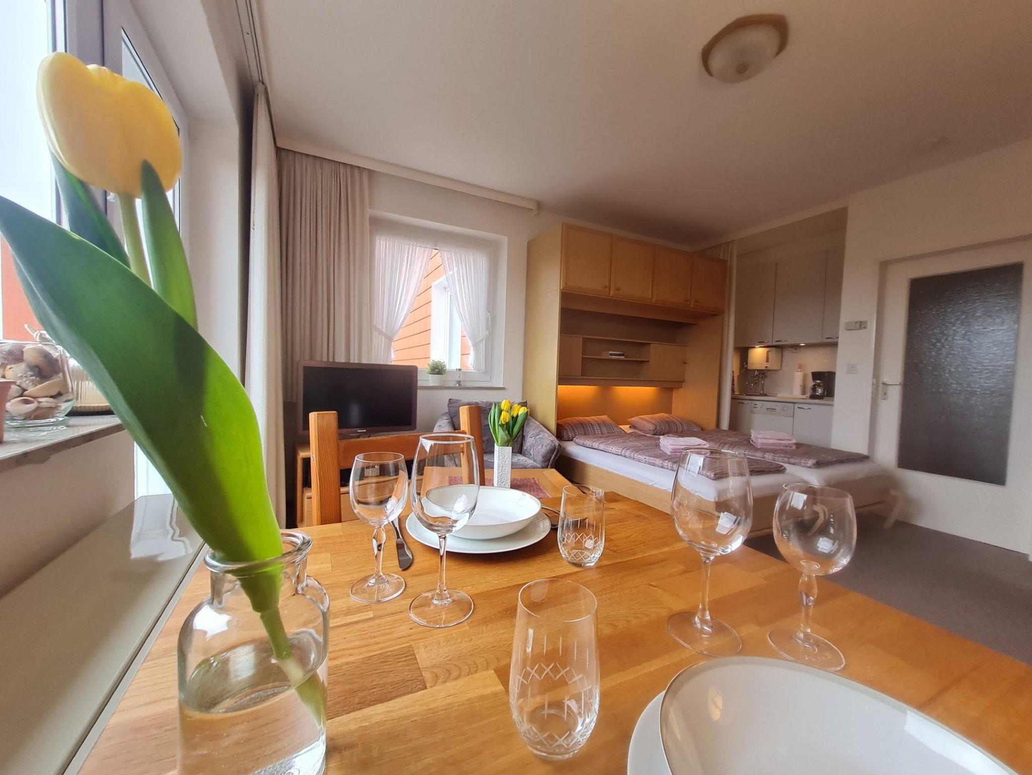 Kombinierter Wohn- Schlafbereich mit Schrankbett und Schlafsofa, Sitzgruppe, Essbereich, TV, Radio und CD-Player. Französischer Balkon. Offene Küche mit 2 Ceran Kochfeldern, Geschirrspüler und Kühlschrank mit Gefrierfach.