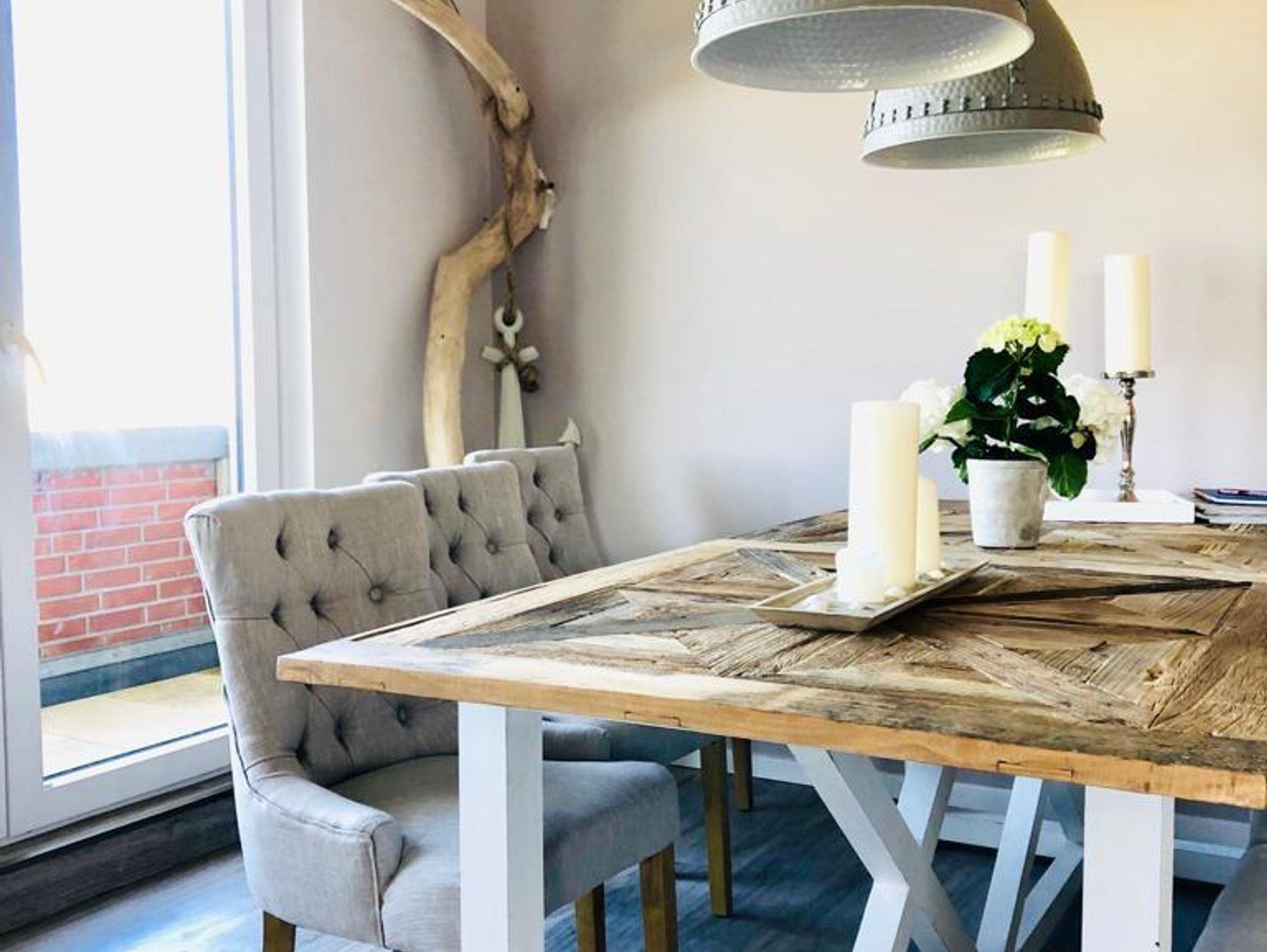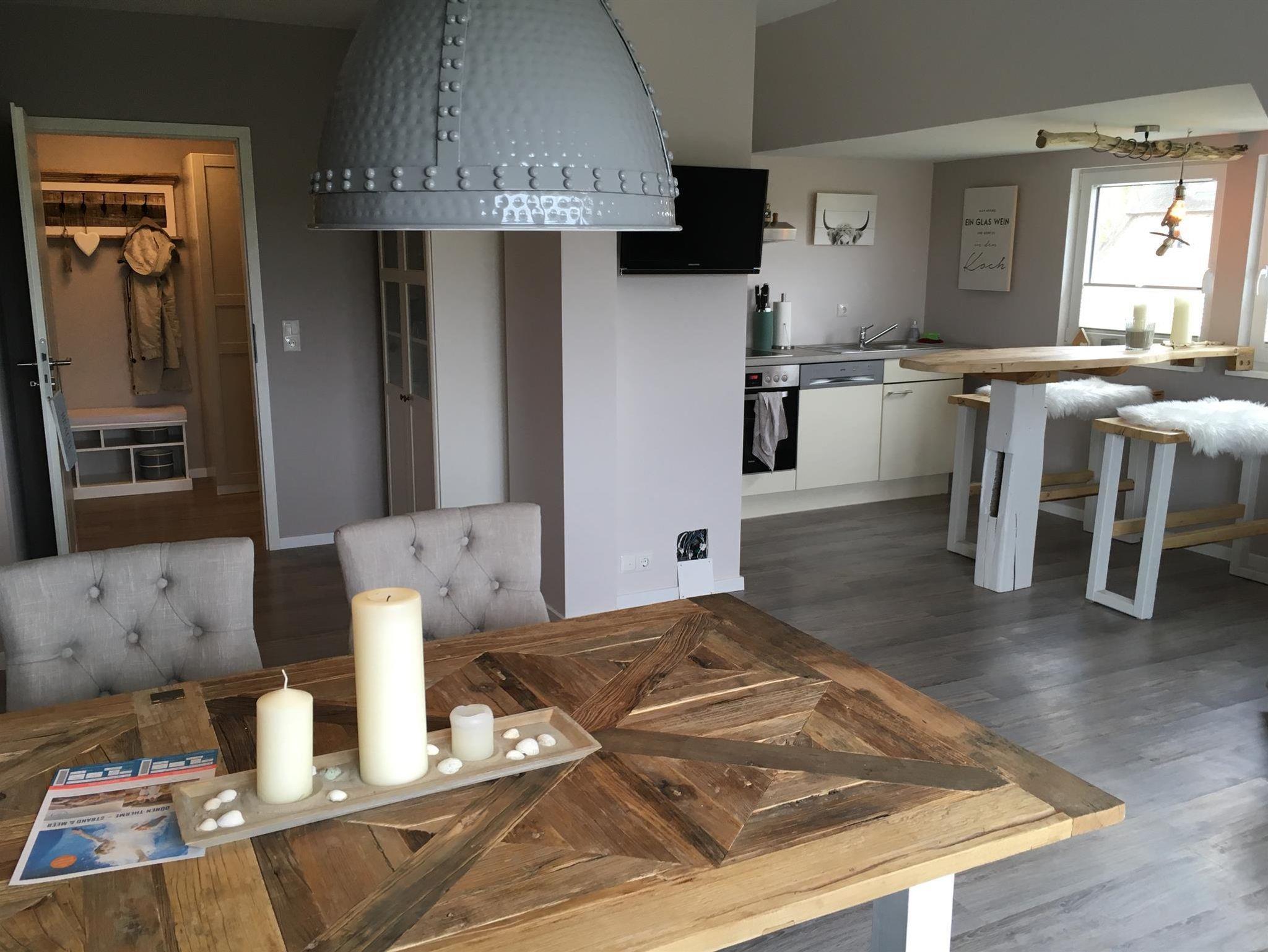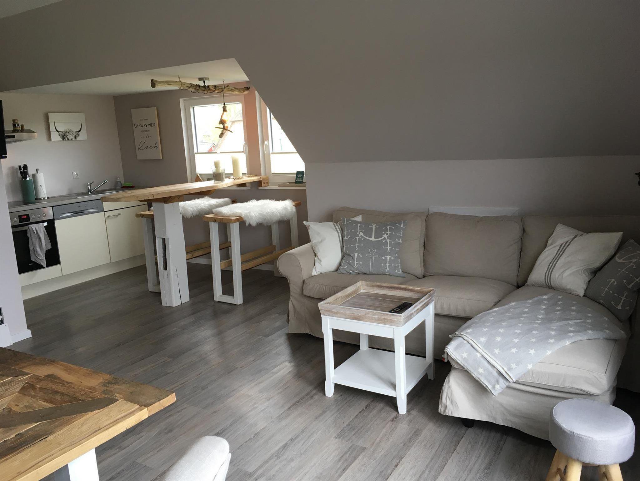 Wohn-/Esszimmer mit offener Küche (1. OG)• Gemütliche Eck-Couch mit Couchtisch