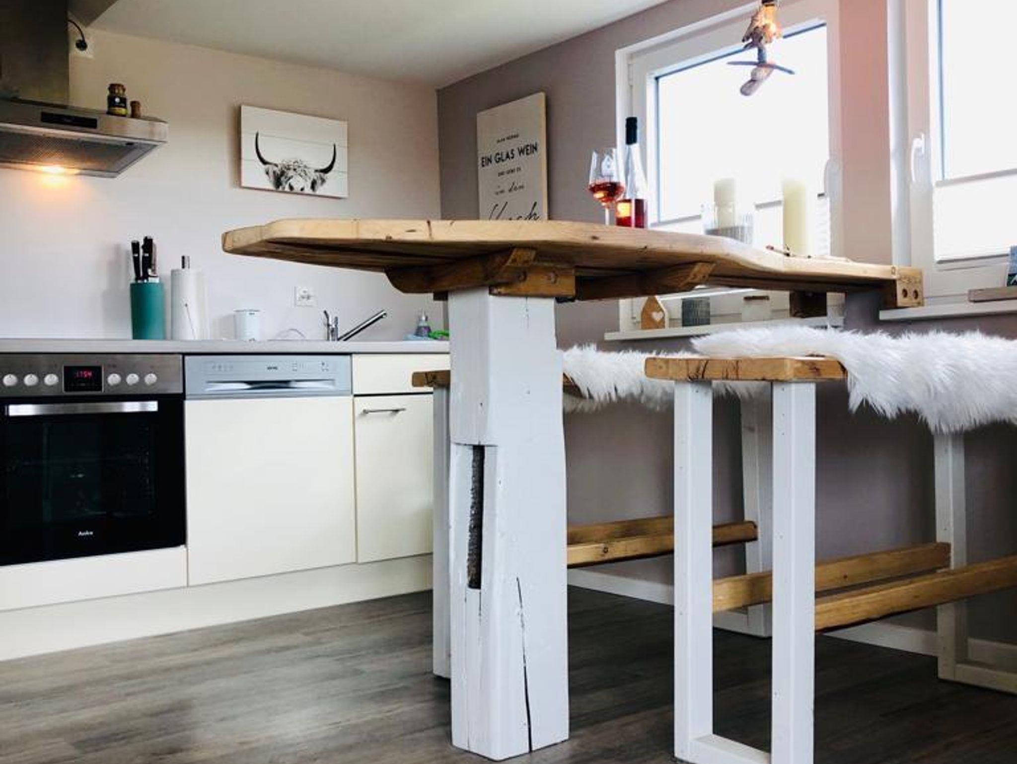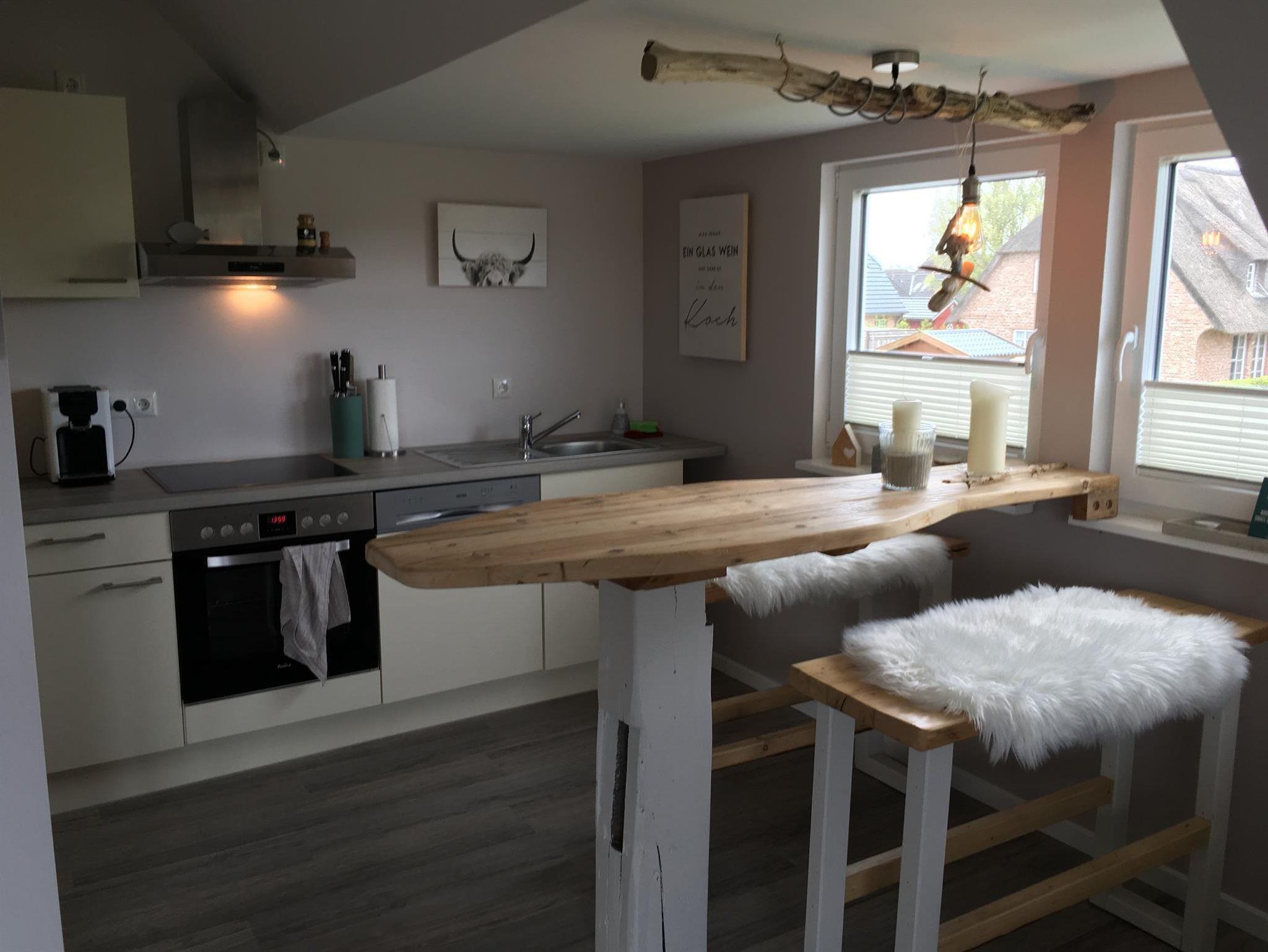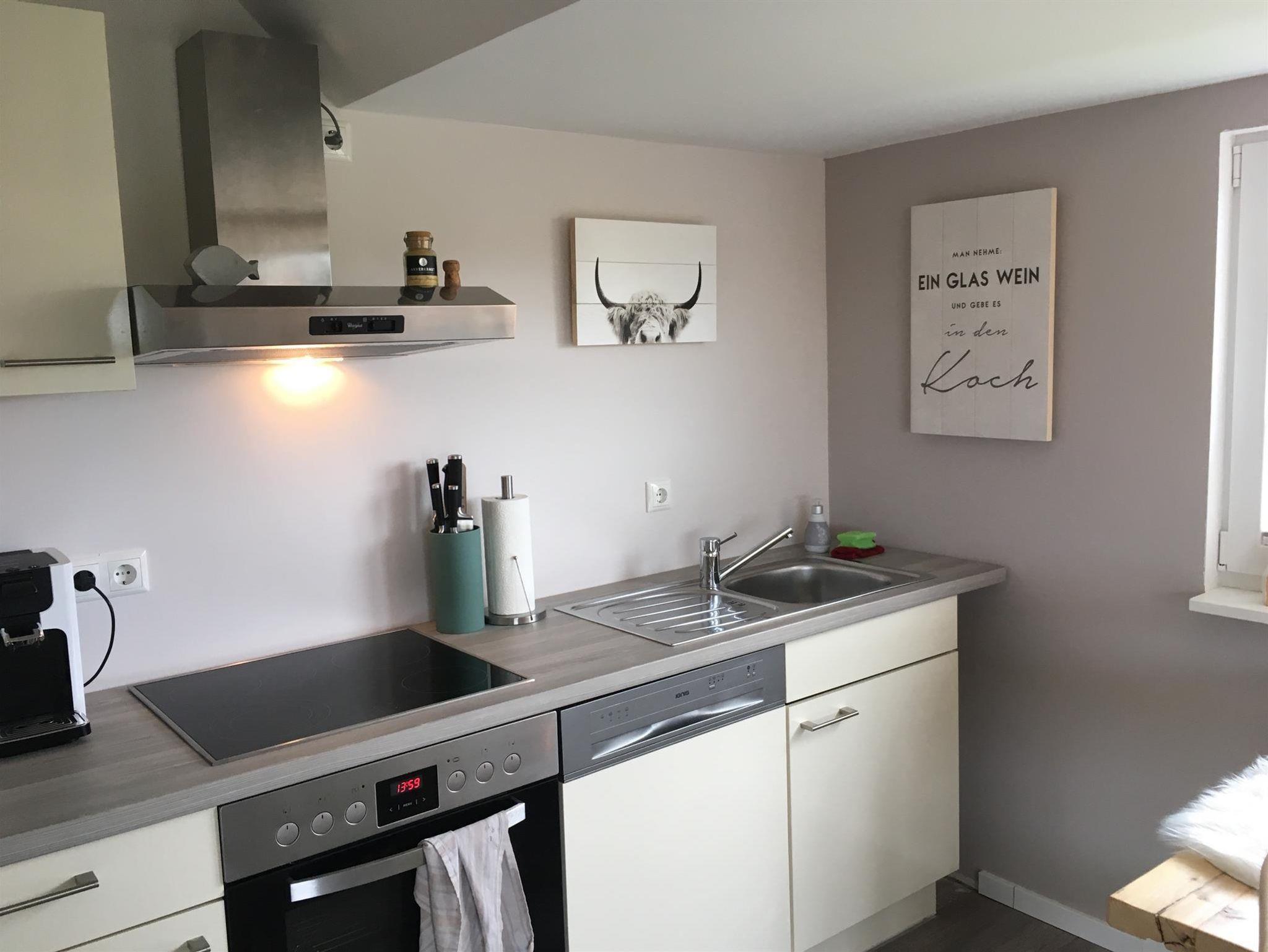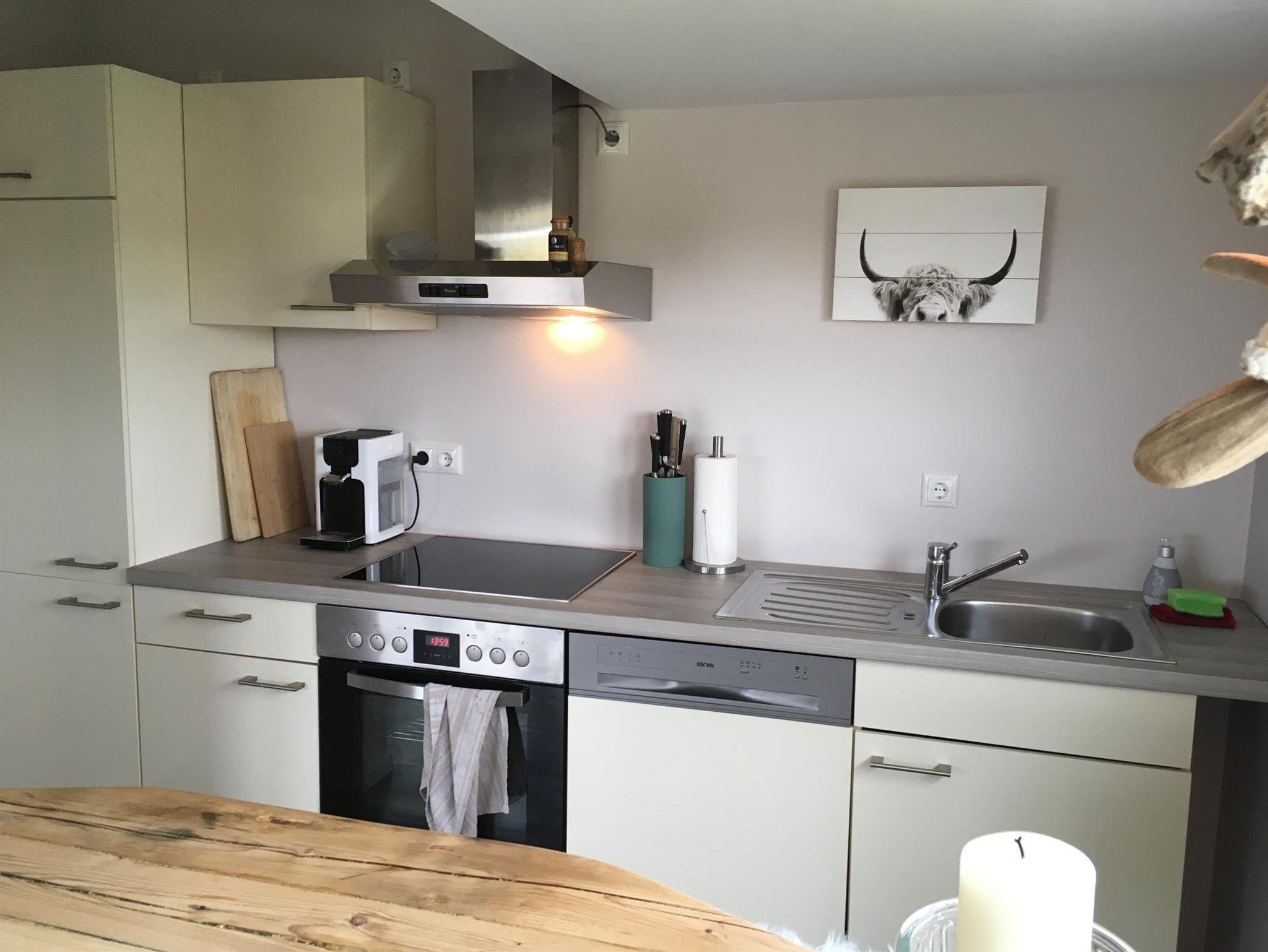• Küchenzeile mit Ceranfeld (4 Kochfelder), Ofen, Kühlschrank (inkl. Eisfach), Spülmaschine