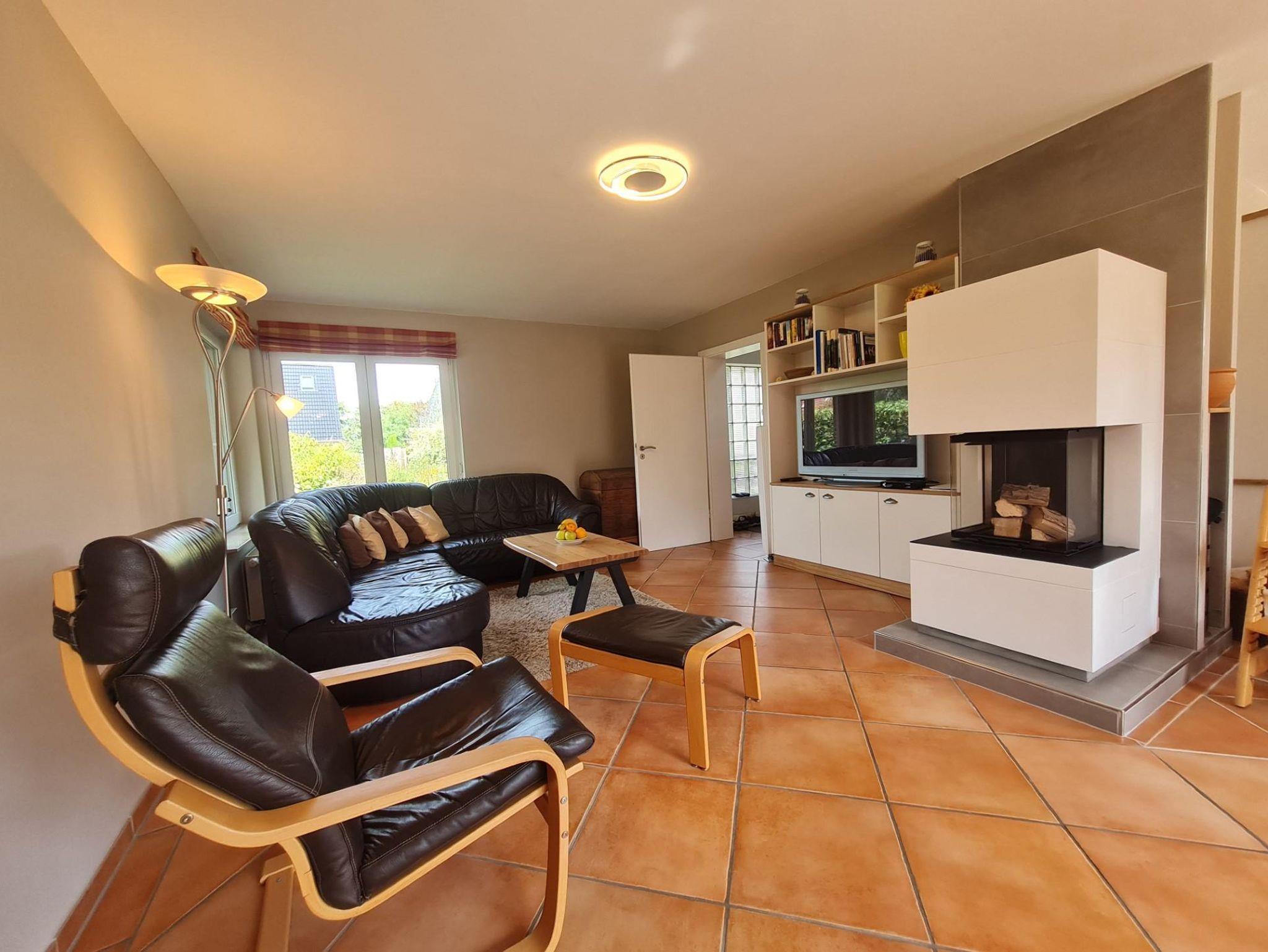 Kommen Sie an - ein großes Wohnzimmer mit Kamin, Essecke mit großem Tisch, SAT-TV, Spiel- und Leseschrank, HIFI-Anlage,