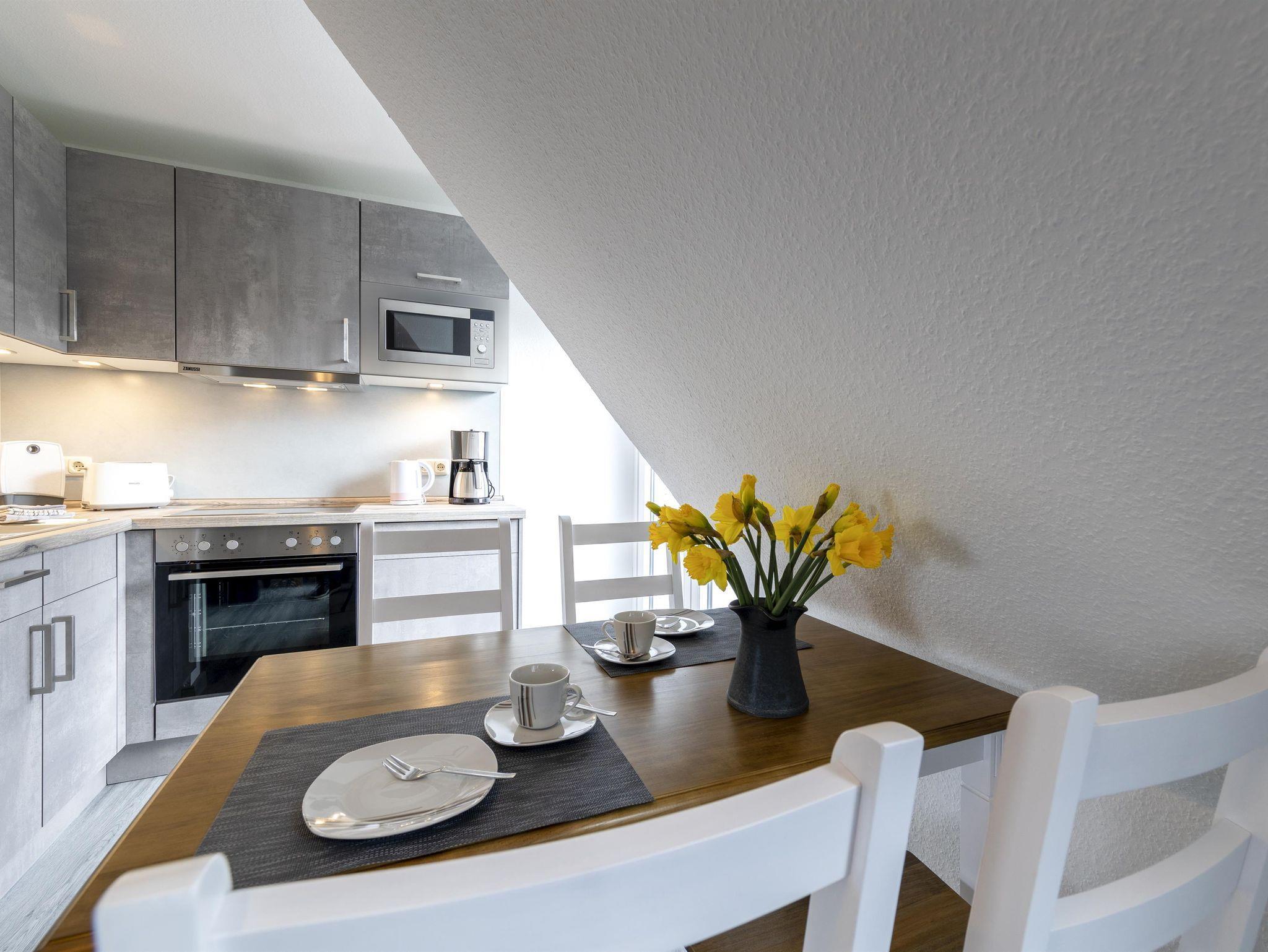 • Offene Küche: Voll ausgestattet mit Cerankochfeld und Backofen, Geschirrspüler, Mikrowelle, Toaster, Kaffeemaschine und Wasserkocher – für eine bequeme Selbstverpflegung.