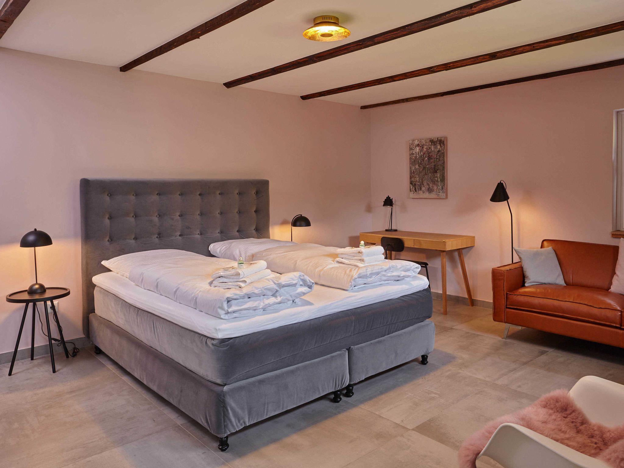 Das Wohn/Schlafzimmer, Esszimmer sind mit hochwertiger Betonoptikfliese ausgelegt. Die Ausstattung ist insgesamt im modernen Stil gehalten, die separate Küche ist klein und funktional. Das Häuschen verfügt über ein grosses Tageslichtbad. Die offene Balkenlage im Esszimmer verleiht dem Häuschen einen individuellen Charakter. Zur Unterhaltung steht ein grosser Flachbildschirm und eine Stereoanlage bereit. Eine umfangreiche DVD Auswahl mit guten Flimen und eine ausgewählte Literatur mit aktuellen Romanen schenken genussreiche und gemütliche Stunden. Serviceleistungen, wie Bettwäsche, Handtücher, sowie Endreinigung werden selbstverständlich geboten. Eine Fußbodenheizung sorgt für ein angenehmes Raumklima.