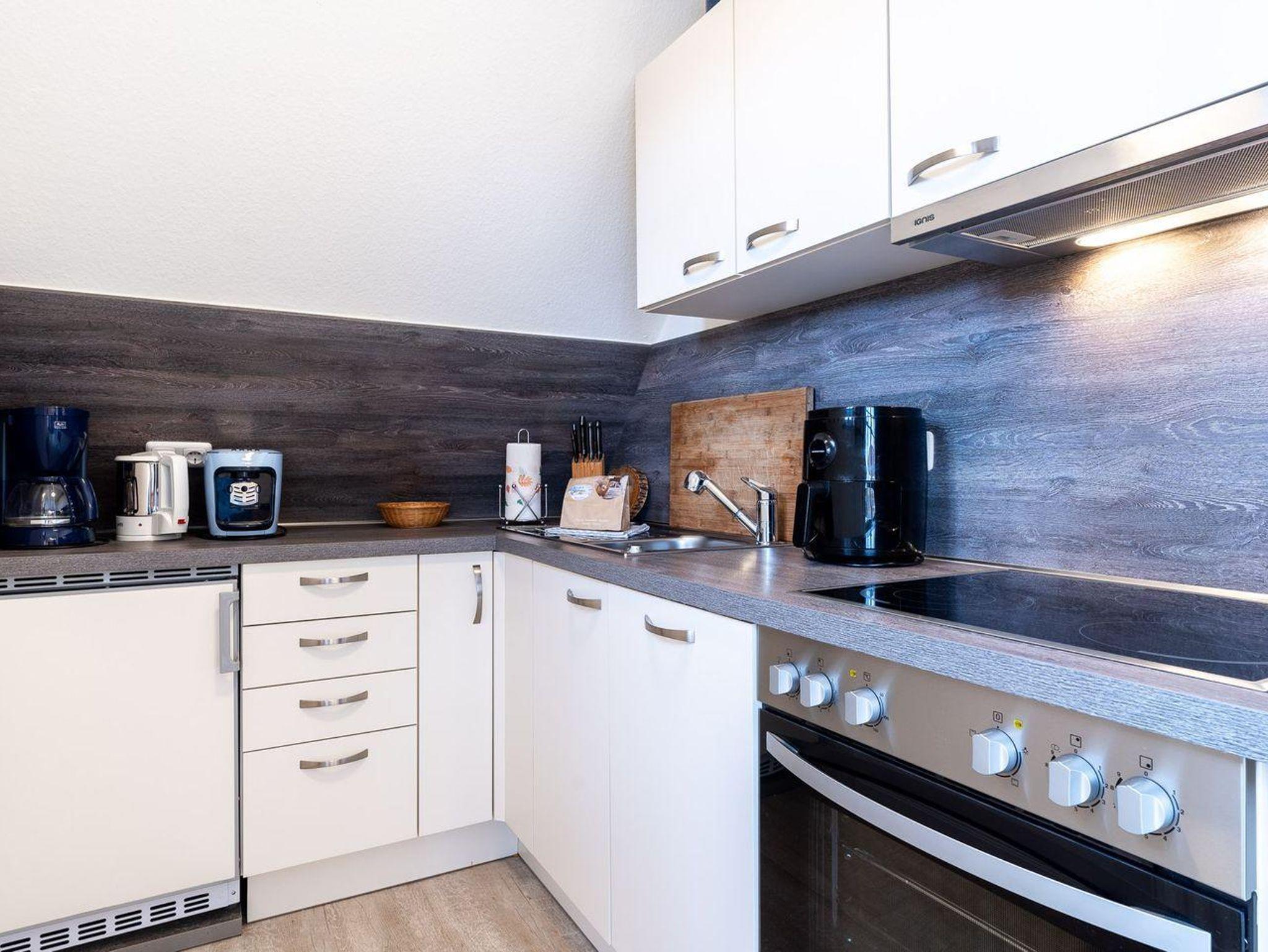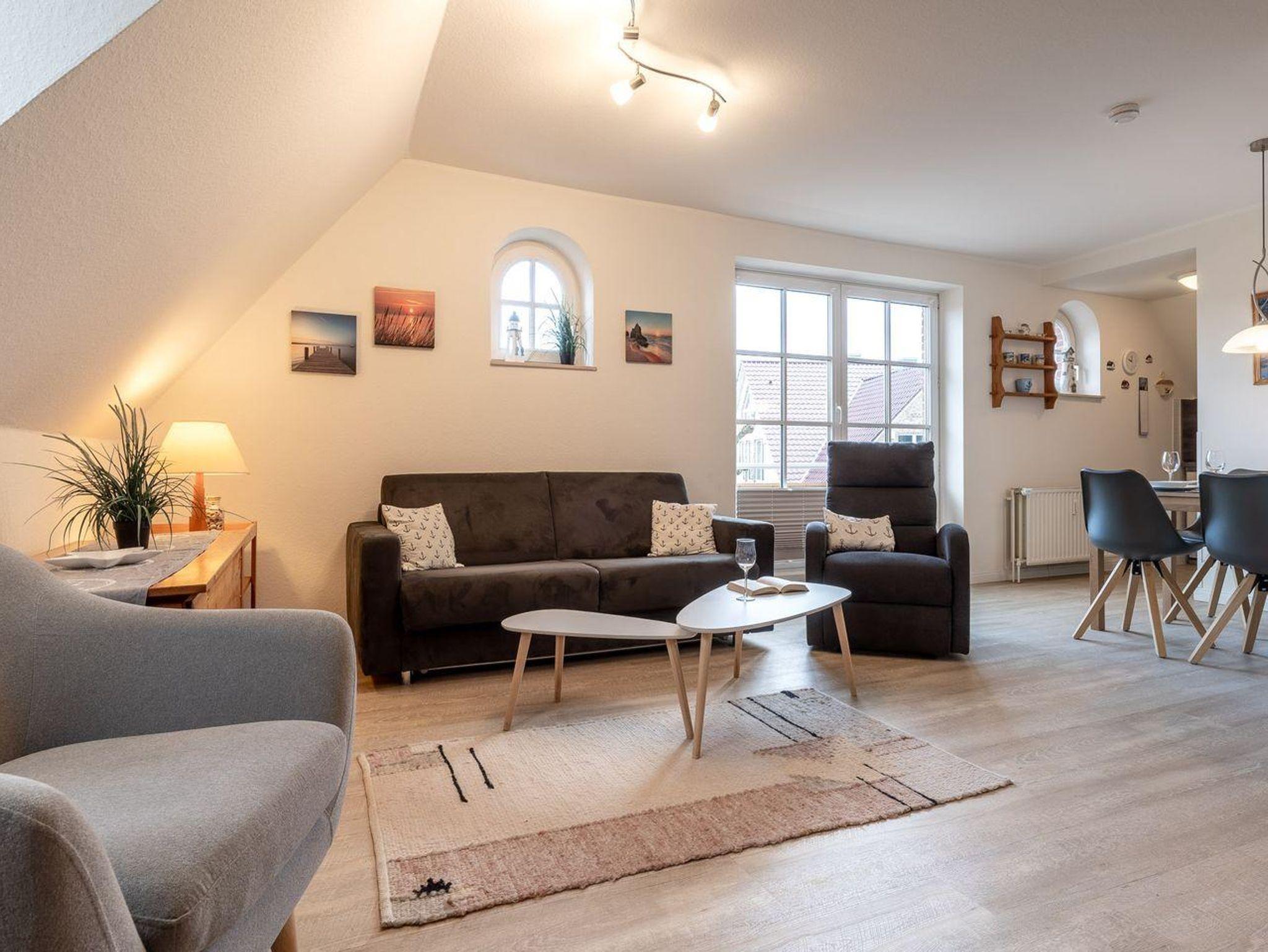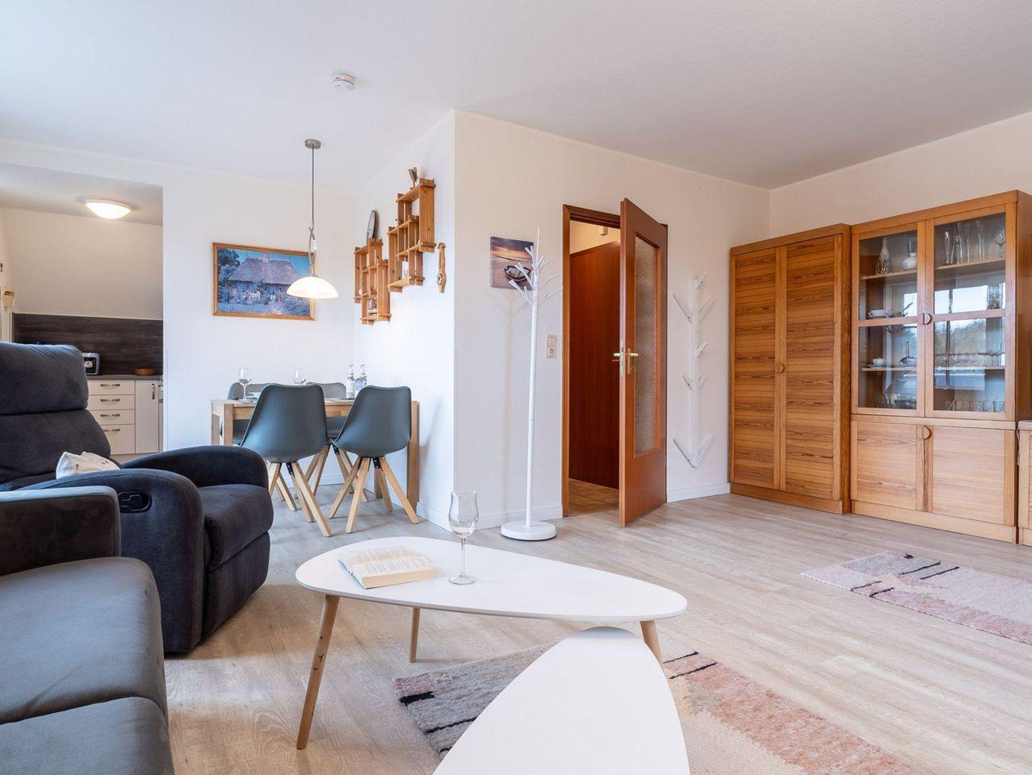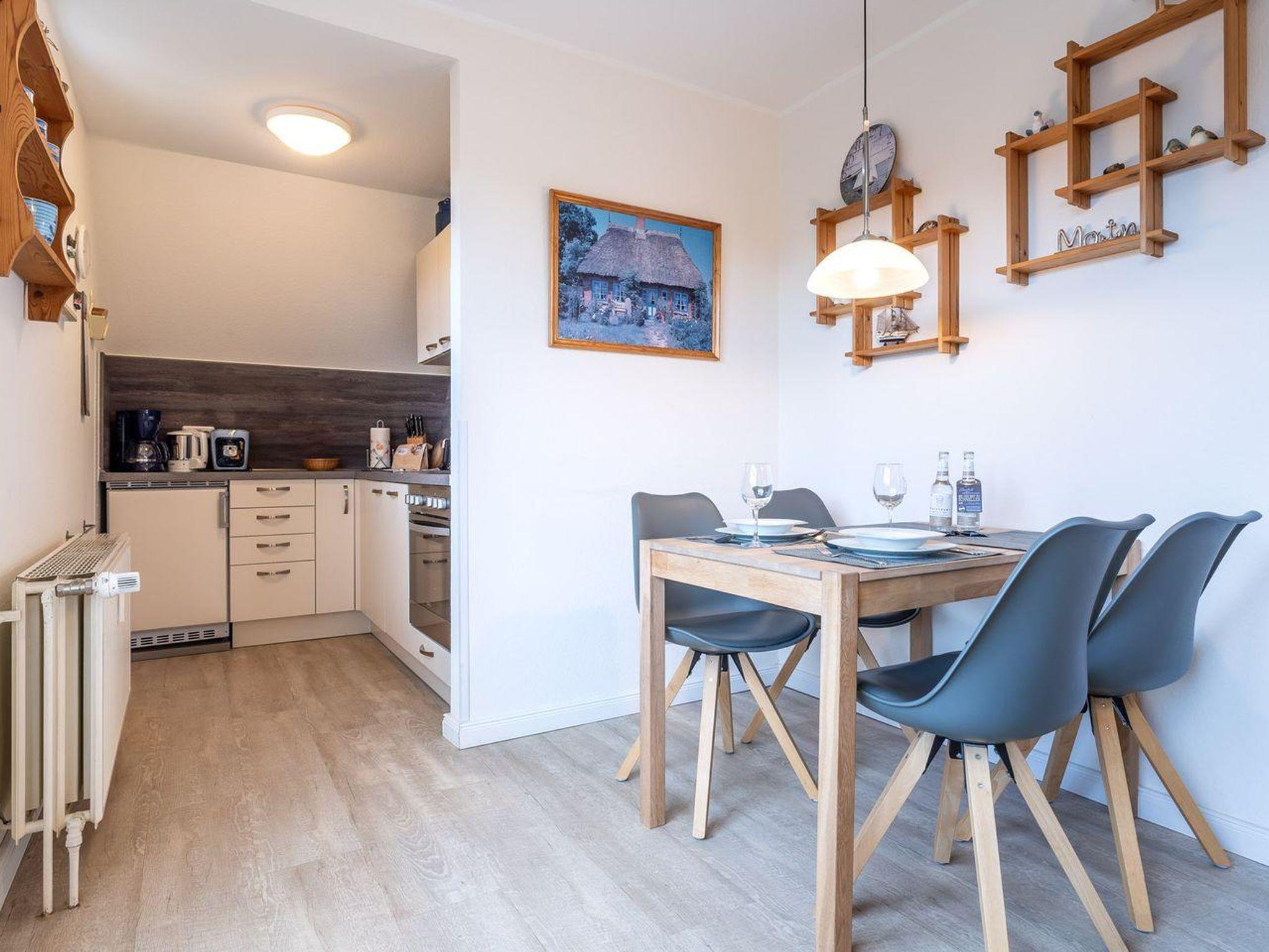 Das helle, einladende Wohnzimmer lädt mit einer bequemen Schlafcouch zum Verweilen ein – perfekt für entspannte Abende nach einem Tag am Meer. Die offene, moderne Küche ist vollständig ausgestattet und bietet alles, was Sie für die Zubereitung leckerer Mahlzeiten benötigen. Genießen Sie Ihre Speisen gemeinsam am Esstisch oder lassen Sie den Tag bei einem Glas Wein auf dem sonnigen Balkon ausklingen.