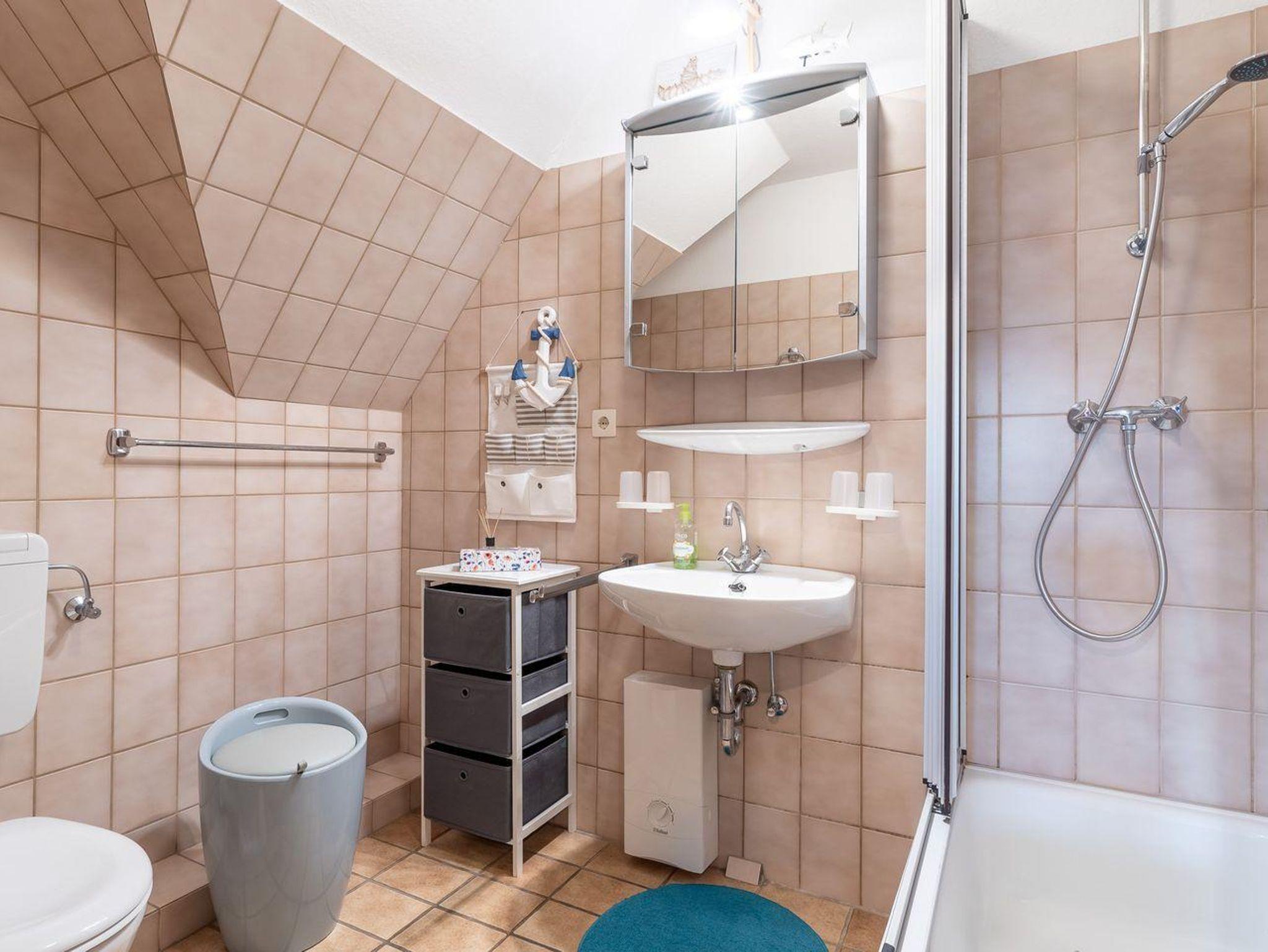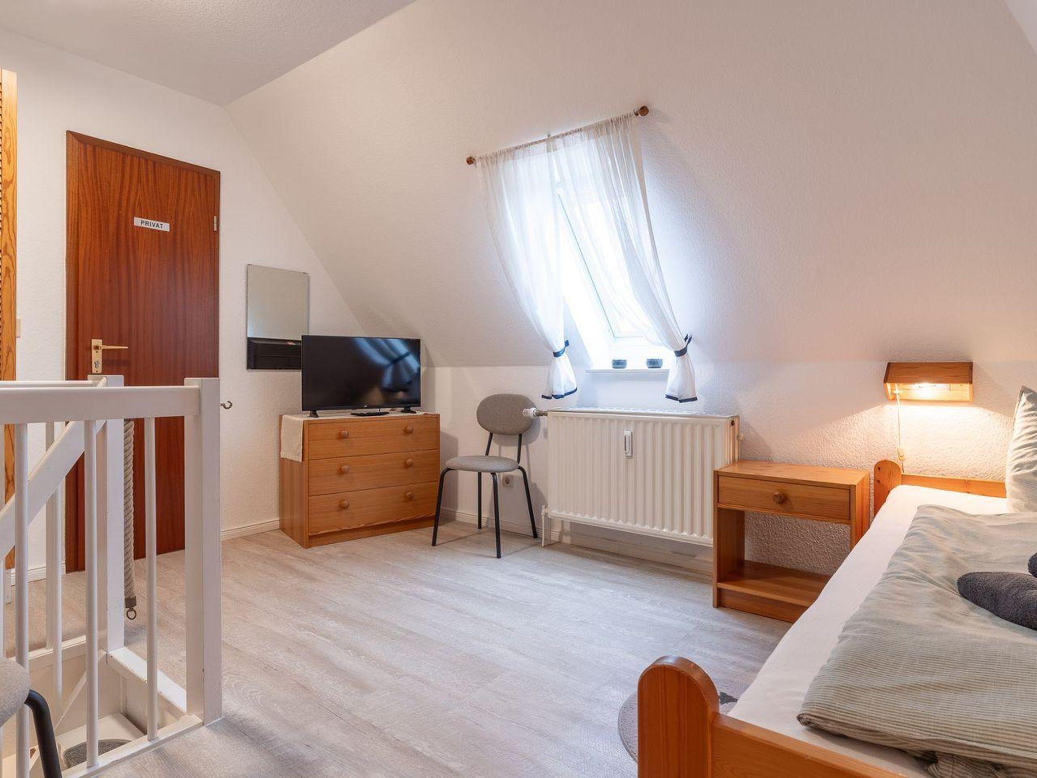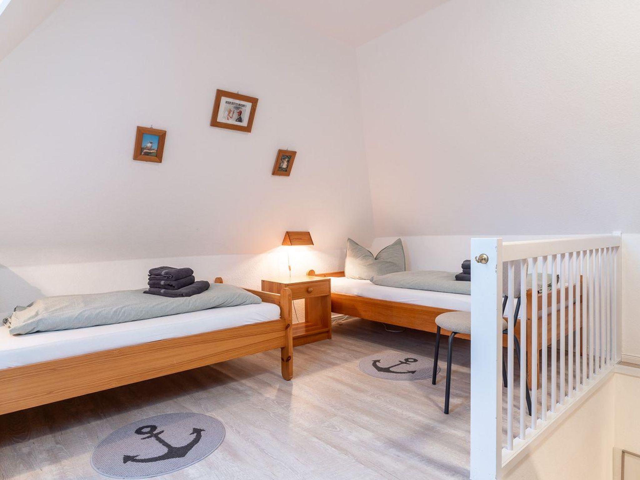 Das Schlafzimmer im Dachgeschoss erreichen Sie über eine relativ steile Treppe. Hier erwarten Sie zwei gemütliche Einzelbetten, die für erholsamen Schlaf sorgen. Diese Raumaufteilung macht die Wohnung ideal für Familien oder kleine Gruppen von Freunden, die ihren Urlaub an der Nordsee genießen möchten.