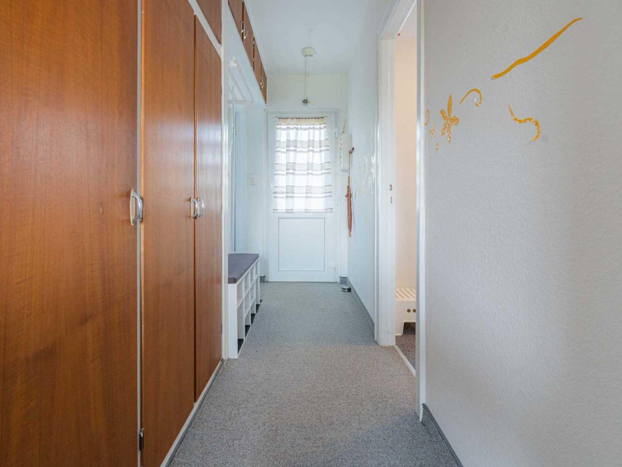 Flur mit Schrankwand, Garderobe, Spiegel und Schuhablage mit Sitzbänkchen.