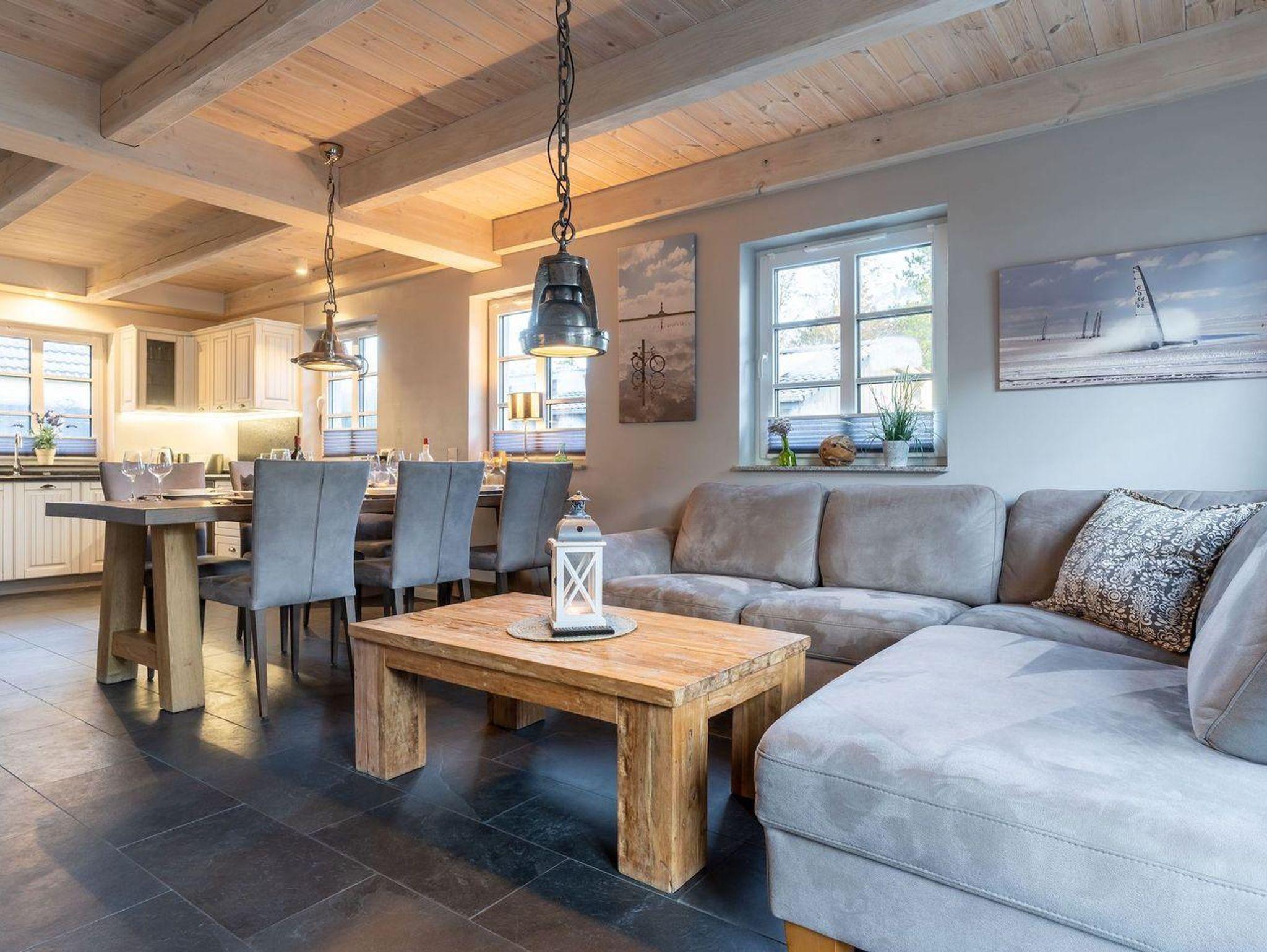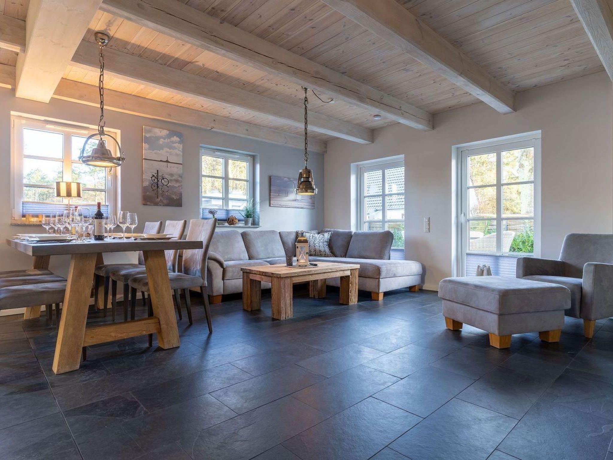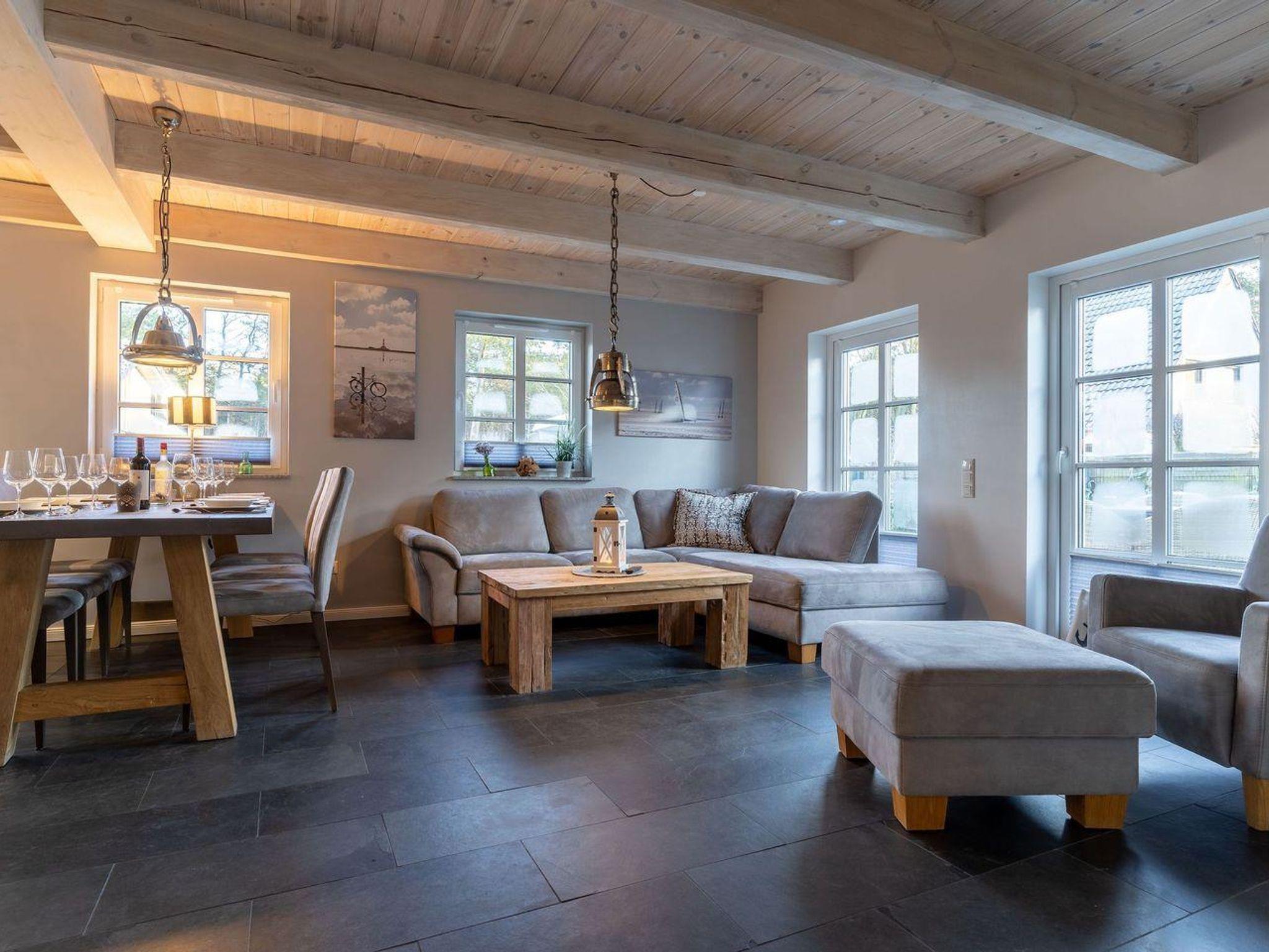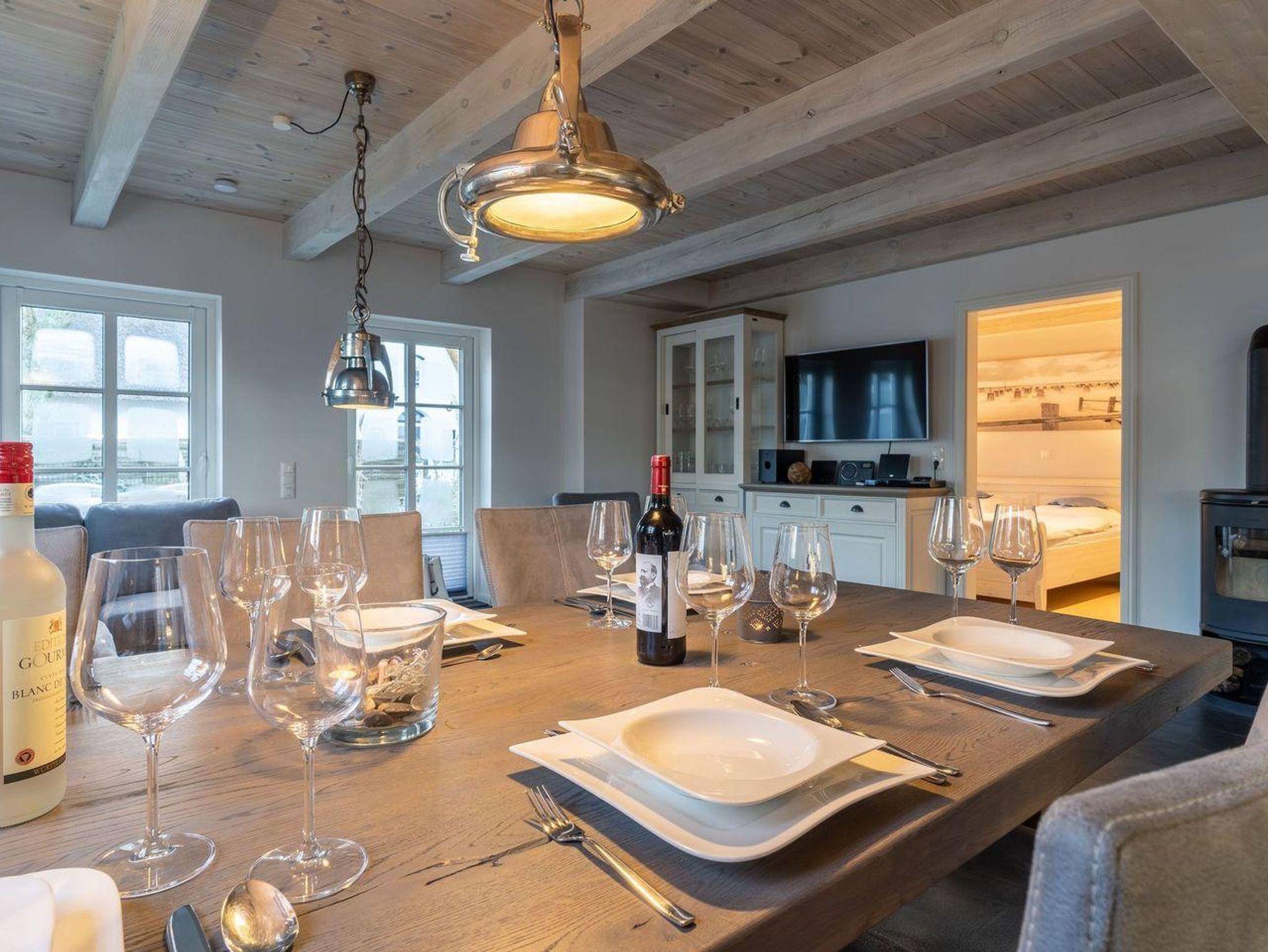 Die wunderschöne Haushälfte unter Reet verfügt über ca. 130 m² und bietet Platz für 1-6 Personen.Im Erdgeschoss befindet sich der lichtdurchflutete Wohnraum mit TV, Kamin, einer offenen Küche sowie einem stilvollen Essbereich.Die Küche ist ausgestattet mit Backofen und Geschirrspüler, sowie einem Esperto-Caffè-Automat, Toaster, Wasserkocher und den üblichen Küchenutensilien.An den Wohnbereich schließen sich ein Flur, ein Duschbad und ein Doppelschlafzimmer an.Das Erdgeschoss ist rollstuhlfreundlich.Über eine Holztreppe gelangt man in das Obergeschoss. Die beiden Schlafzimmer, jeweils mit einem Doppelbett sorgen für ruhevolle Erholung.Im ersten Stock befindet sich ausserdem ein weiteres Duschbad sowie eine Sauna.