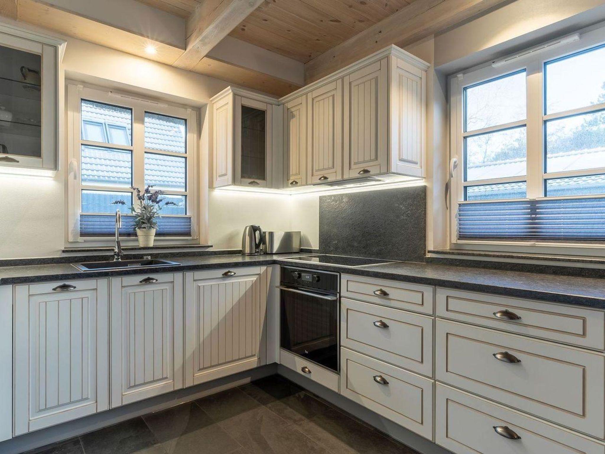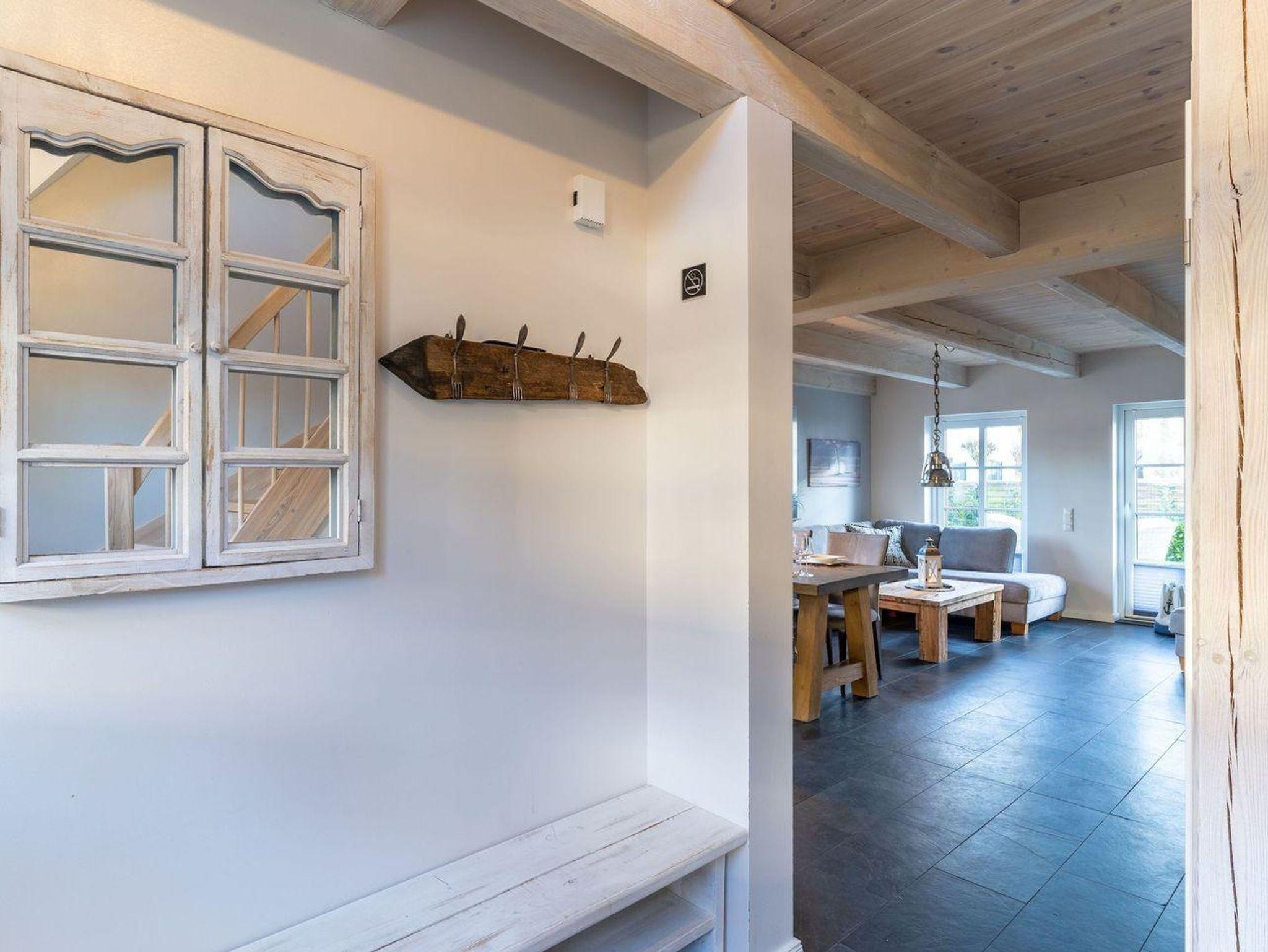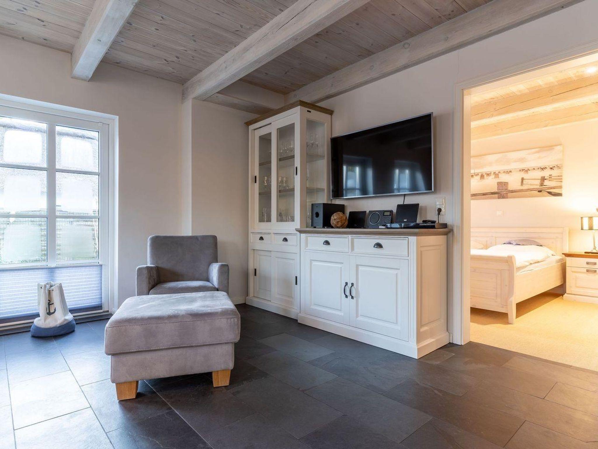 Die wunderschöne Haushälfte unter Reet verfügt über ca. 130 m² und bietet Platz für 1-6 Personen.Im Erdgeschoss befindet sich der lichtdurchflutete Wohnraum mit TV, Kamin, einer offenen Küche sowie einem stilvollen Essbereich.Die Küche ist ausgestattet mit Backofen und Geschirrspüler, sowie einem Esperto-Caffè-Automat, Toaster, Wasserkocher und den üblichen Küchenutensilien.An den Wohnbereich schließen sich ein Flur, ein Duschbad und ein Doppelschlafzimmer an.Das Erdgeschoss ist rollstuhlfreundlich.Über eine Holztreppe gelangt man in das Obergeschoss. Die beiden Schlafzimmer, jeweils mit einem Doppelbett sorgen für ruhevolle Erholung.Im ersten Stock befindet sich ausserdem ein weiteres Duschbad sowie eine Sauna.