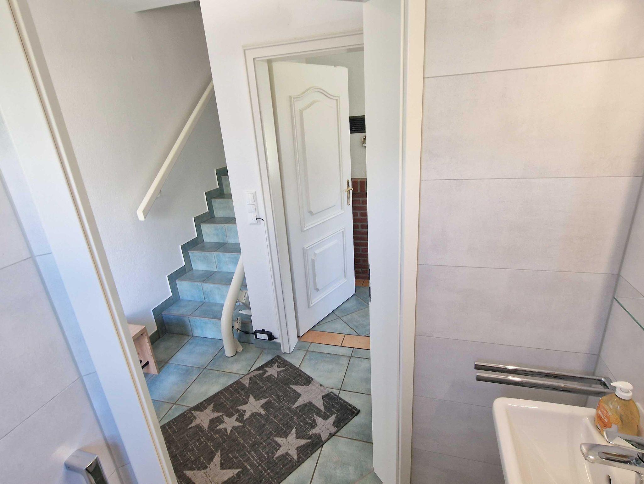 FlurGarderobe, Spiegel, Schuhständer, Treppe nach oben, Flur 2= Spiegel, Garderobe, Korbsessel, Treppe nach unten