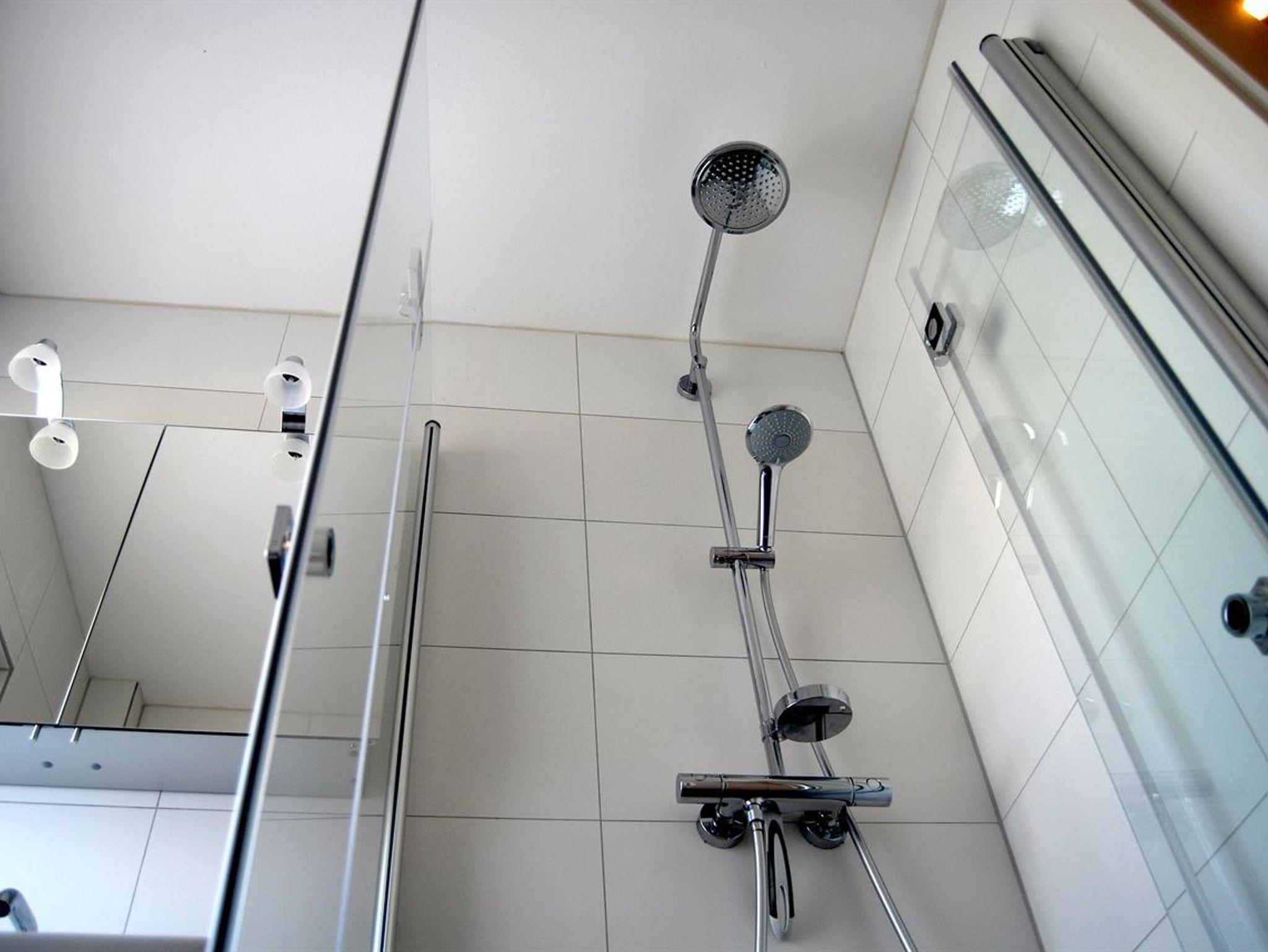 Das Elternbad liegt en-suite zum Schlafzimmer, ein Traum in gebrochenem Weiss und edlem Anthrazit. In der grossen Regendusche lassen Sie das Wasser auf sich niederprasseln und möchten am liebsten gar nicht mehr rauskommen.