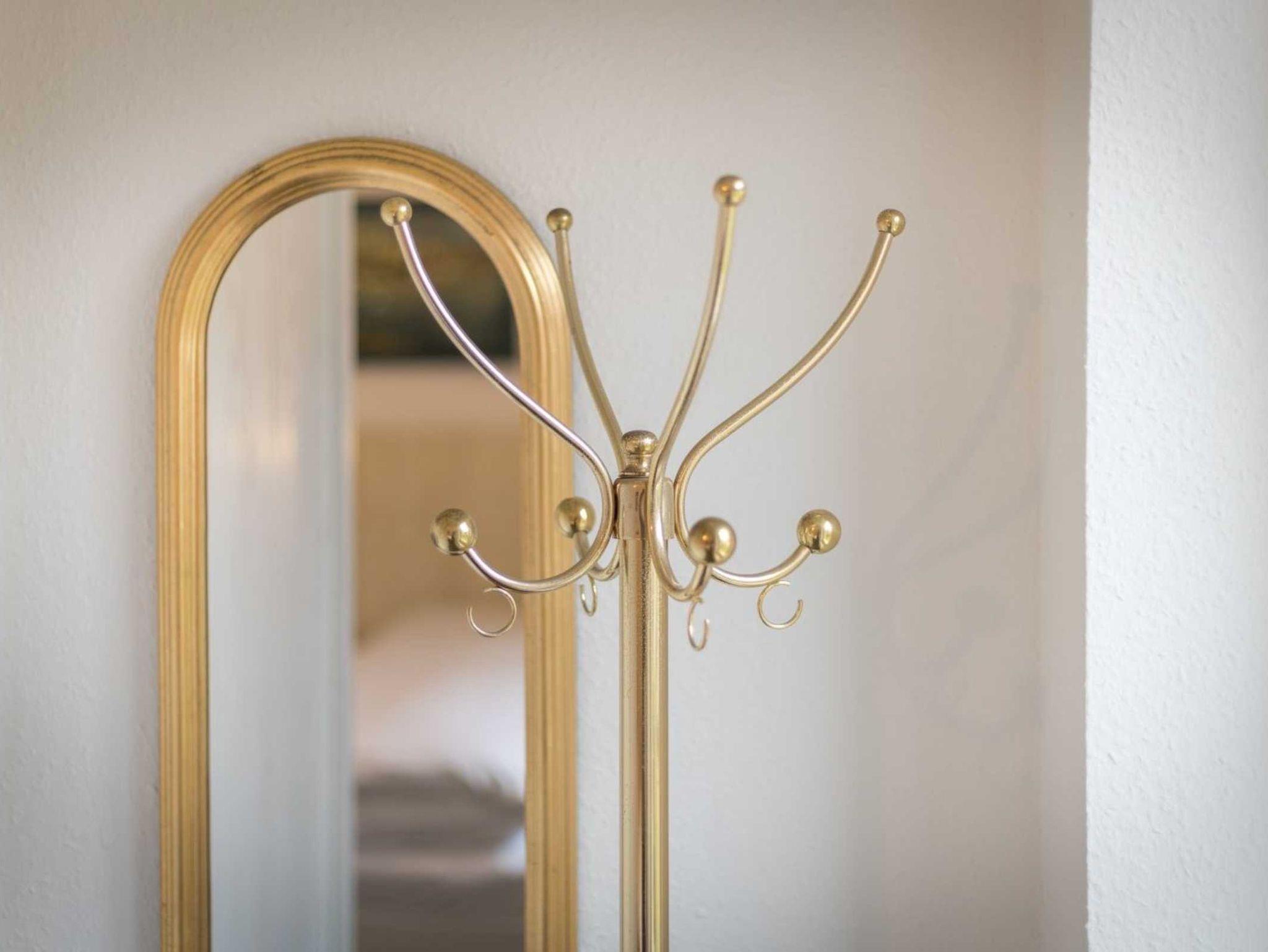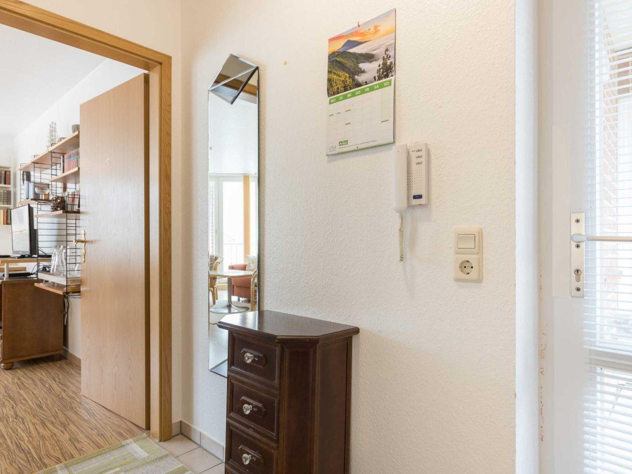 Flur mit Garderobe, Spiegel und Haushaltsschrank mit Staubsauger im Eingangsbereich. Vor dem Wohnungseingang befindet sich ein eigener Laubengang.