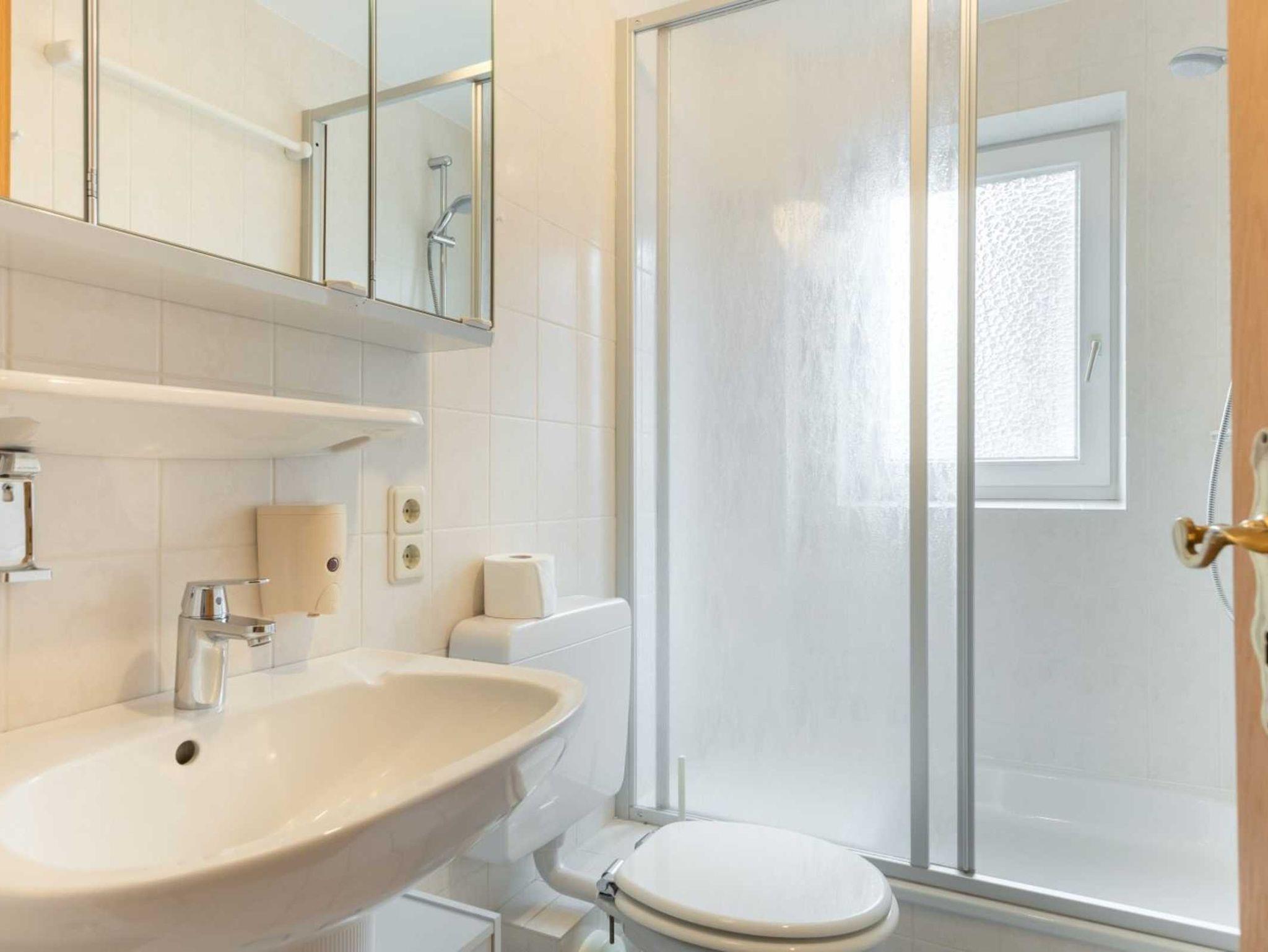 Badezimmer (Duschbad) mit Dusche, WC, Föhn und Tageslicht.