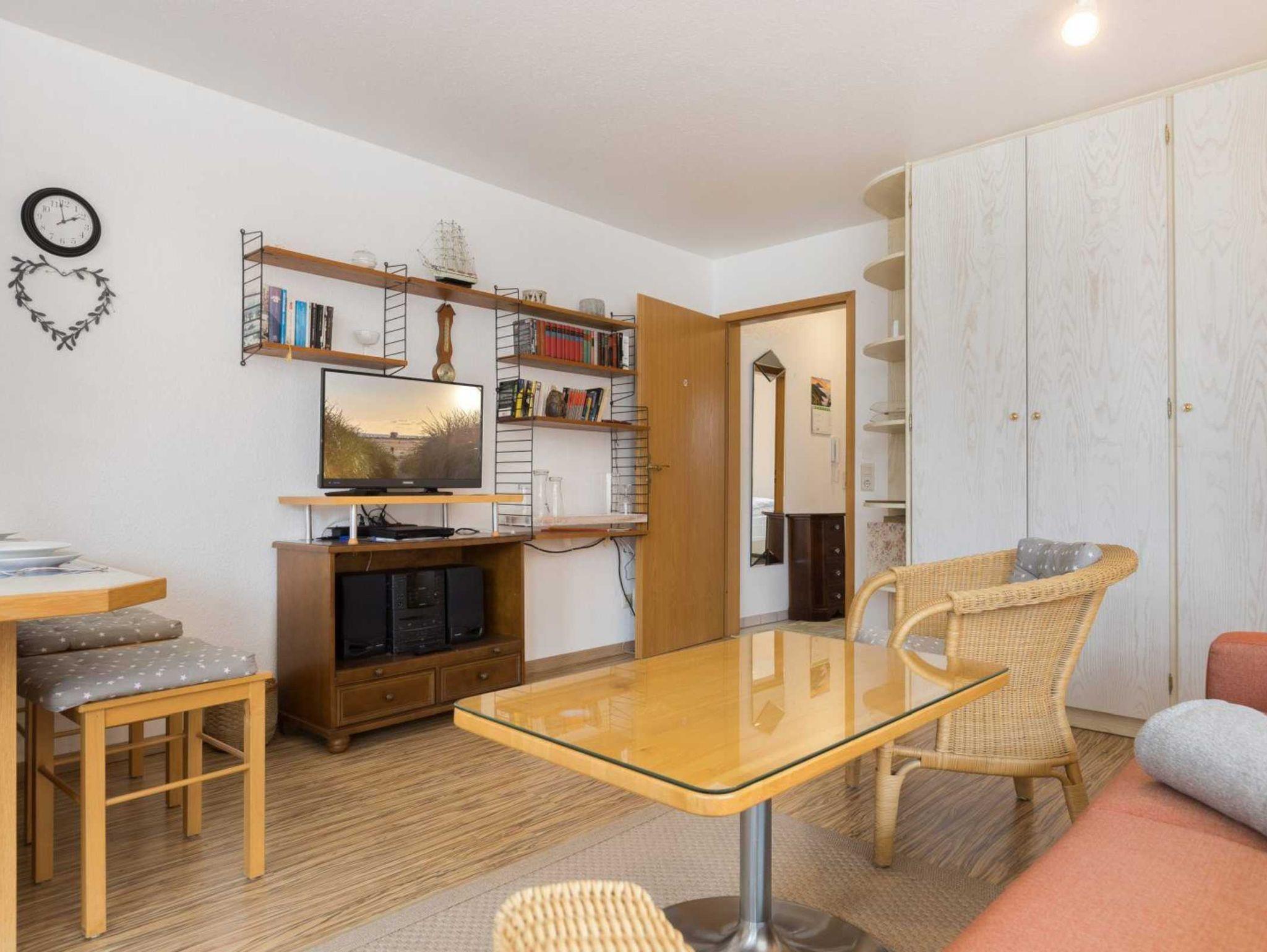 Wohnzimmer mit ausklappbarem (Schlaf-) Sofa (140x200cm), 2 Sesseln, Esstisch für 3-4 Personen, TV (Kabel), DVD-Player und Stereo-Anlage. Direkter Zugang zum möblierten Eck-Balkon nach Westen. Offene Küche mit Mikrowelle mit Backfuntion, Kühlschrank mit Gefrierfach und Geschirrspüler.