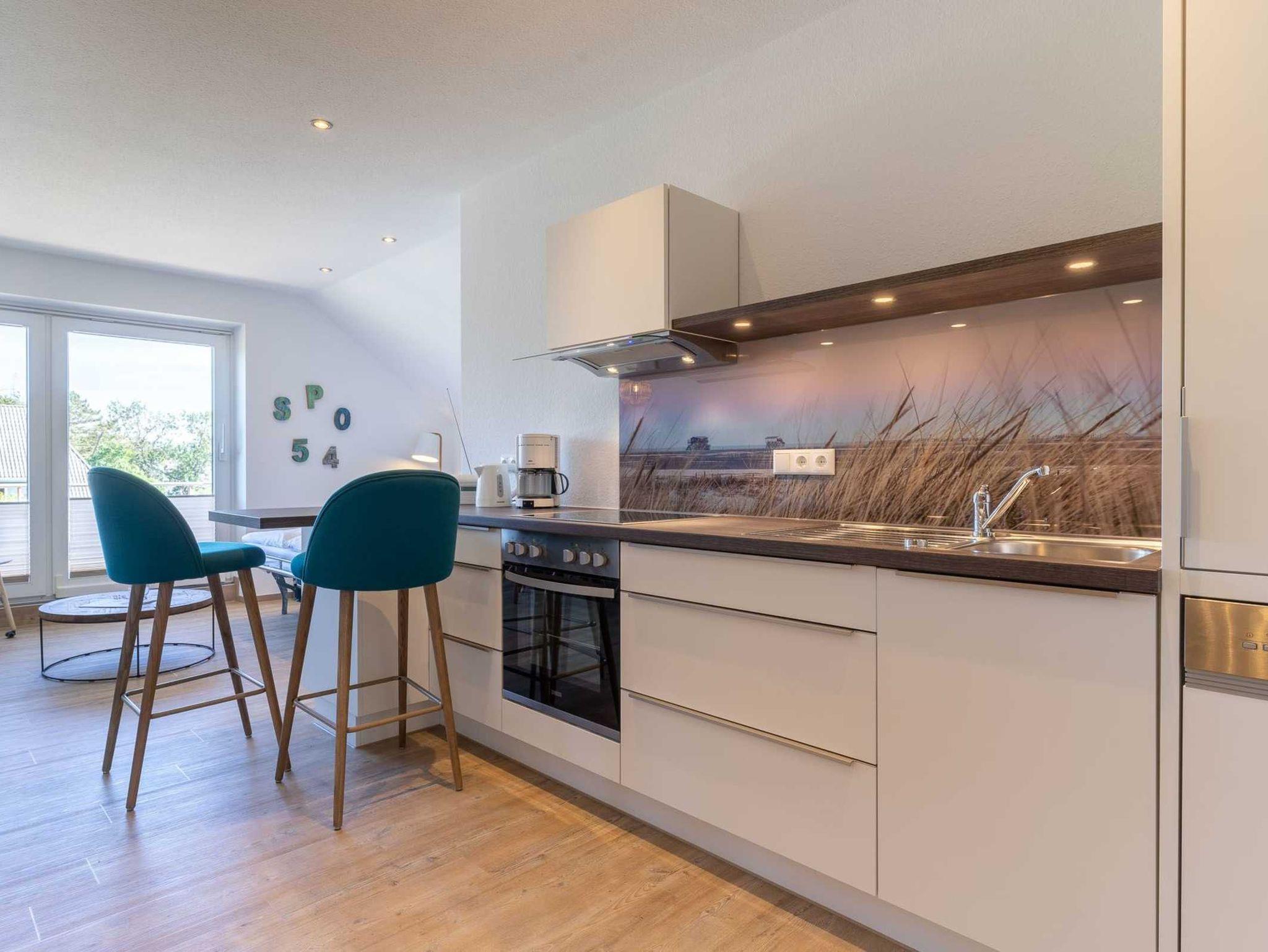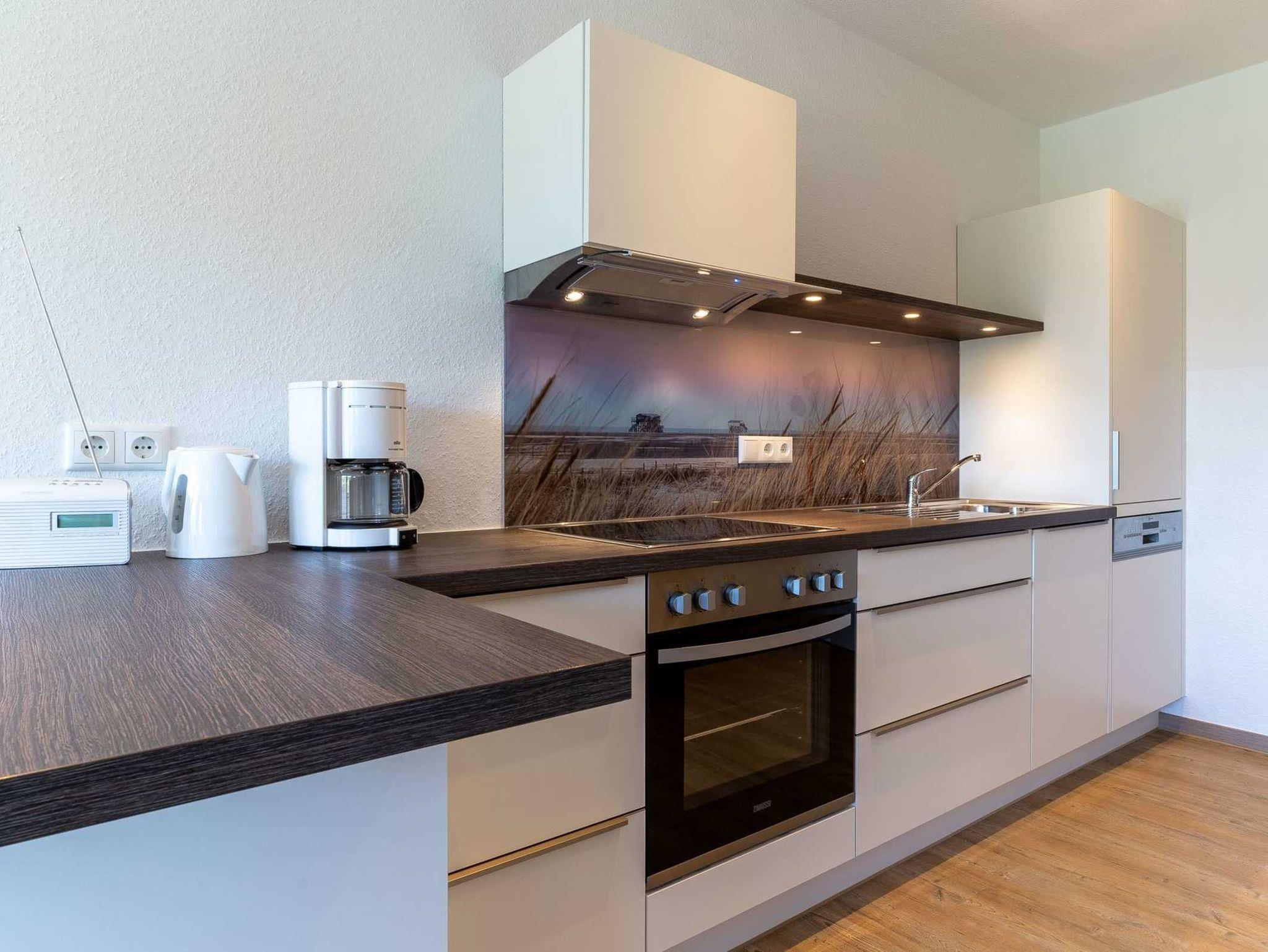 Die weiße Küche mit dunkler Arbeitsplatte und das helle, moderne Bad runden das Gesamtkonzept ab ? hier genießen Sie nordische Gemütlichkeit mit einer Wohlfühl-Atmosphäre.