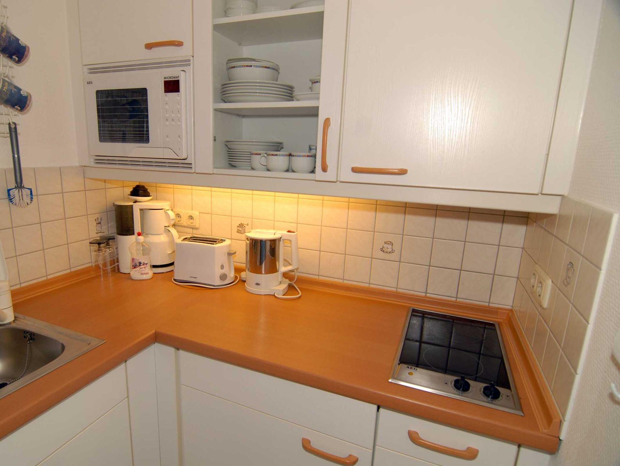 Gut ausgestattete Küche: Kreieren Sie köstliche Mahlzeiten und genießen Sie sie im einladenden Wohn-Esszimmer.
