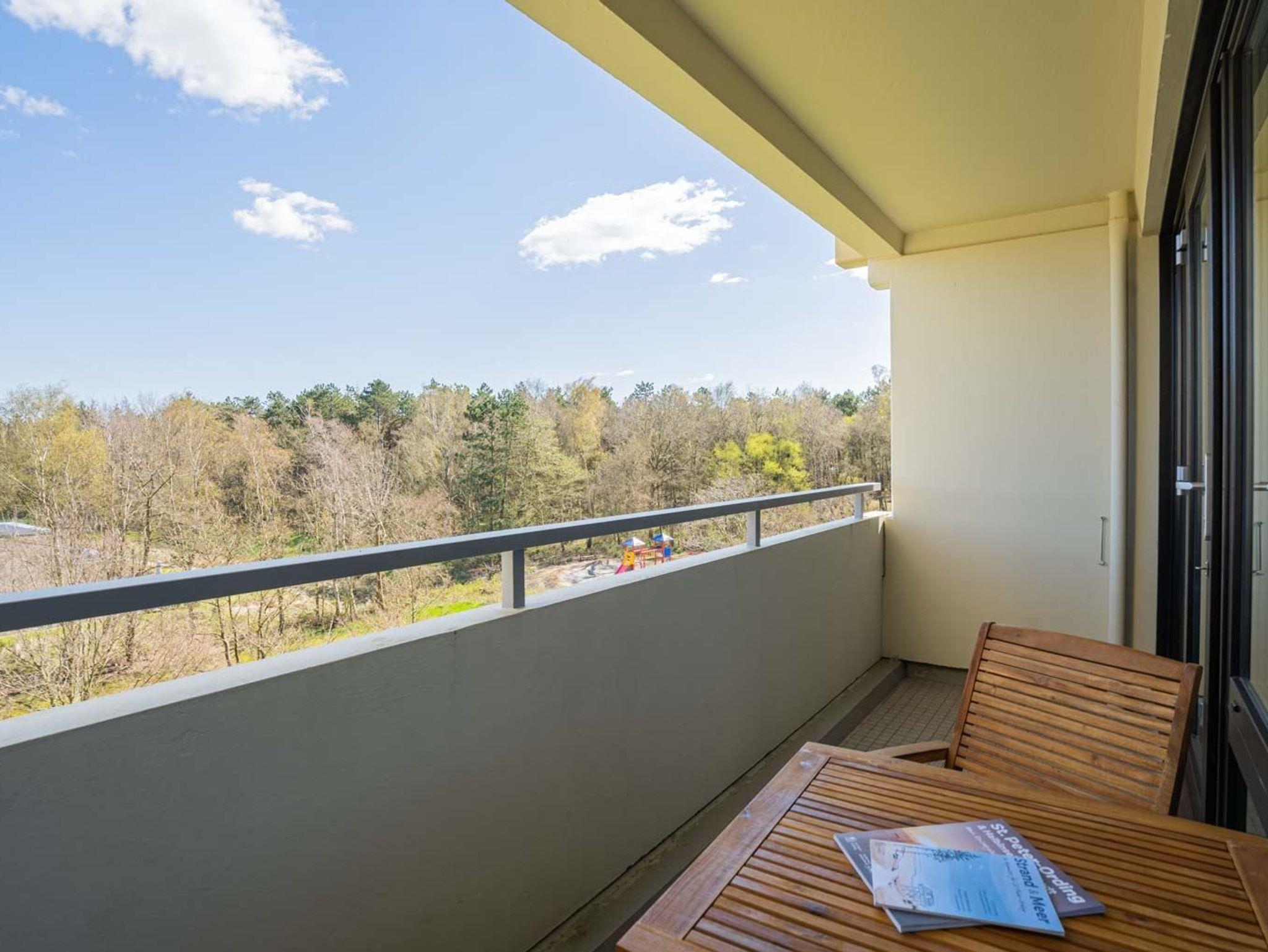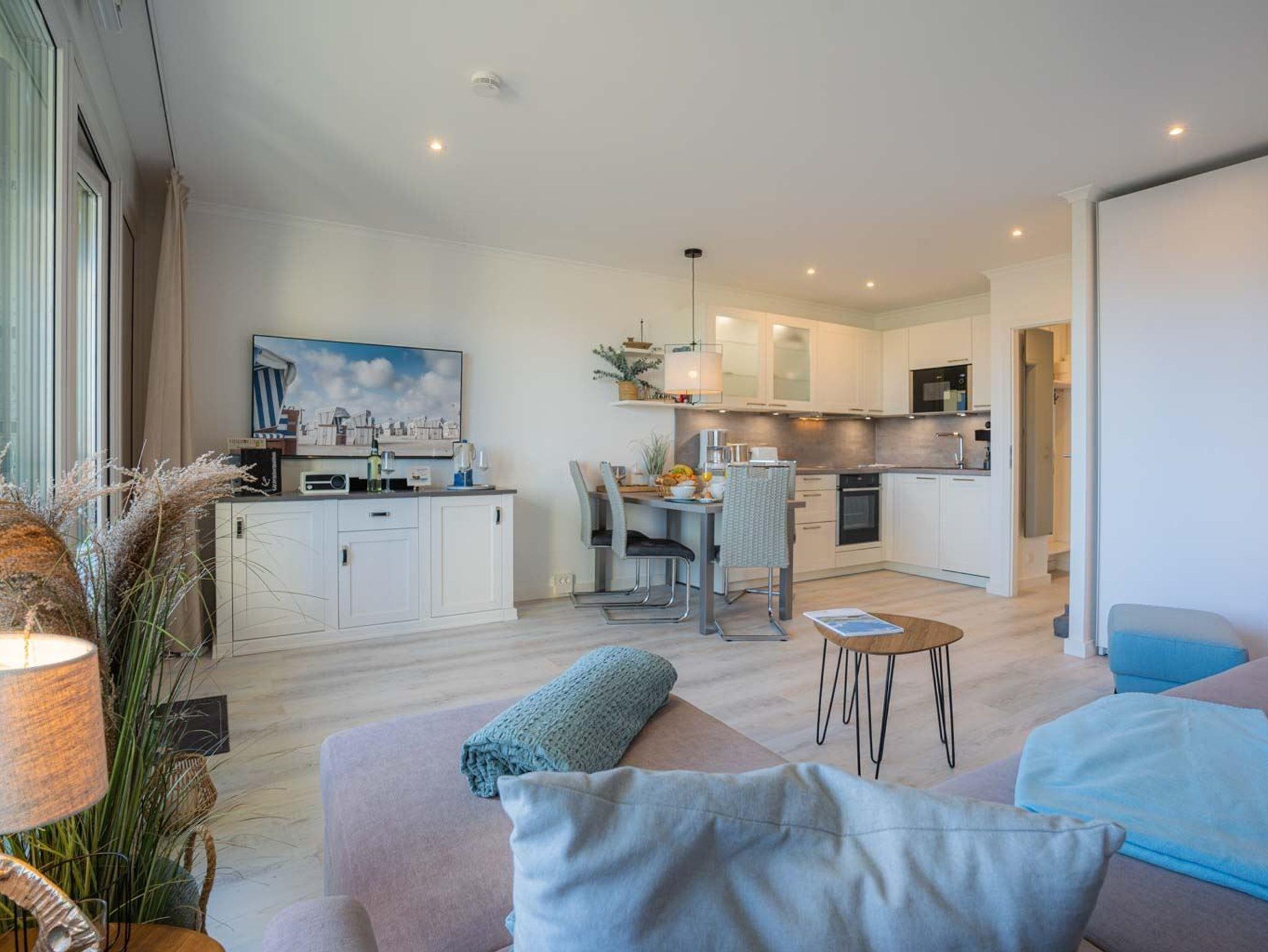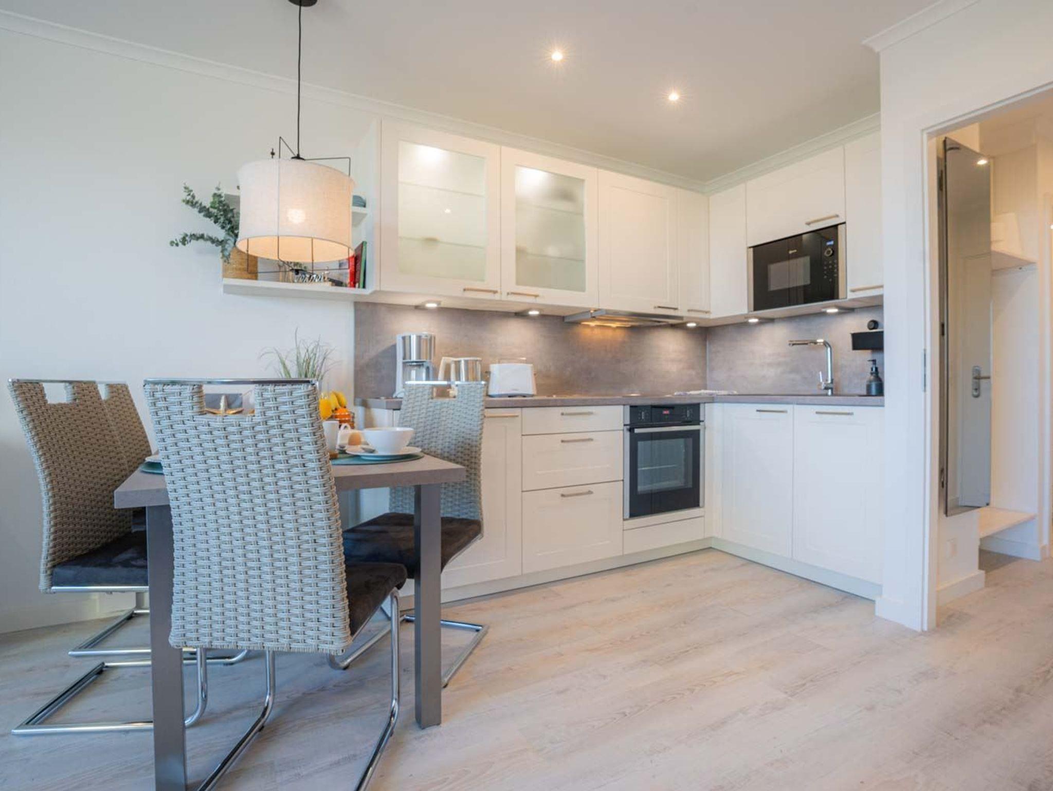 Wohn- und Schlafzimmer mit ausklappbarem Komfort-Schlafsofa (160x200cm, Matratze und Lattenrost), gemütlichem Ohrensessel mit Hocker, großem Schrank, SMART-TV (Sat) mit Bluetooth-Soundbar und Esstisch mit 4 Stühlen. Die Jalousie am Fenster wird elektrisch betrieben. Direkter Zugang zum überdachten und möblierten Balkon nach Südosten mit Blick auf den Garten und das Wäldchen. Offene Küche mit Backofen, Mikrowelle, Geschirrspüler, Kühlschrank mit Gefrierfach und Induktions-Herd mit 4 Kochstellen.