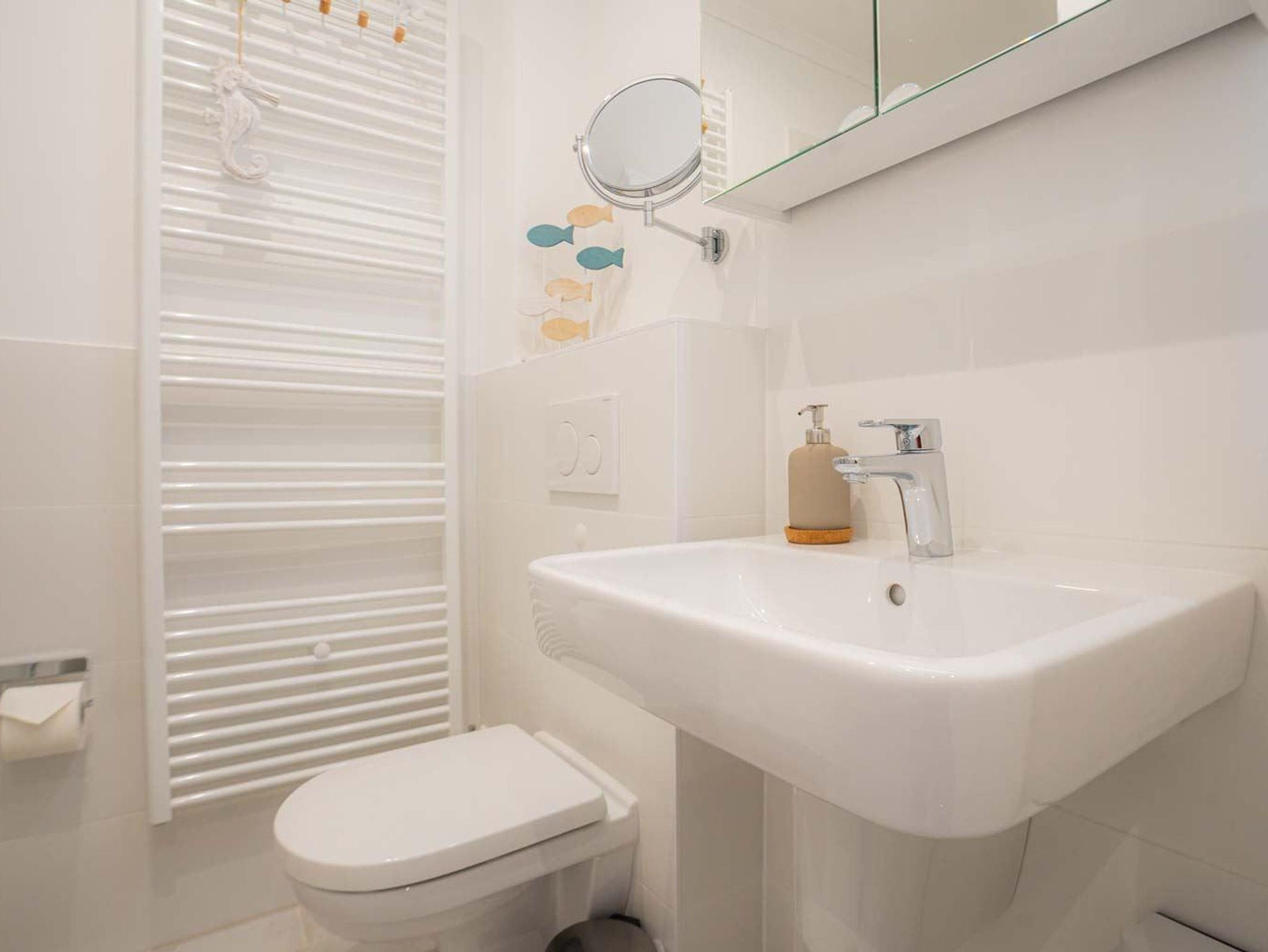 Badezimmer (Duschbad) mit Dusche (niedriger Eintritt), WC, Handtuchwärmer und Föhn.