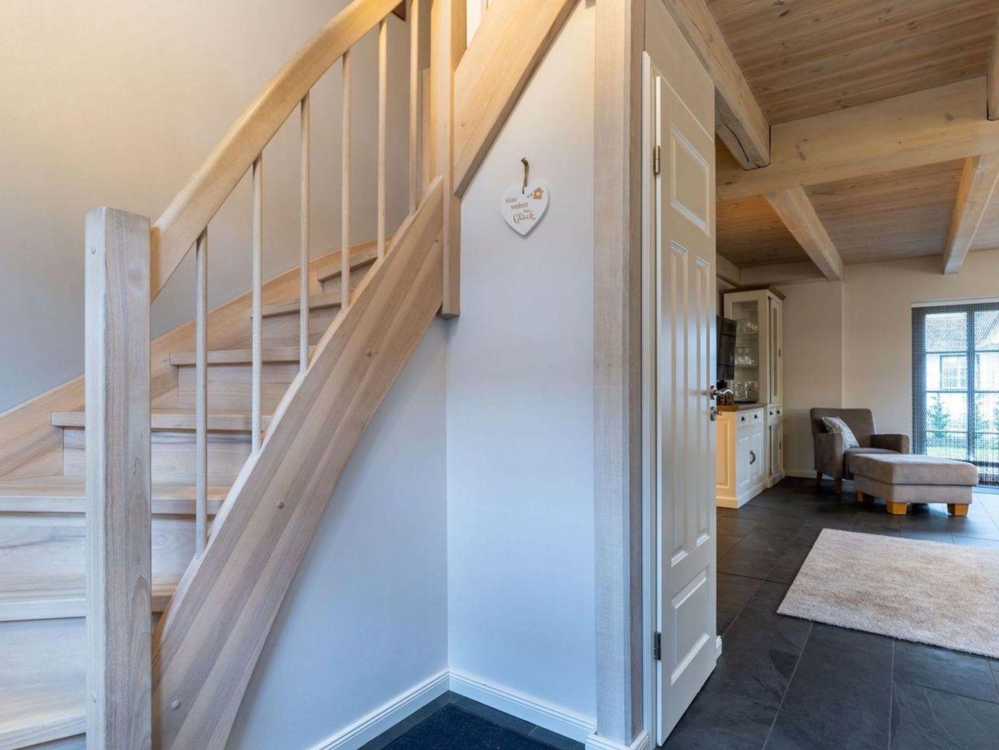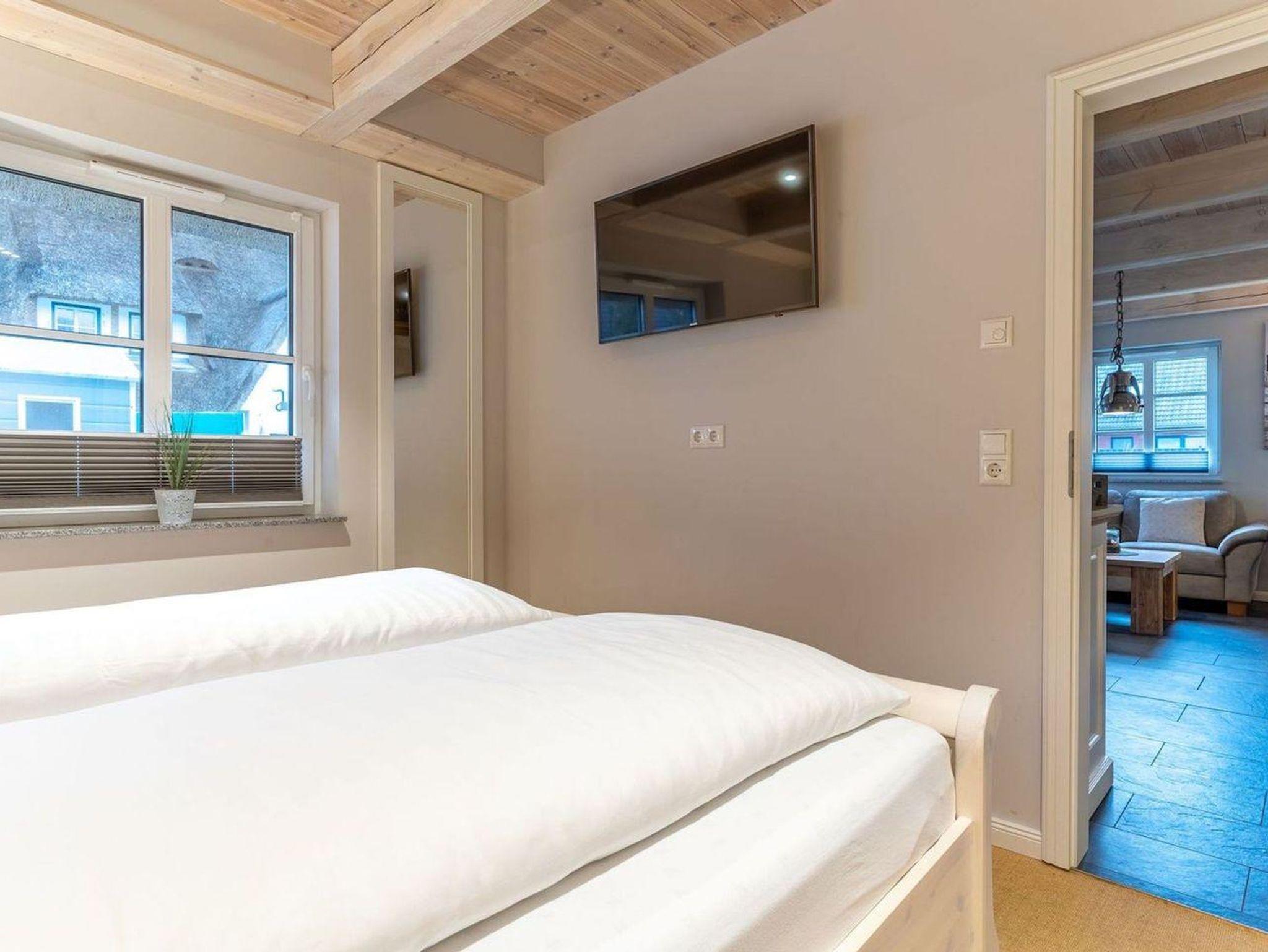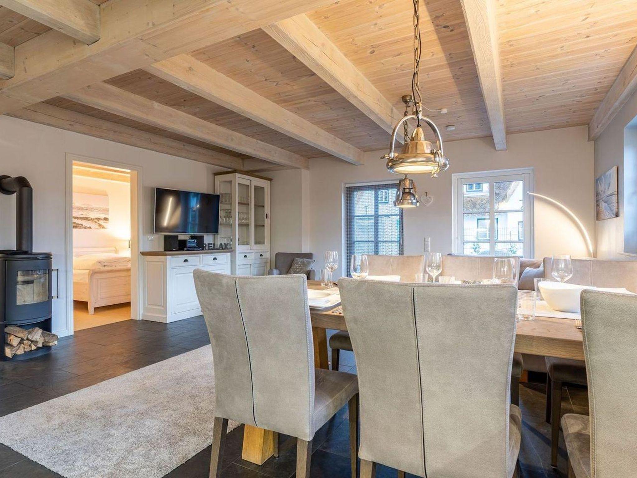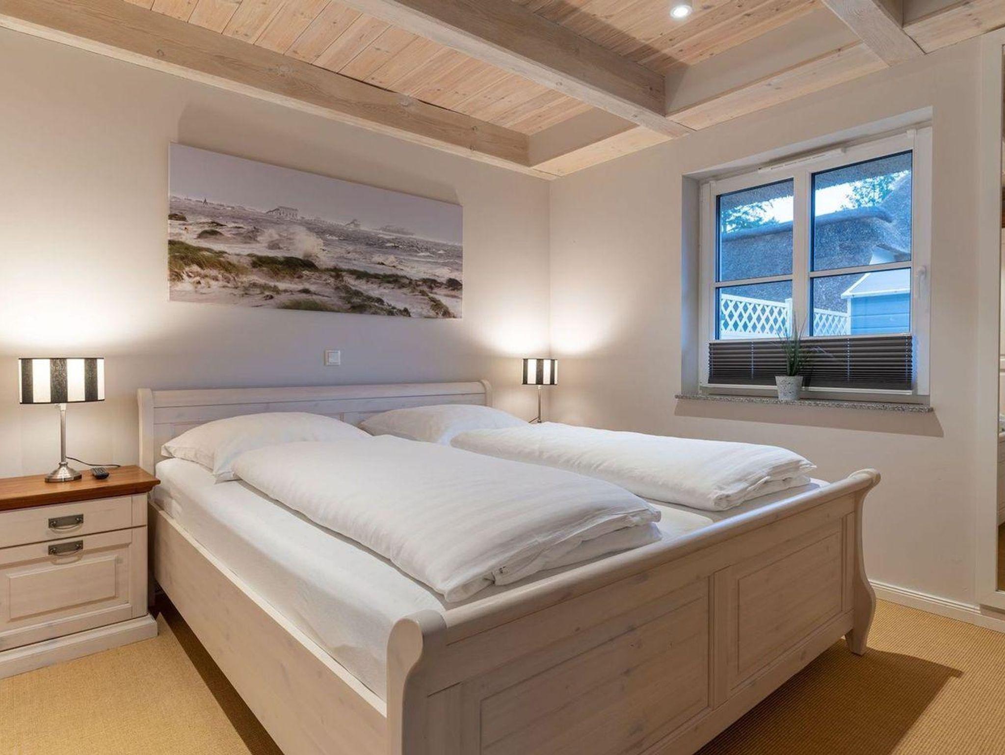 Die wunderschöne Haushälfte unter Reet verfügt über ca. 130 m² und bietet Platz für 1-6 Personen.Im Erdgeschoss befindet sich der lichtdurchflutete Wohnraum mit TV, Kamin, einer offenen Küche sowie einem stilvollen Essbereich.Die Küche ist ausgestattet mit Backofen und Geschirrspüler, sowie einem Esperto-Caffè-Automat, Toaster, Wasserkocher und den üblichen Küchenutensilien.An den Wohnbereich schließen sich ein Flur, ein Duschbad und ein Doppelschlafzimmer an.Das Erdgeschoss ist rollstuhlfreundlich.Über eine Holztreppe gelangt man in das Obergeschoss. Die beiden Schlafzimmer, jeweils mit einem Doppelbett sorgen für ruhevolle Erholung.Im ersten Stock befindet sich ausserdem ein weiteres Duschbad sowie eine Sauna.
