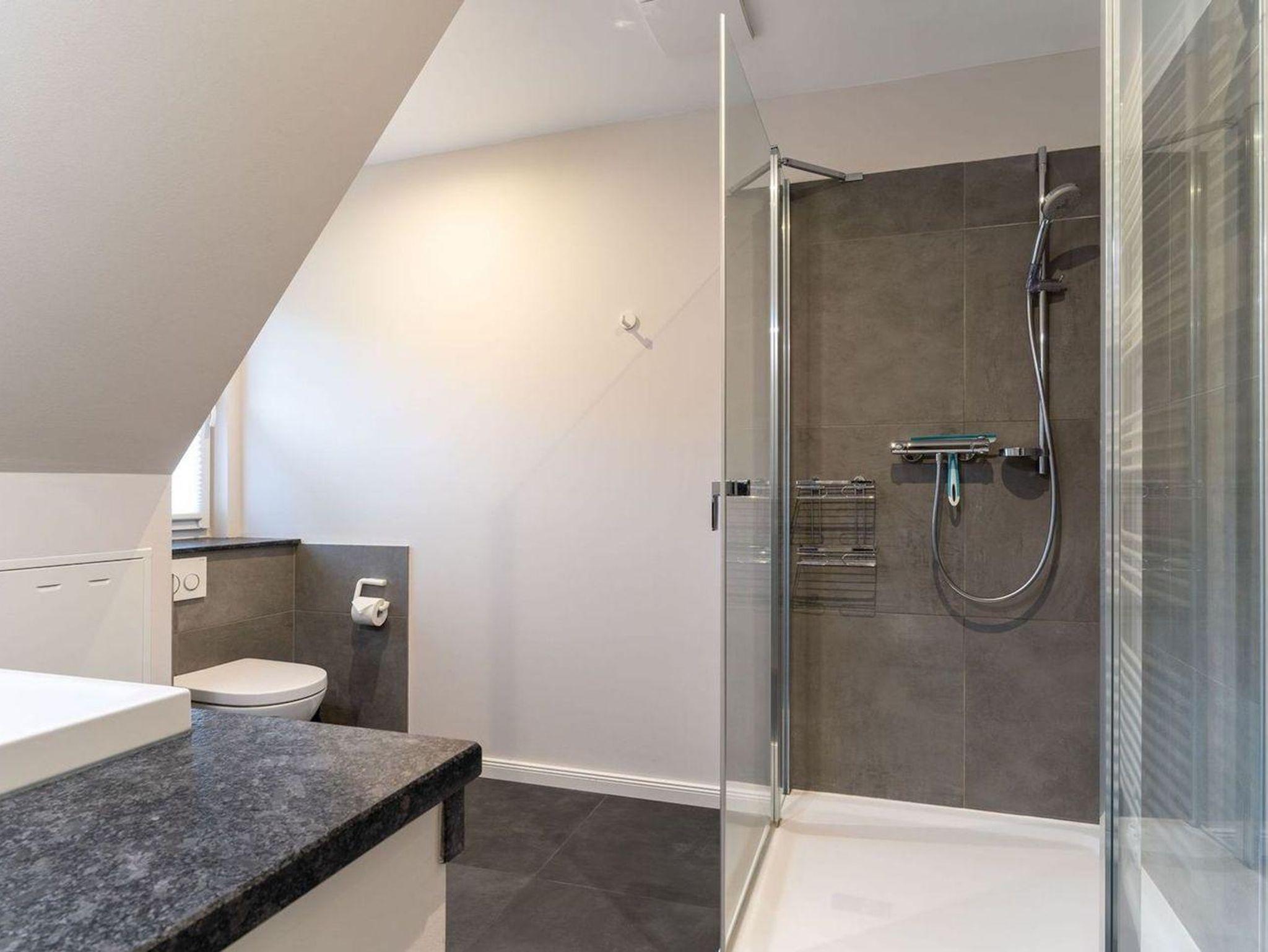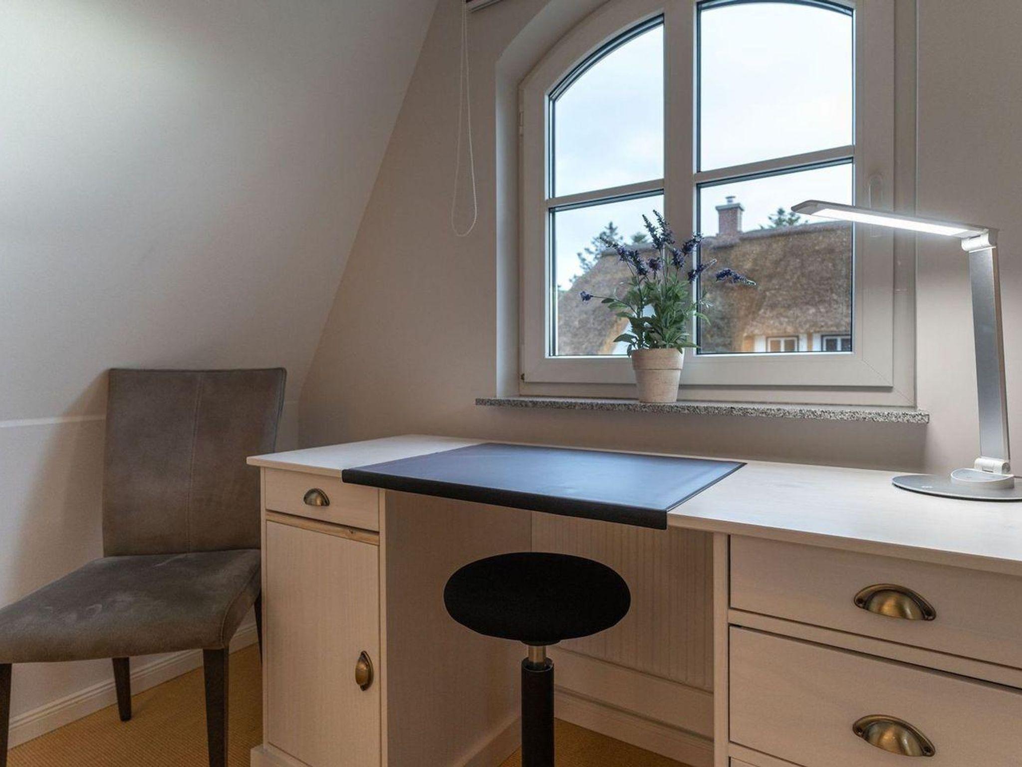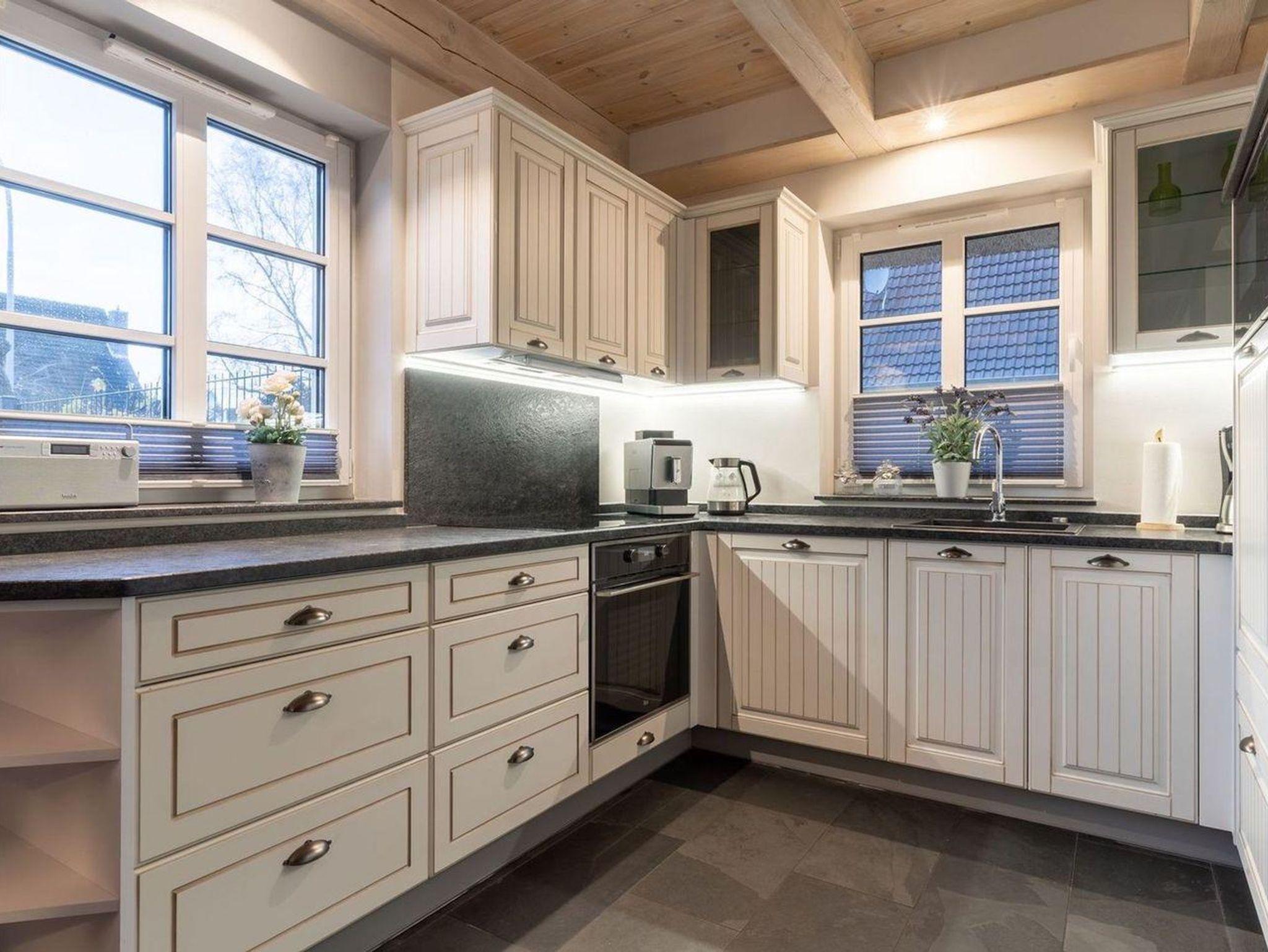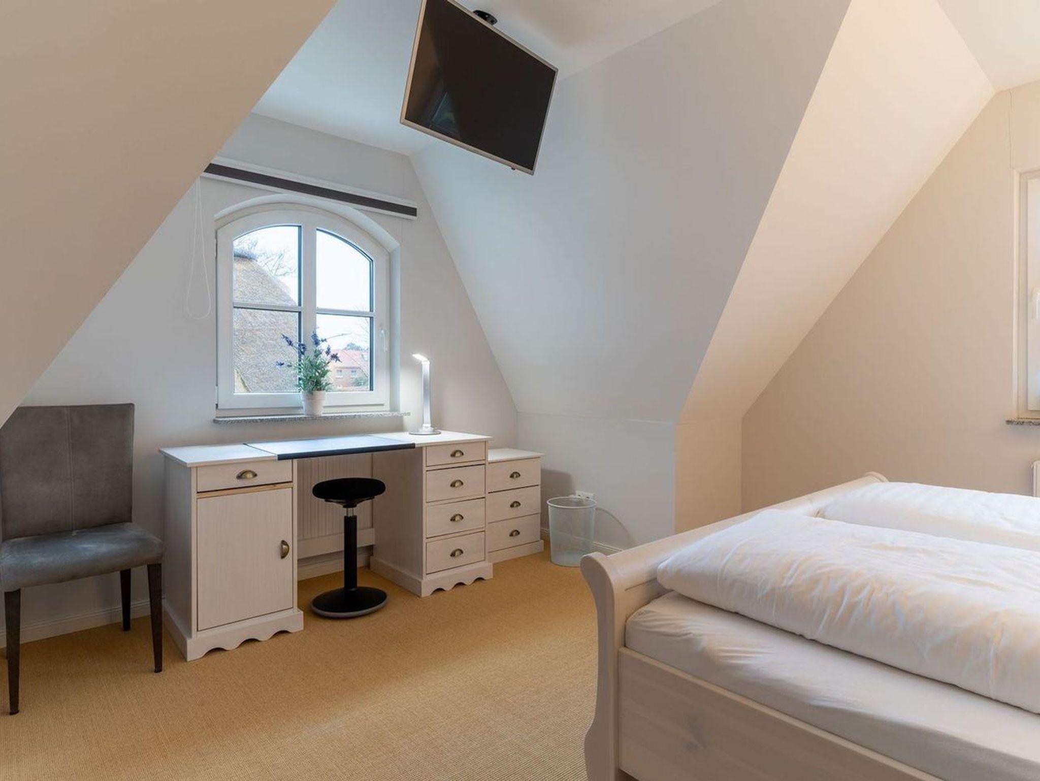 Die wunderschöne Haushälfte unter Reet verfügt über ca. 130 m² und bietet Platz für 1-6 Personen.Im Erdgeschoss befindet sich der lichtdurchflutete Wohnraum mit TV, Kamin, einer offenen Küche sowie einem stilvollen Essbereich.Die Küche ist ausgestattet mit Backofen und Geschirrspüler, sowie einem Esperto-Caffè-Automat, Toaster, Wasserkocher und den üblichen Küchenutensilien.An den Wohnbereich schließen sich ein Flur, ein Duschbad und ein Doppelschlafzimmer an.Das Erdgeschoss ist rollstuhlfreundlich.Über eine Holztreppe gelangt man in das Obergeschoss. Die beiden Schlafzimmer, jeweils mit einem Doppelbett sorgen für ruhevolle Erholung.Im ersten Stock befindet sich ausserdem ein weiteres Duschbad sowie eine Sauna.