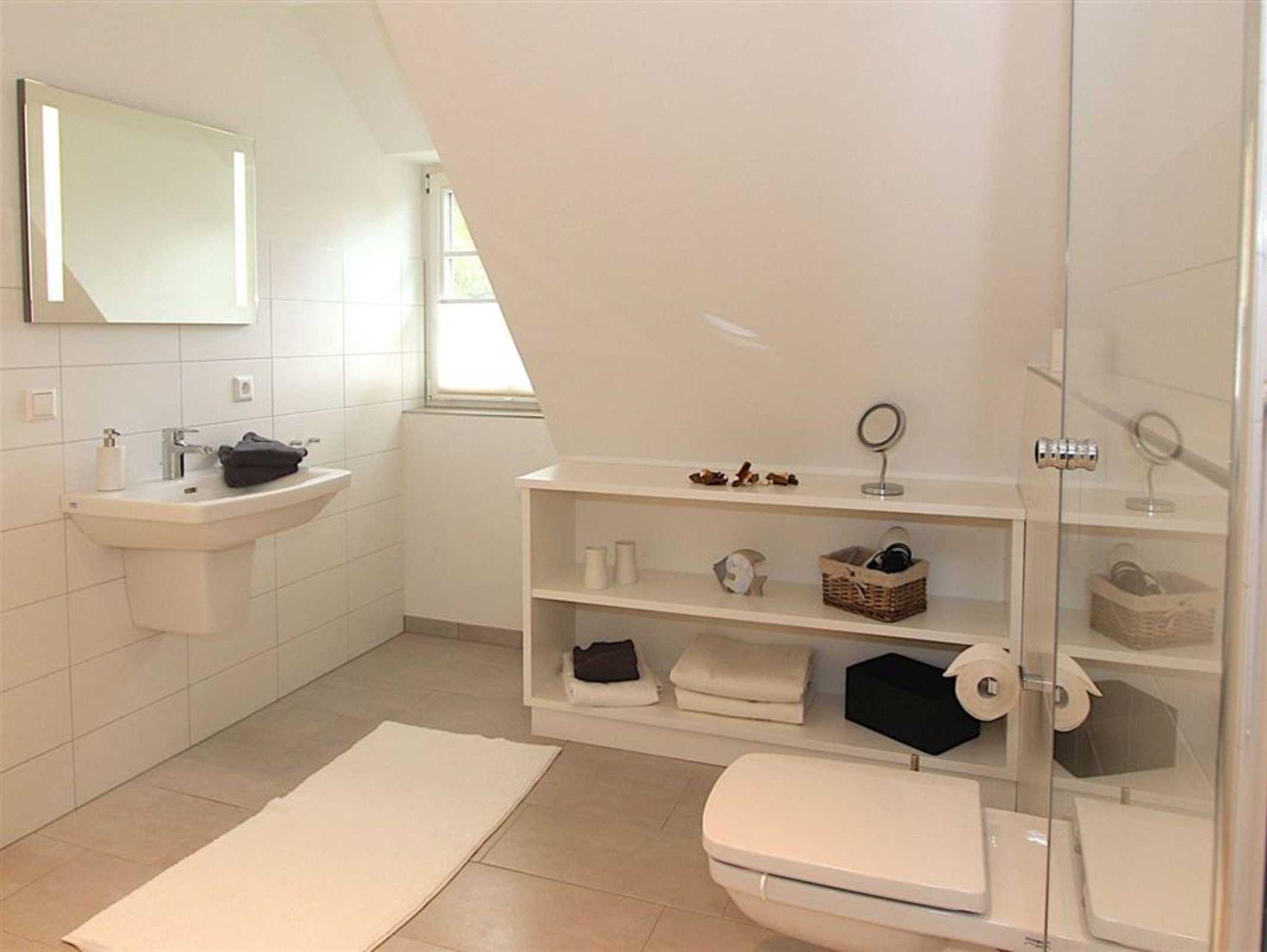 2. Badezimmer mit Dusche (niedriger Eintritt: ca. 15 cm), WC, Föhn und Tageslicht.