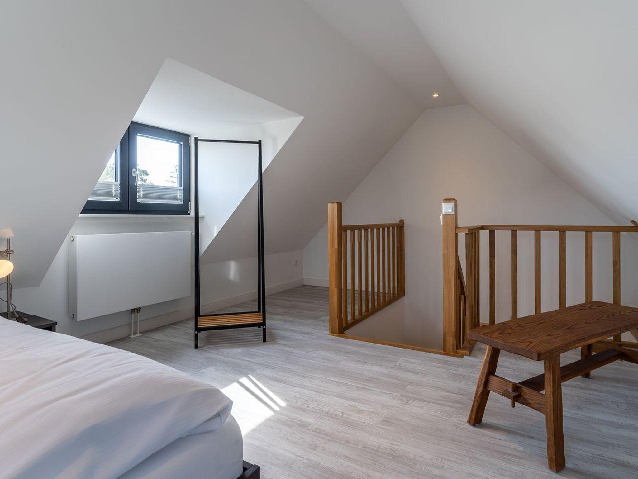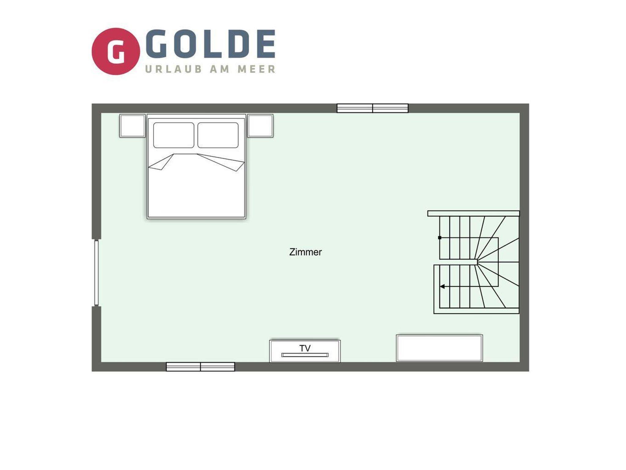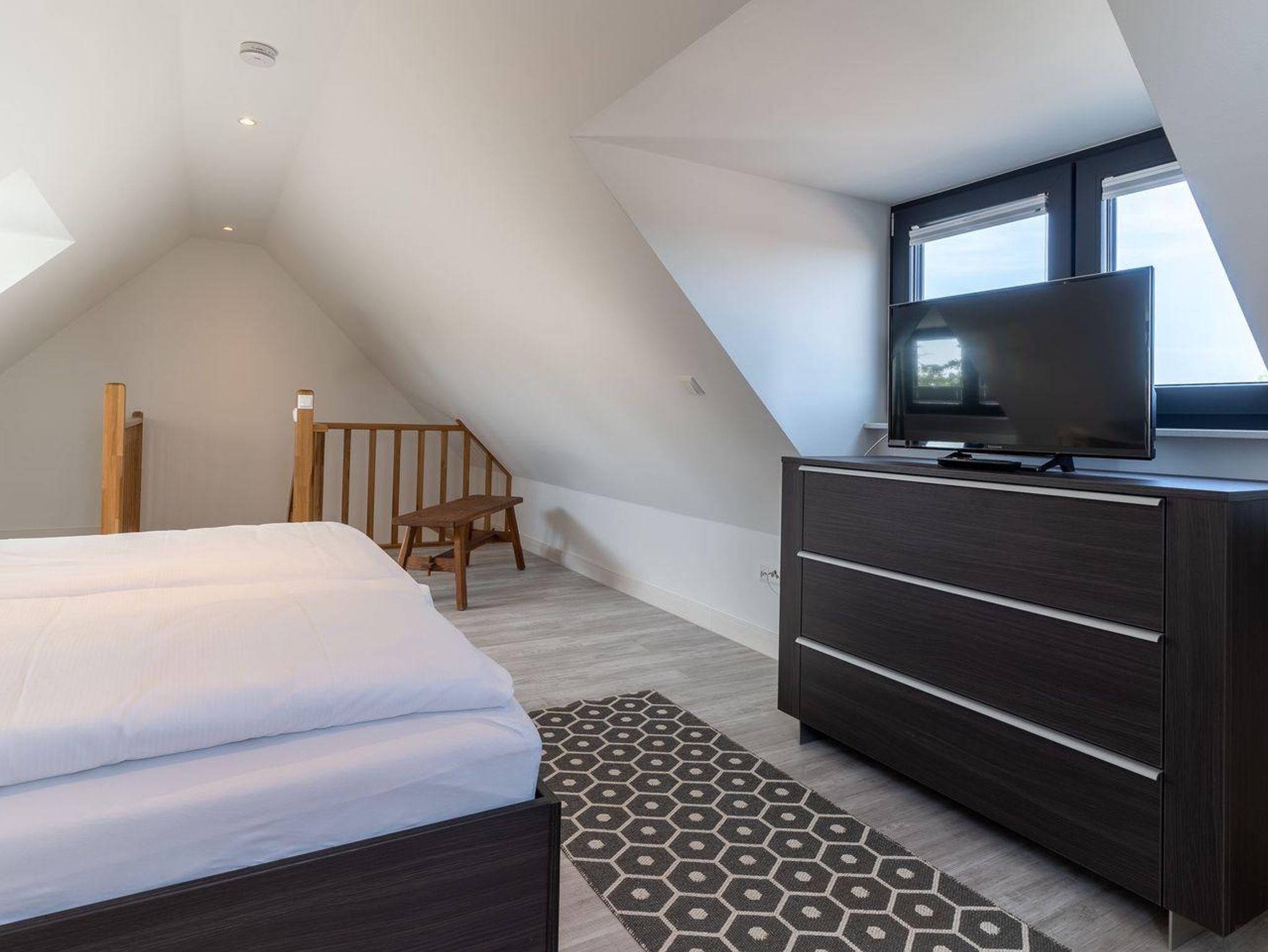 Das Schlafzimmer mit einem 160er Doppelbett und LCD-Flach-TV sorgt für ruhevolle Erholung und ist über eine Treppe vom Wohnraum zu erreichen.