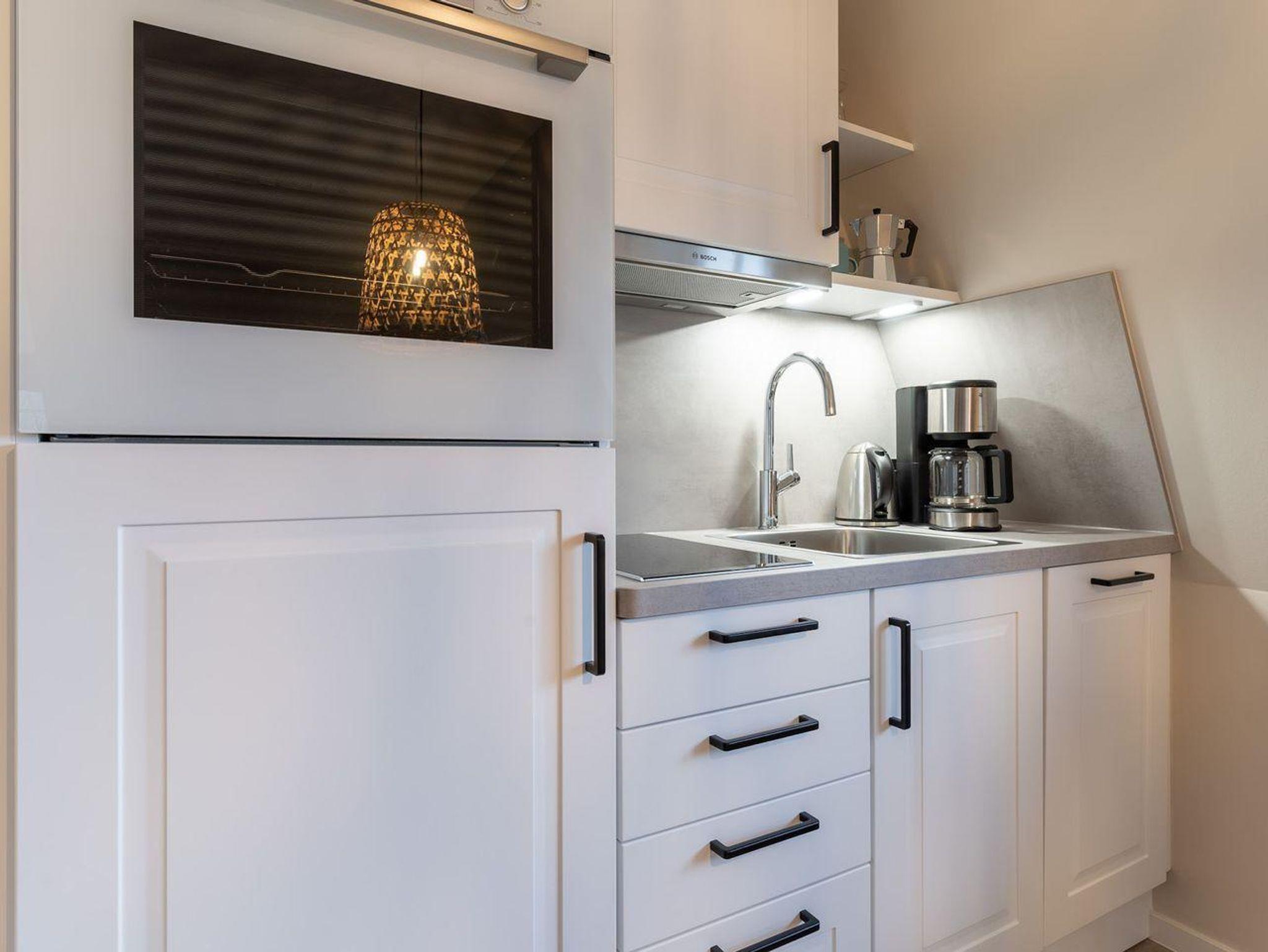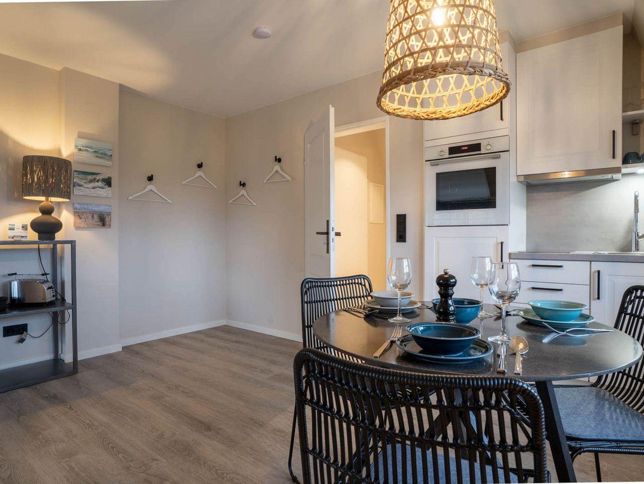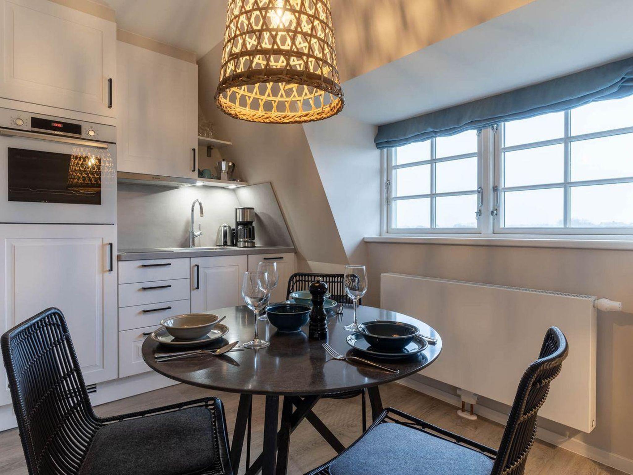 Der lichtdurchflutete Wohnraum mit einer offenen Wohnküche und einem gemütlichen Essbereich bietet jeden Komfort. Eine Kochnische mit einer umfangreich ausgestatteten Pantryküche fügt sich passend ein und hat mit einem Herd (2 Kochfelder), Spülmaschine, Espressokocher, Kühlschrank samt Gefriermöglichkeit usw. so einiges zu bieten. Am Esstisch lässt es sich mit frischen Brötchen vom nahegelegenen Bäcker wunderbar in den Urlaubstag starten. Der Blick durch die Fenster in die gepflegte Grünanlage ist einfach herrlich und lockt nach draußen.