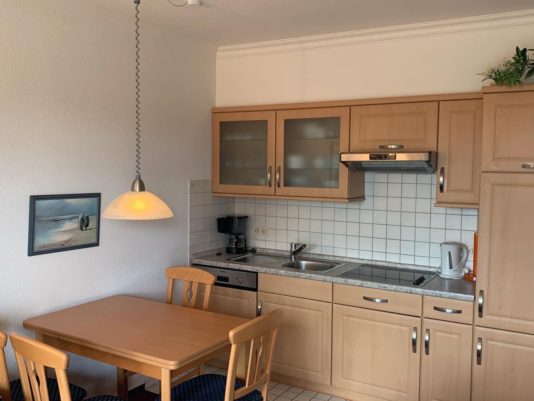 Die geschmackvolle, gemütliche 2-Zimmer-Ferienwohnung Atlantis Nr. 06 im 2. Obergeschoss besitzt eine gut ausgestattete, neue Küchenzeile mit Cerankochfeld. Schlaf finden Sie mit bis zu 4 Personen in den Einzelbetten im separaten Schlafzimmer und in den Einzelschrankbetten im Wohnzimmer. Der Balkon in Westlage bietet durch die Bäume einen kleinen Meeresblick.