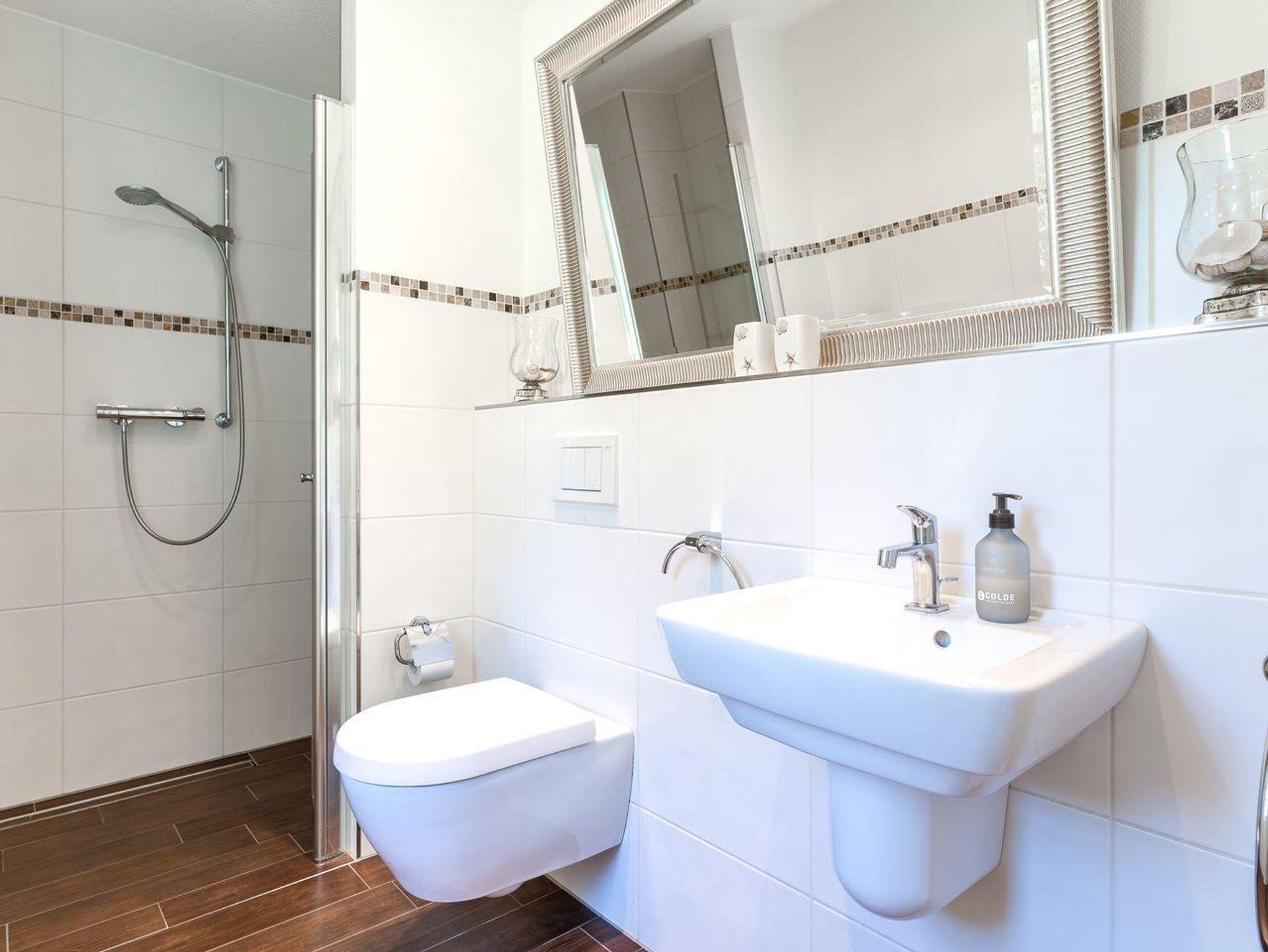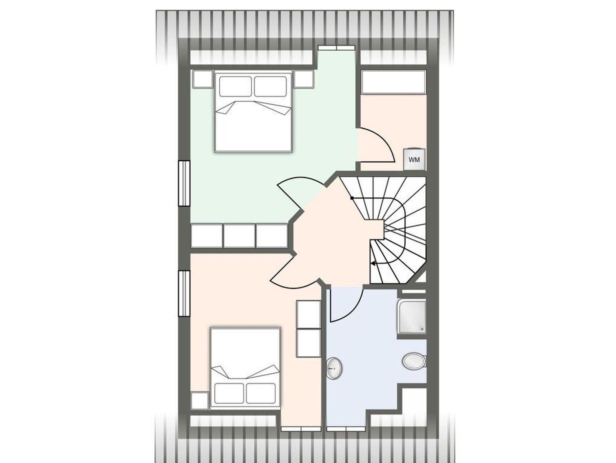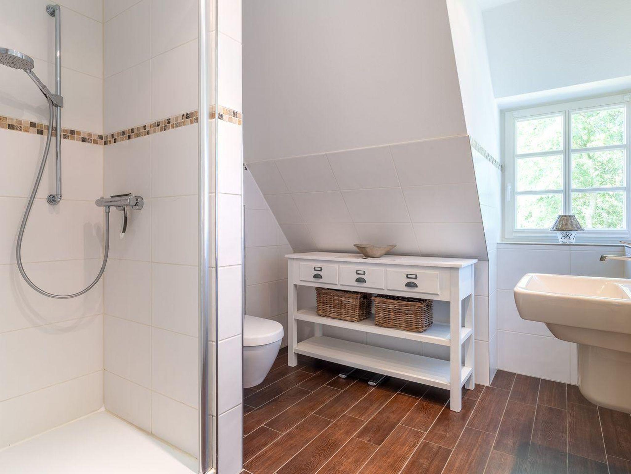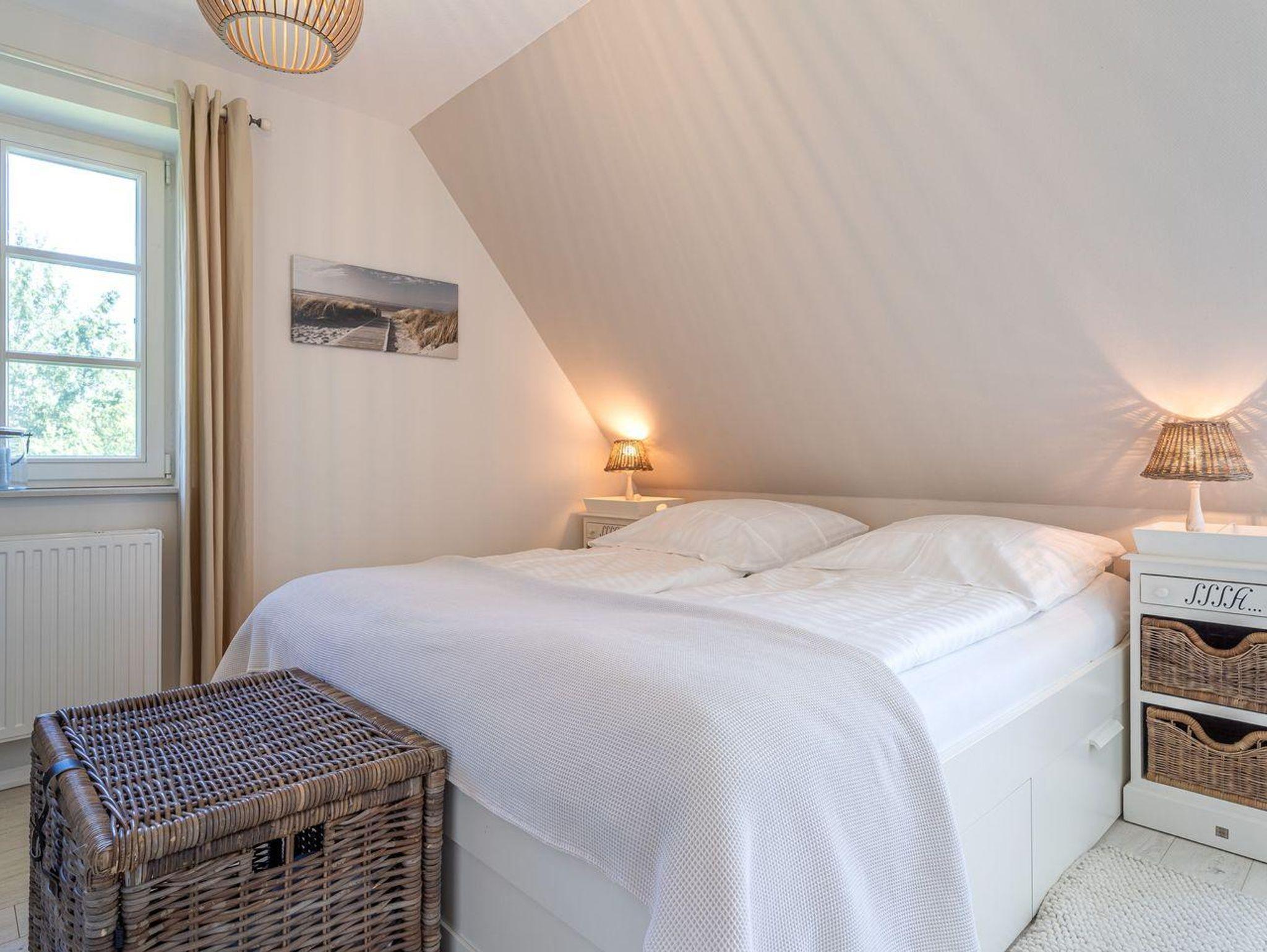 Über eine Holztreppe gelangt man in das Obergeschoss. Die beiden Schlafzimmer, jeweils mit einem Doppelbett sorgen für ruhevolle Erholung. Darüber hinaus befindet sich im Obergeschoss ein weiteres, geräumiges Bad mit einer Dusche.