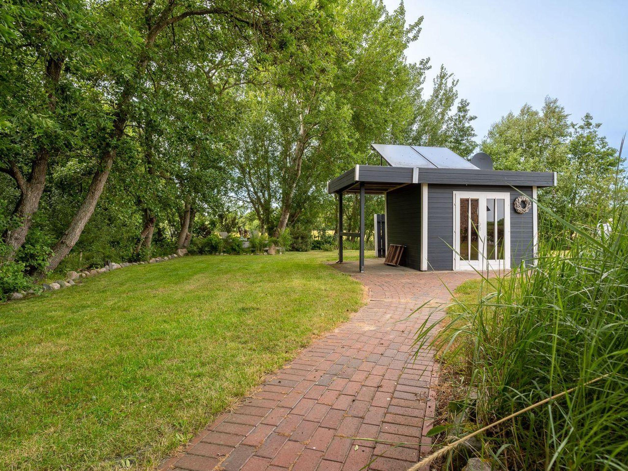 Das Grundstück mit Stellplatz, Rasenfläche und einer sonnigen Terrasse ist mit heimischen Pflanzen angelegt und bietet Ihnen einen traumhaften Weitblick über die Felder. Gartenmöbel und ein Strandkorb laden Sie zur Erholung ein.