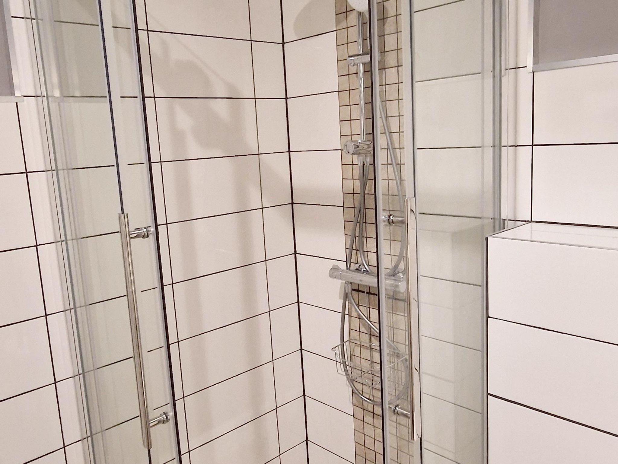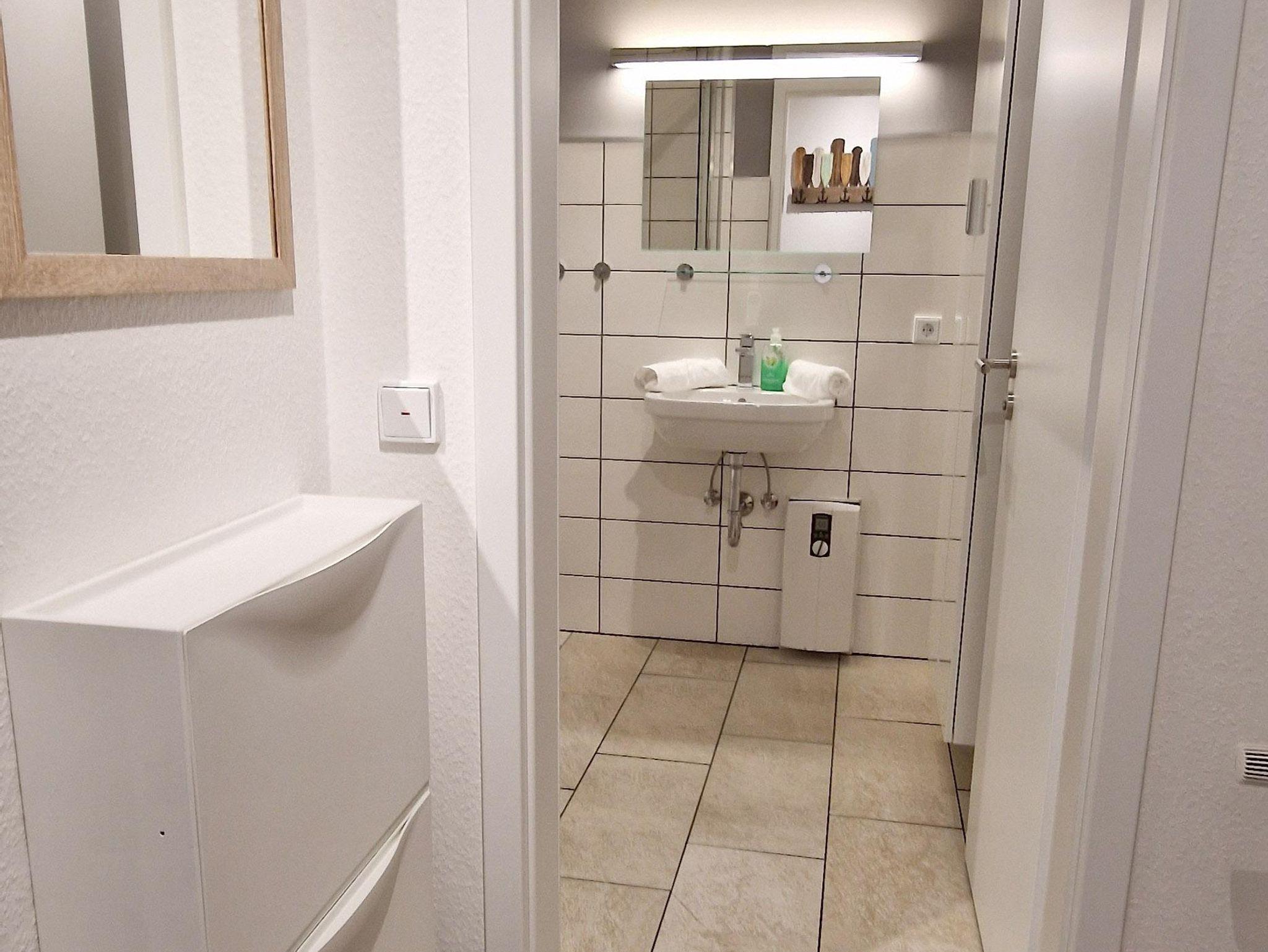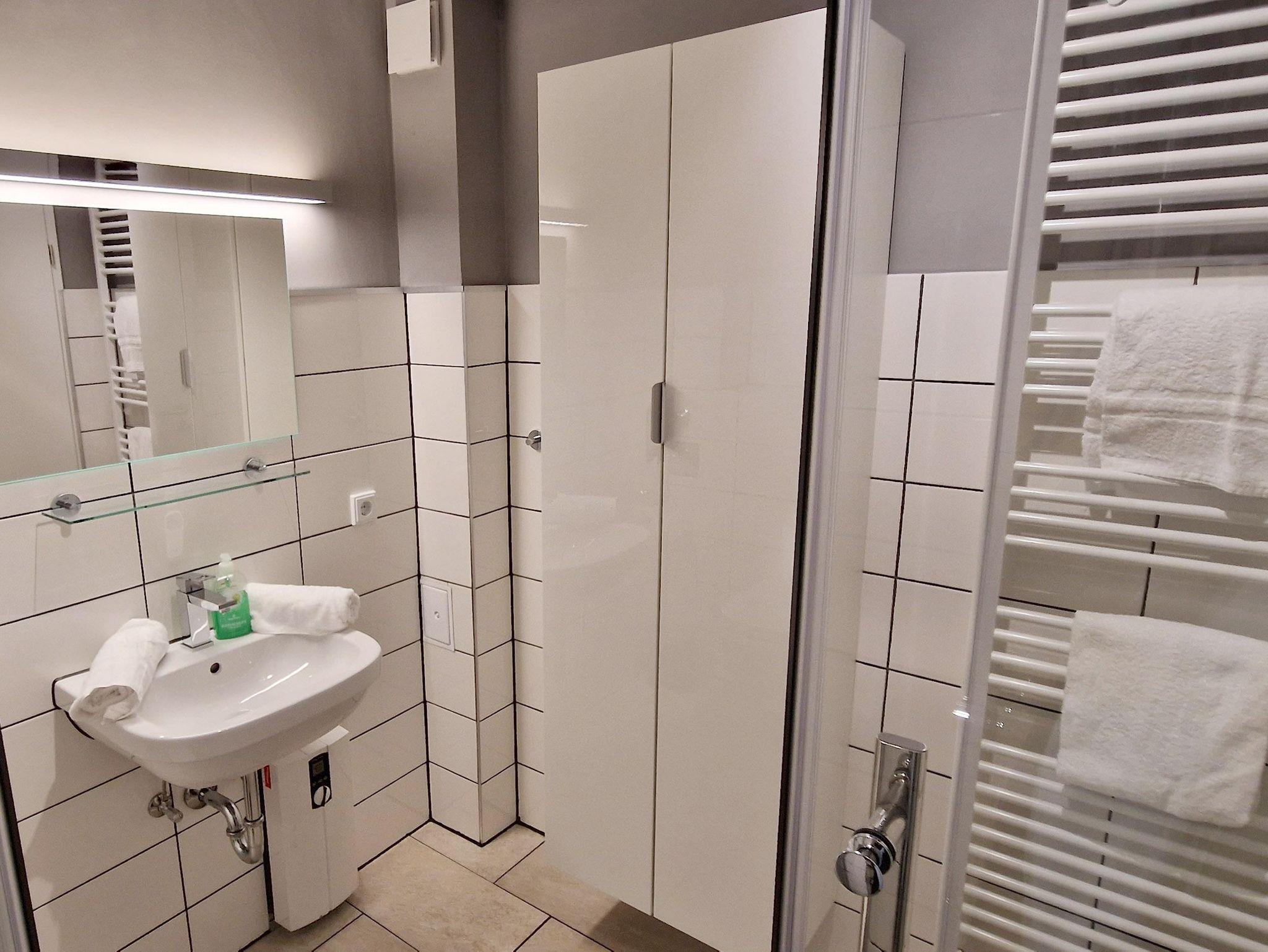 Bad: Dusche befahrbar, Waschbecken, WC, Schrank, Hocker, Staubsauger