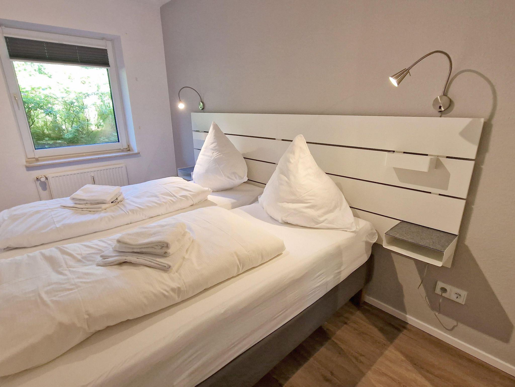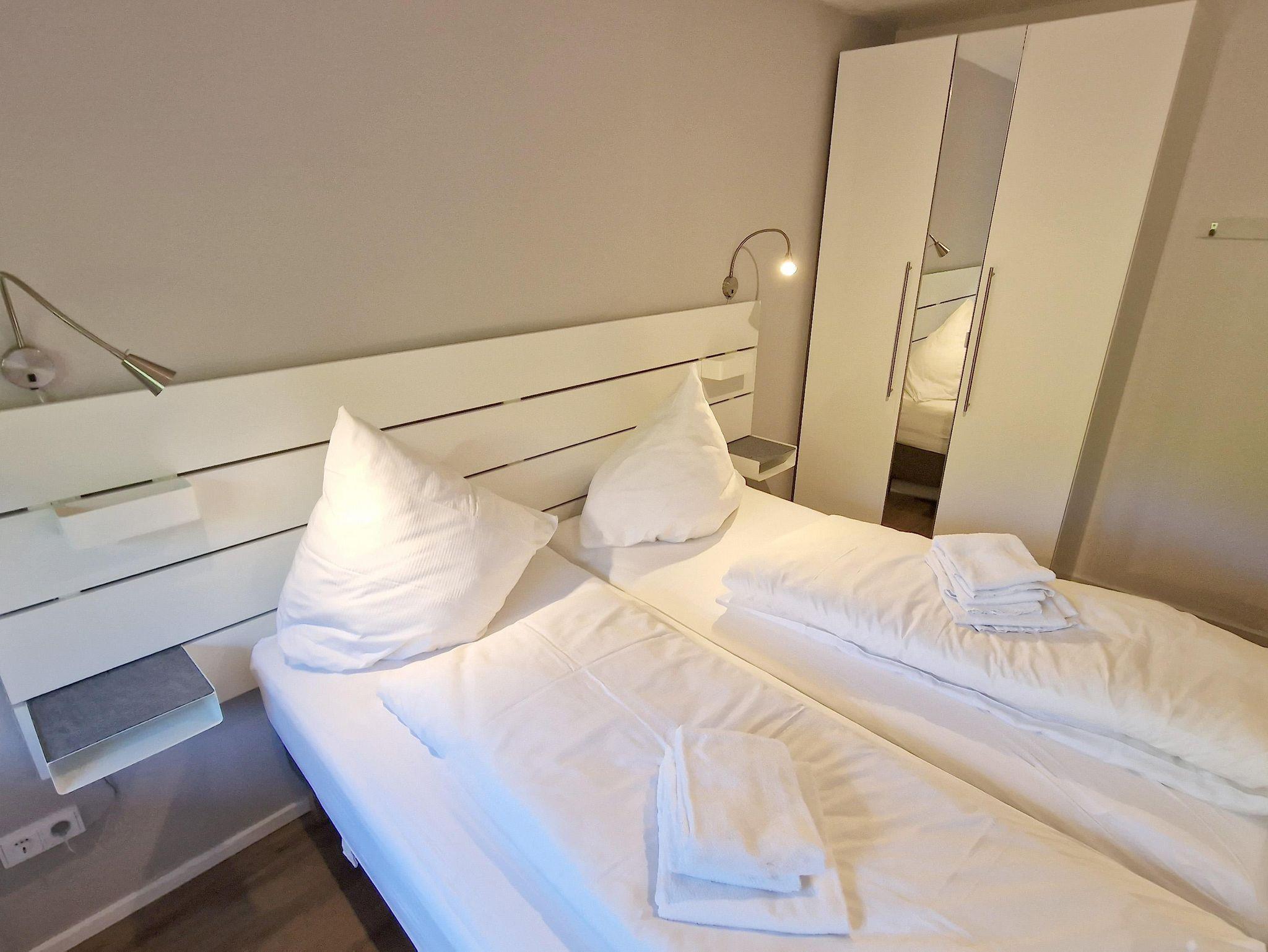 Schlafzimmer: Doppelbett, Nachttisch, Kommode, Schrank, Stuhl