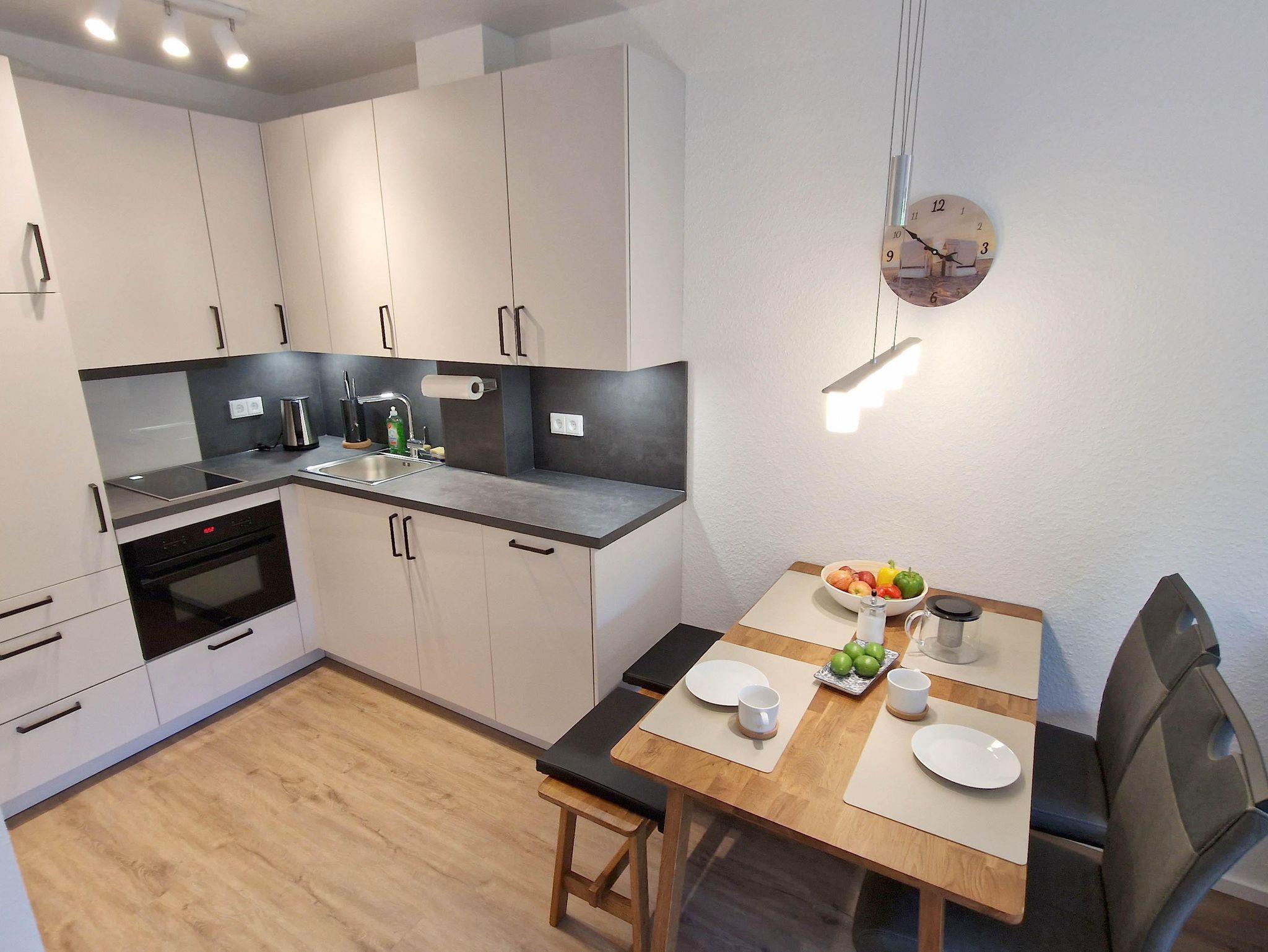 Küche: Einbauküche, 4 Plattenherd mit Backofen, Dunstabzugshaube, Kühlschrank, Kaffeemaschine, Wasserkocher, Toaster, Geschirr, Kochtöpfe