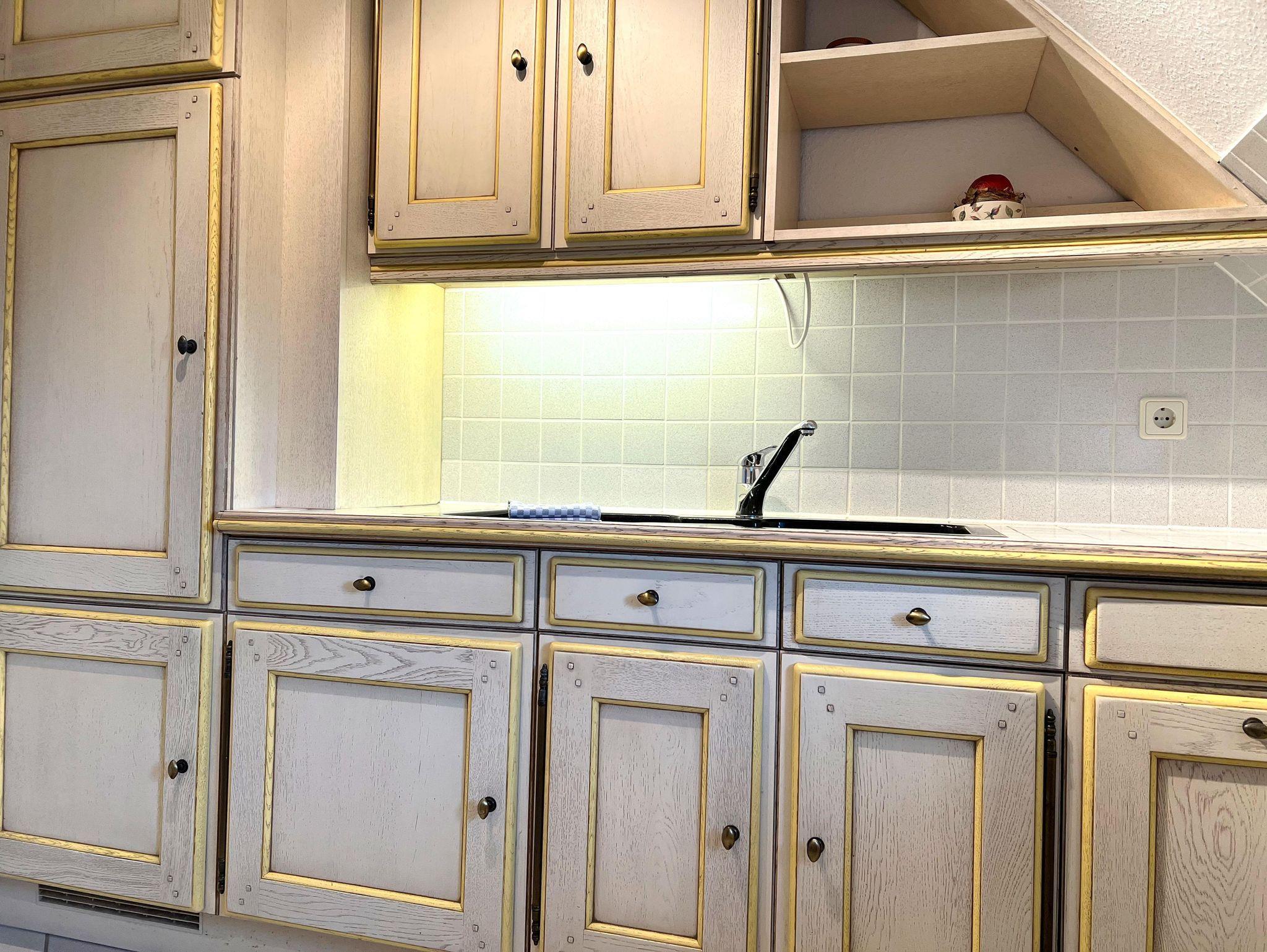 Küche: Einbauküche, 4 Plattenherd mit Ceranfeld und Backofen, Dunstabzugshaube, Kühlschrank, Spülmaschine, Kaffeemaschine, Wasserkocher, Toaster, Handmixer, Geschirr, Kochtöpfe