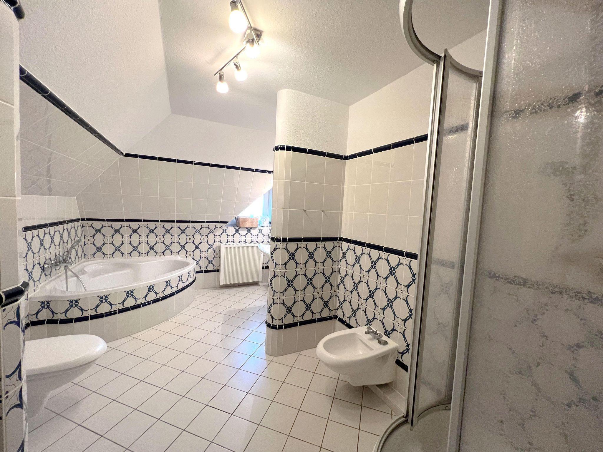 Bad: Eckbadewanne, Dusche, Bidet, WC, Schränkchen, Duschkabine