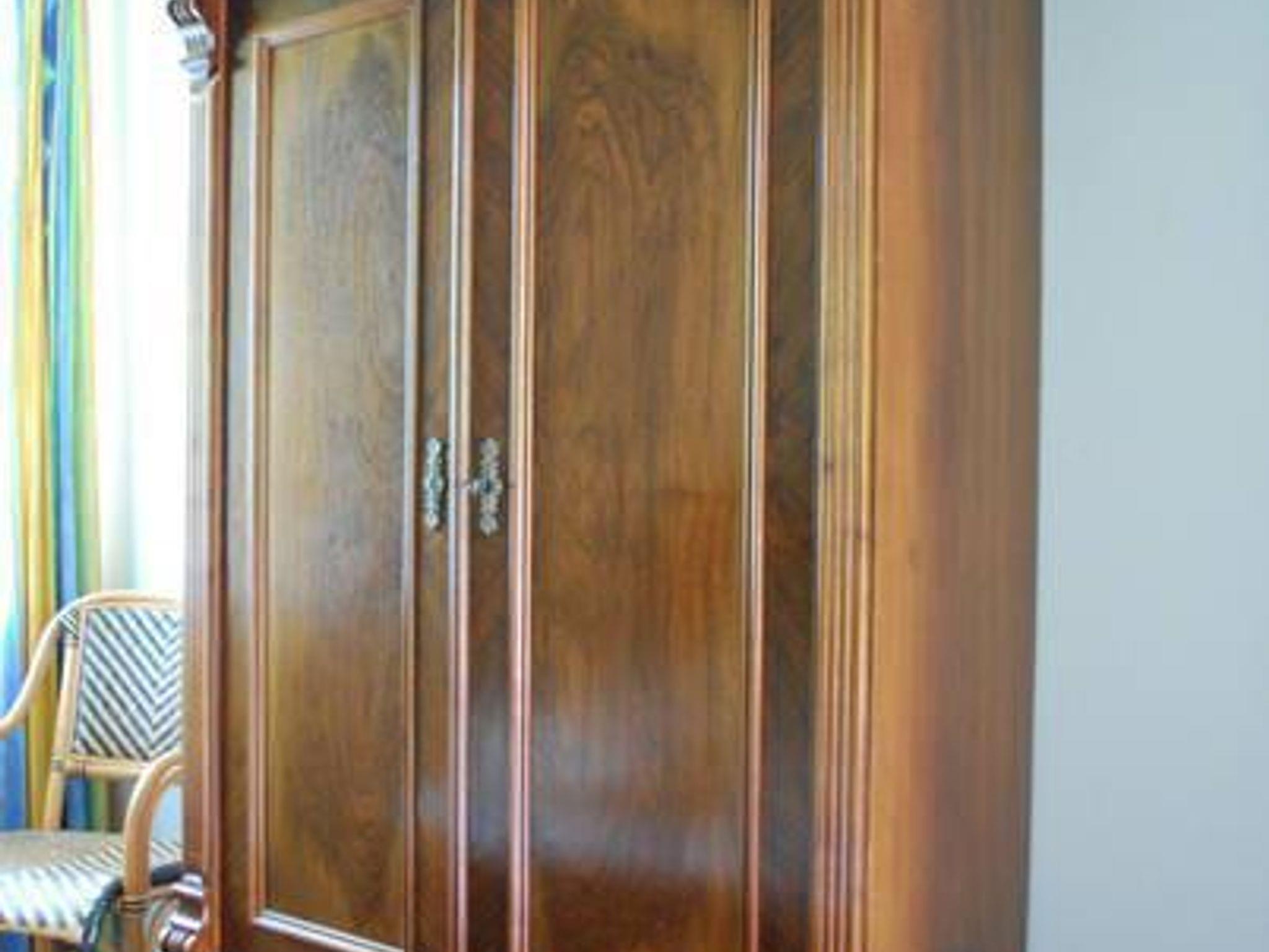 mit Glastisch. Das Schlafzimmer verfügt über ein Doppelbett (1,8 x 2,0 m) aus massivem Kirchholz, zwei Nachttischchen und einem antiken Kleiderschrank (Nussbaum). Gegenüber der Eingangstür liegt das Duschbad (mit Föhn und Außenfenster).