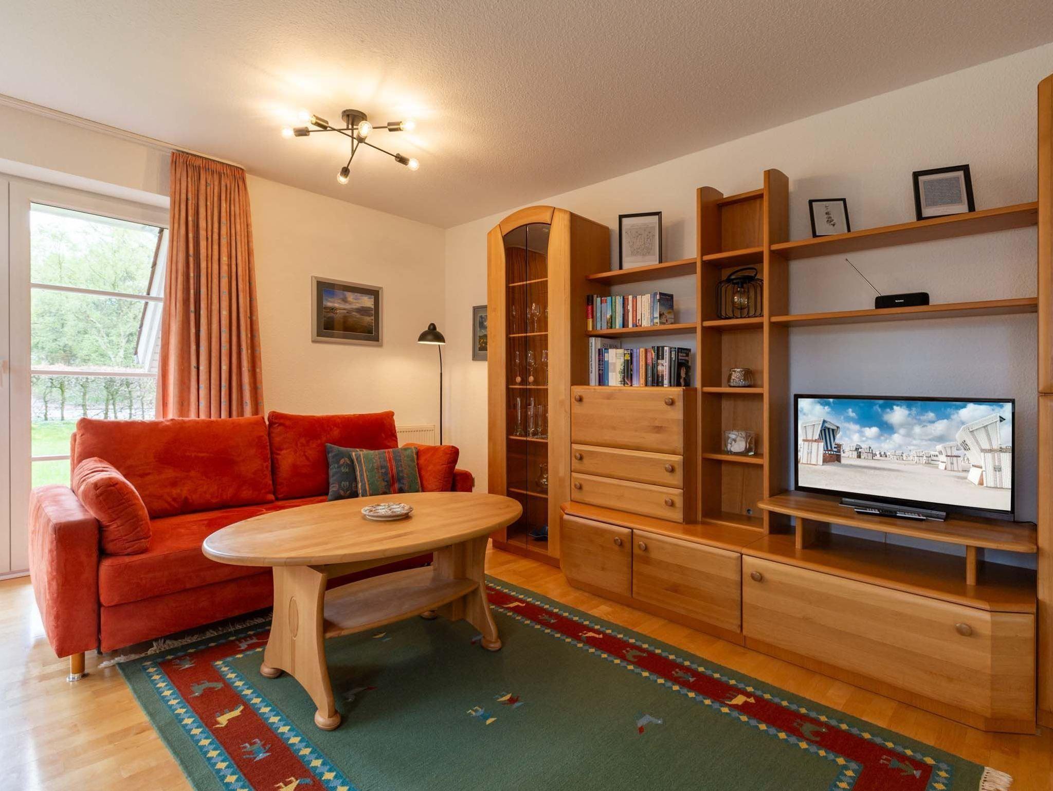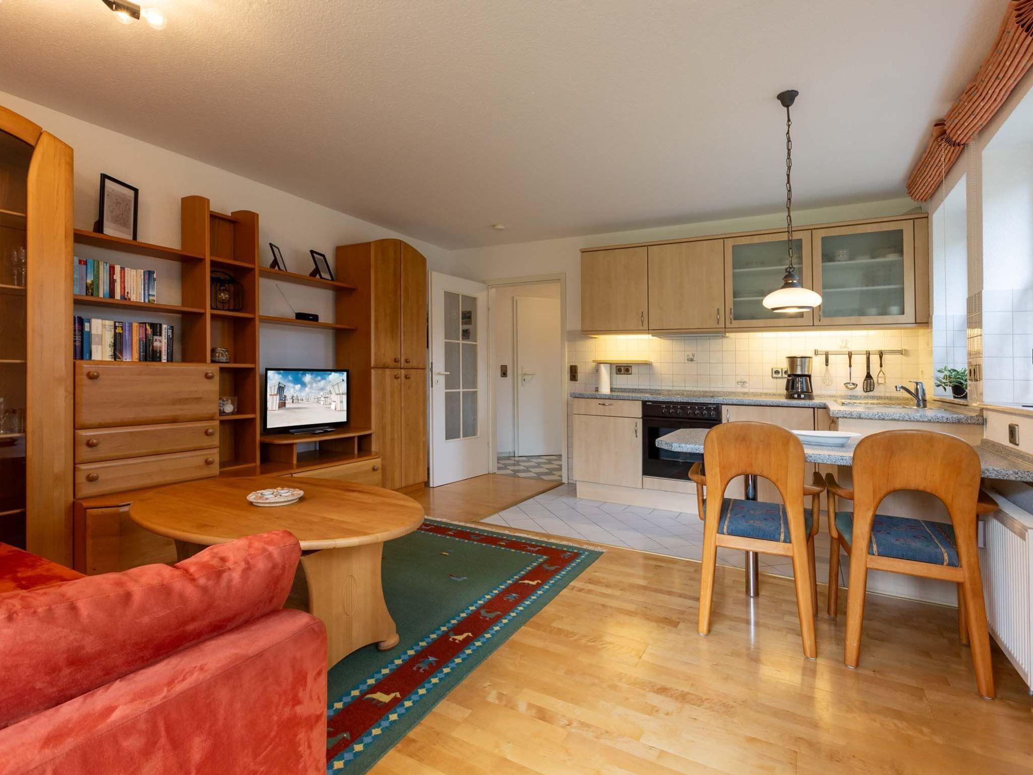 Wohnzimmer mit ausziehbarem (Schlaf-) Sofa (160x200cm), Sessel, SMART-TV (Sat) und Esstisch für 2 Personen. Direkter Zugang zur möblierten Südterrasse. Offene Küche mit Backofen, Geschirrspüler und Kühlschrank mit Gefrierfach.