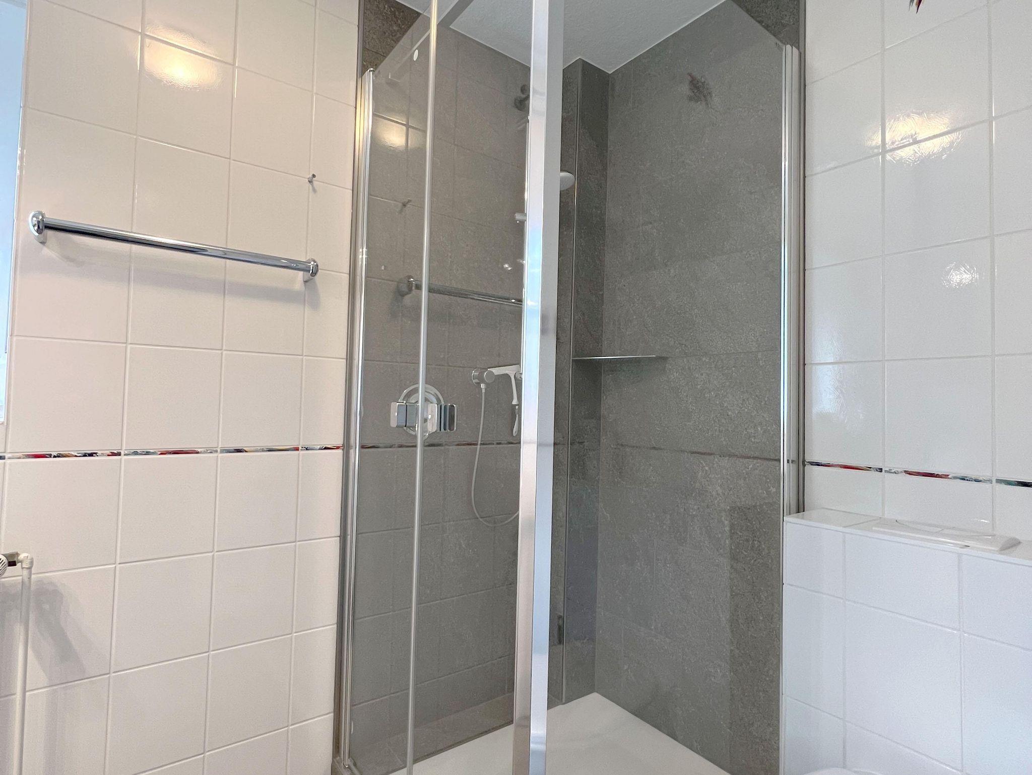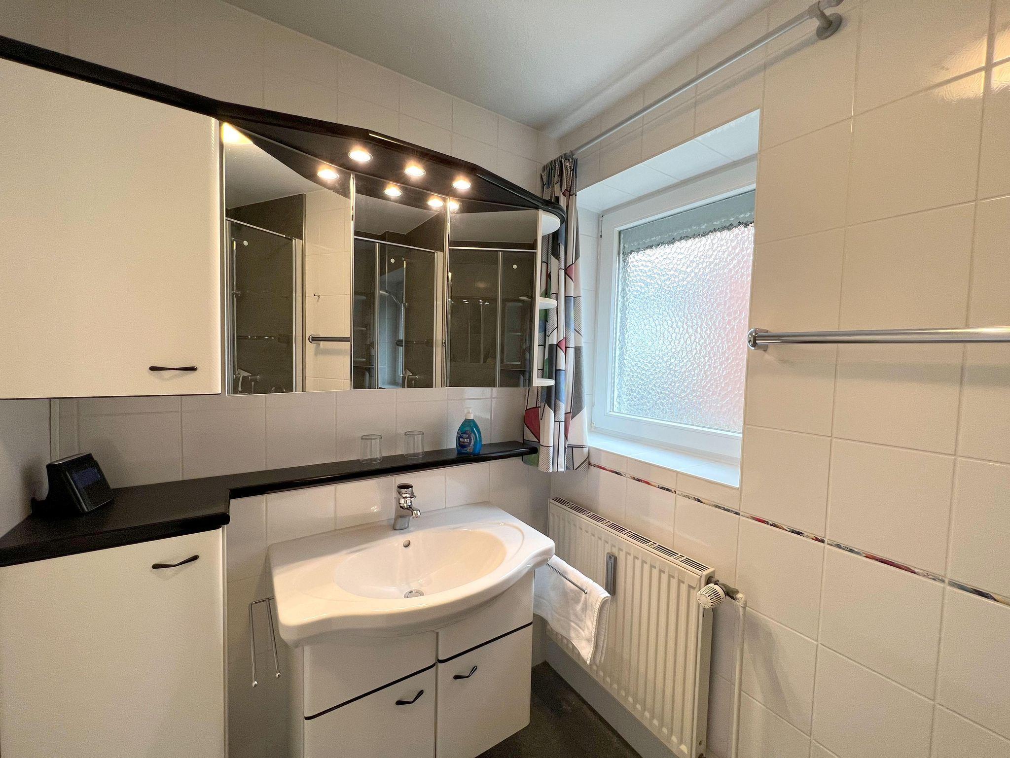 Bad: Dusche, Waschtisch, Spiegelschrank, WC, Fön, Radio, Duschkabine