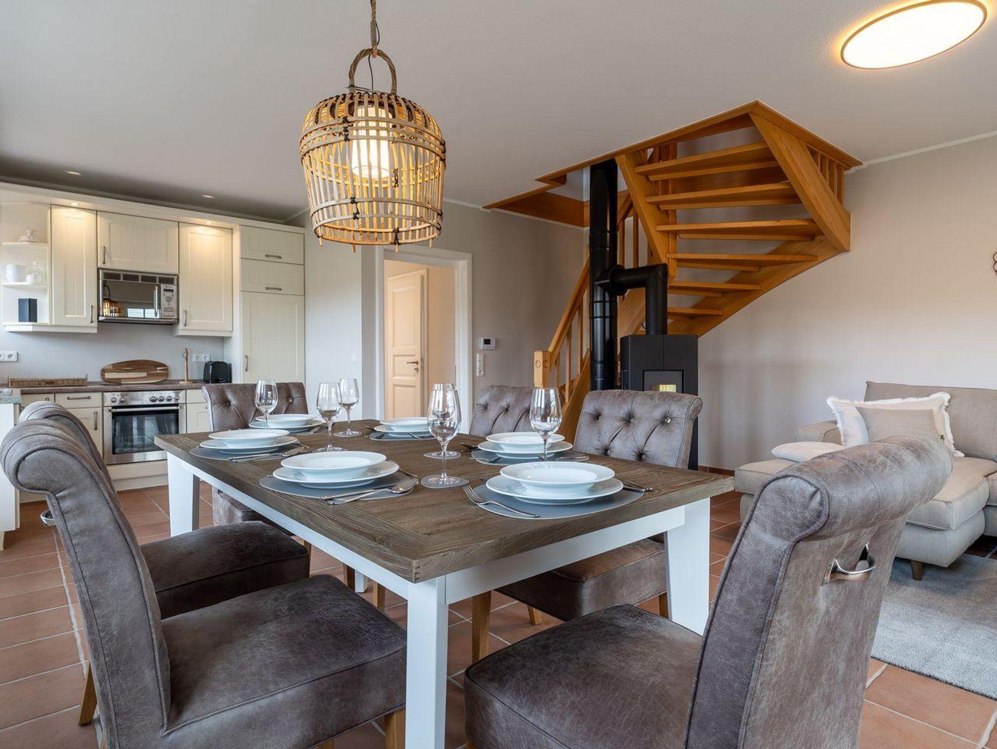 Die Unterkunft erstreckt sich über drei Etagen und bietet Ihnen eine moderne Gestaltung sowie zahlreiche Annehmlichkeiten, die Ihren Aufenthalt so komfortabel wie möglich gestalten. Im Erdgeschoss finden Sie den lichtdurchfluteten Wohnbereich, der offener zur voll ausgestatteten Küche gestaltet ist. Hier können Sie gemeinsam kochen und den Aufenthalt genießen. Die Küche verfügt über viele hilfreiche Utensilien einschließlich eines Ceranherds, Backofens, Mikrowelle und Kühlschrank mit Gefrierfach, sodass Sie hier alles Nötige finden, um Ihre Lieblingsgerichte zuzubereiten.