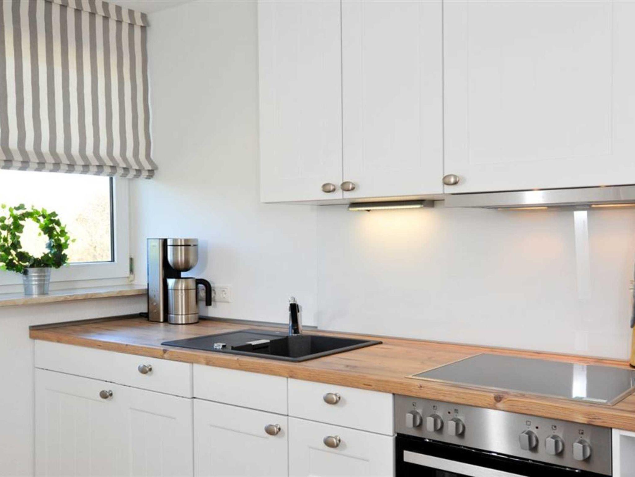 Wohnzimmer mit Sofa (2er), TV (Sat), DVD-Player und Esstisch mit 2 Sesseln und gemütlicher Sitzbank für 2-3 Personen. Direkter Zugang zum möblierten und windgeschützten Balkon nach Südwesten. Offene Küche mit Backofen, Mikrowelle, Geschirrspüler und Kühlschrank mit Gefrierfach.