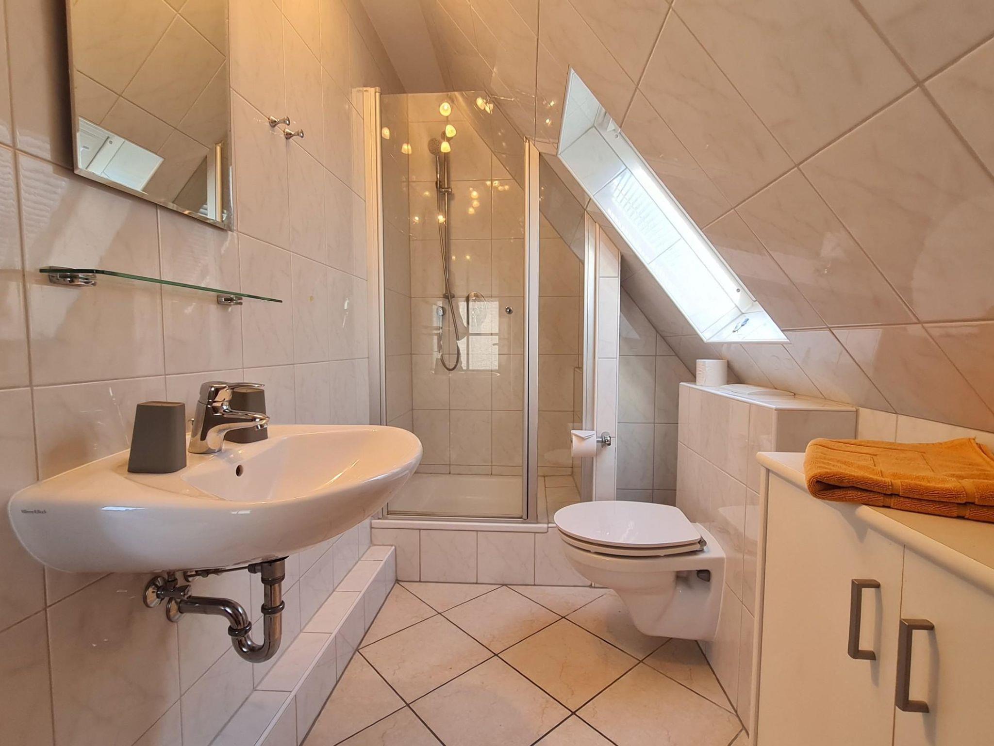 • Badezimmer: Modernes Bad mit Dusche und WC.