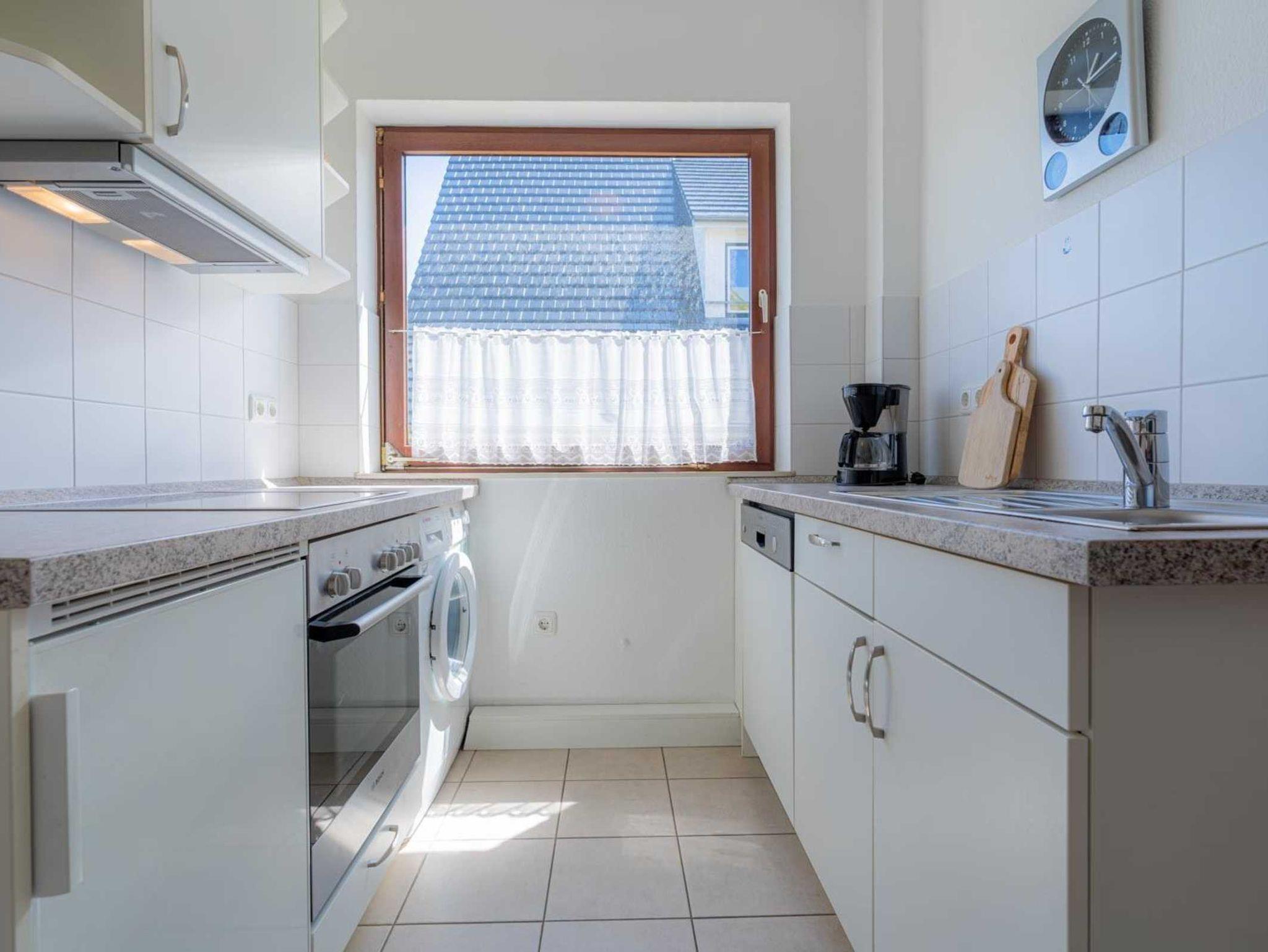 Separate Küche mit Backofen, Mikrowelle, Geschirrspüler, Kühlschrank mit Gefrierfach und Waschmaschine.