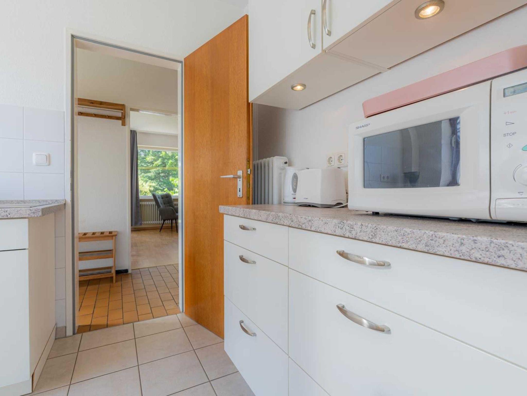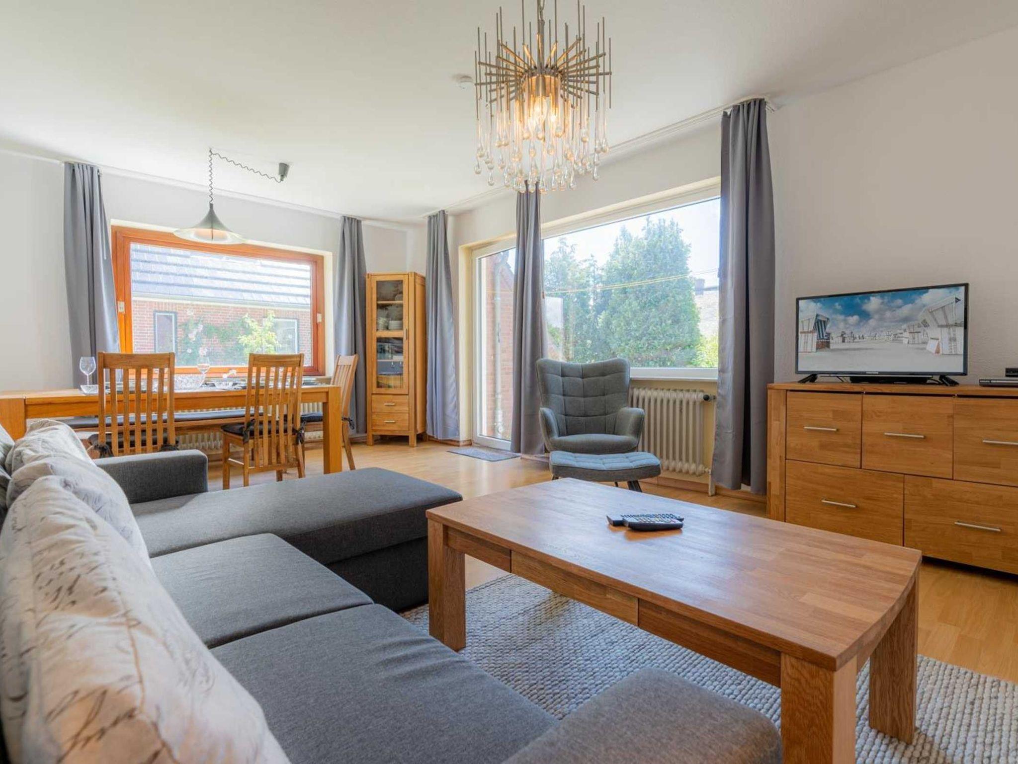 Wohnzimmer mit (ausziehbarem Schlaf-) Sofa (140x200cm), einem Sessel, kleinem TV (SAT), DVD-Player und Radio. Essbereich mit Esstisch mit 3 Stühlen und gemütlicher Eckbank für 2-3 Personen. Direkter Zugang zur möblierten sonnigen Gartenterrasse nach Südwesten.